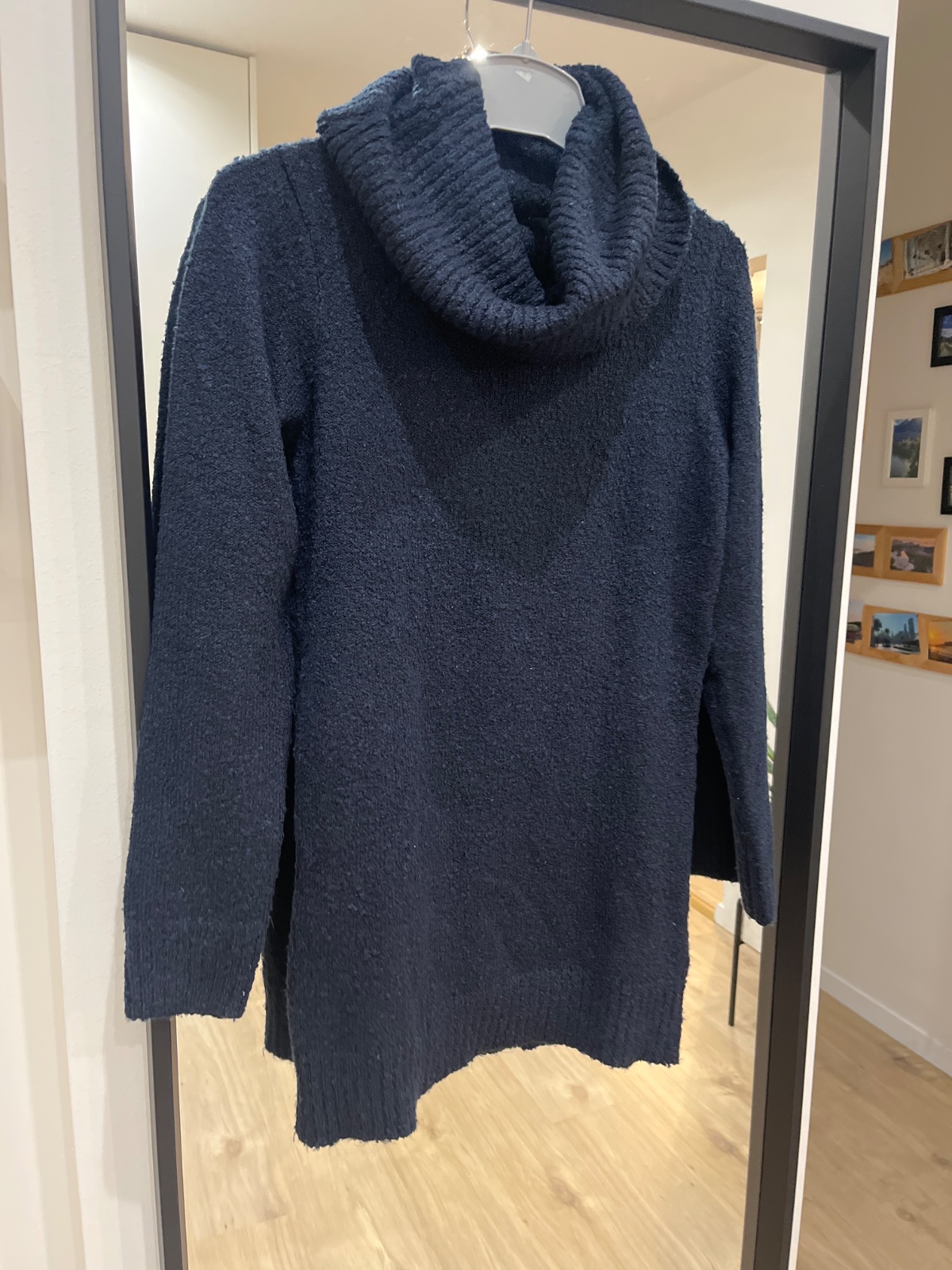 Tmavomodrý dlhší a hrubši rolákový sveter.