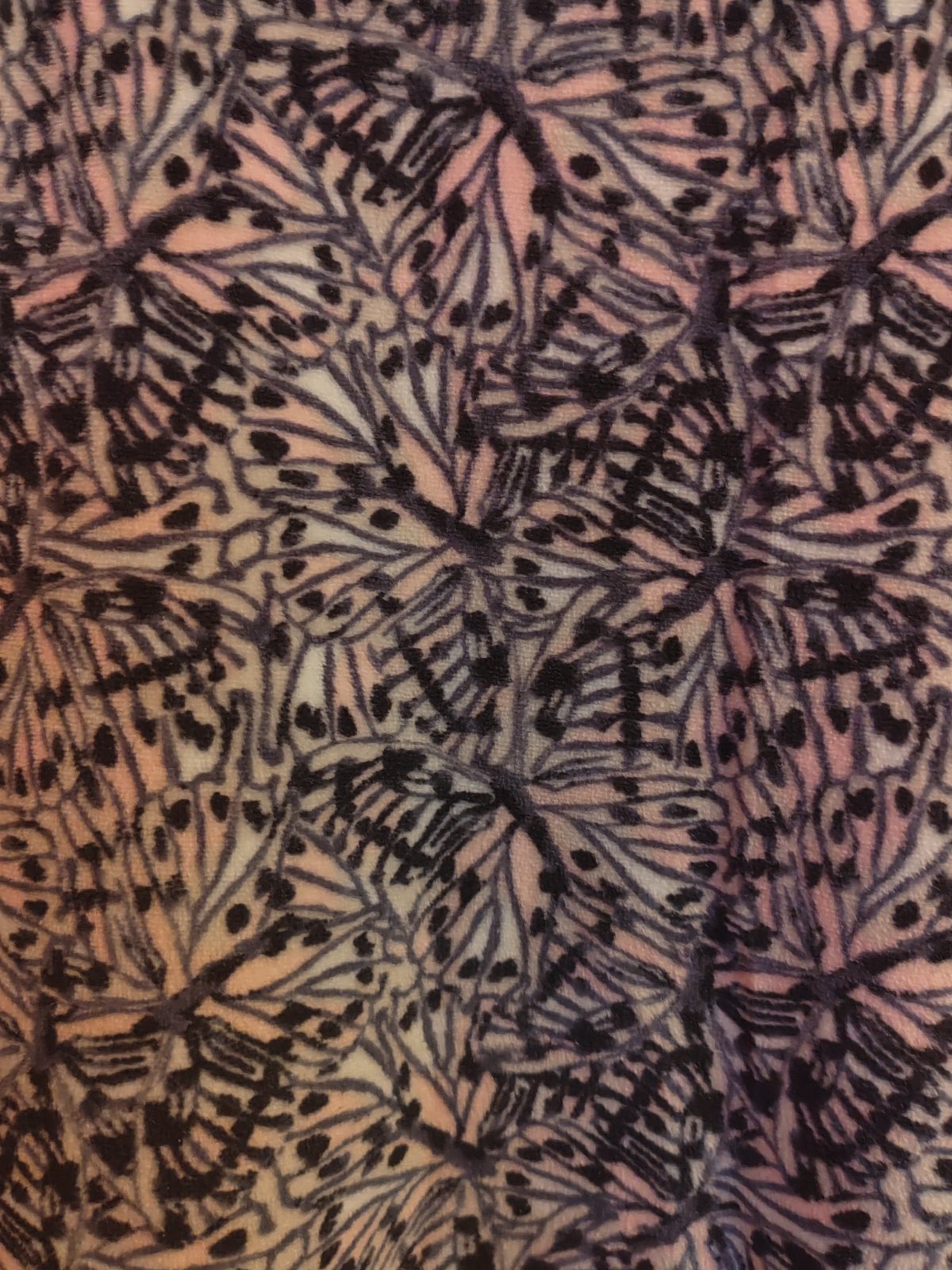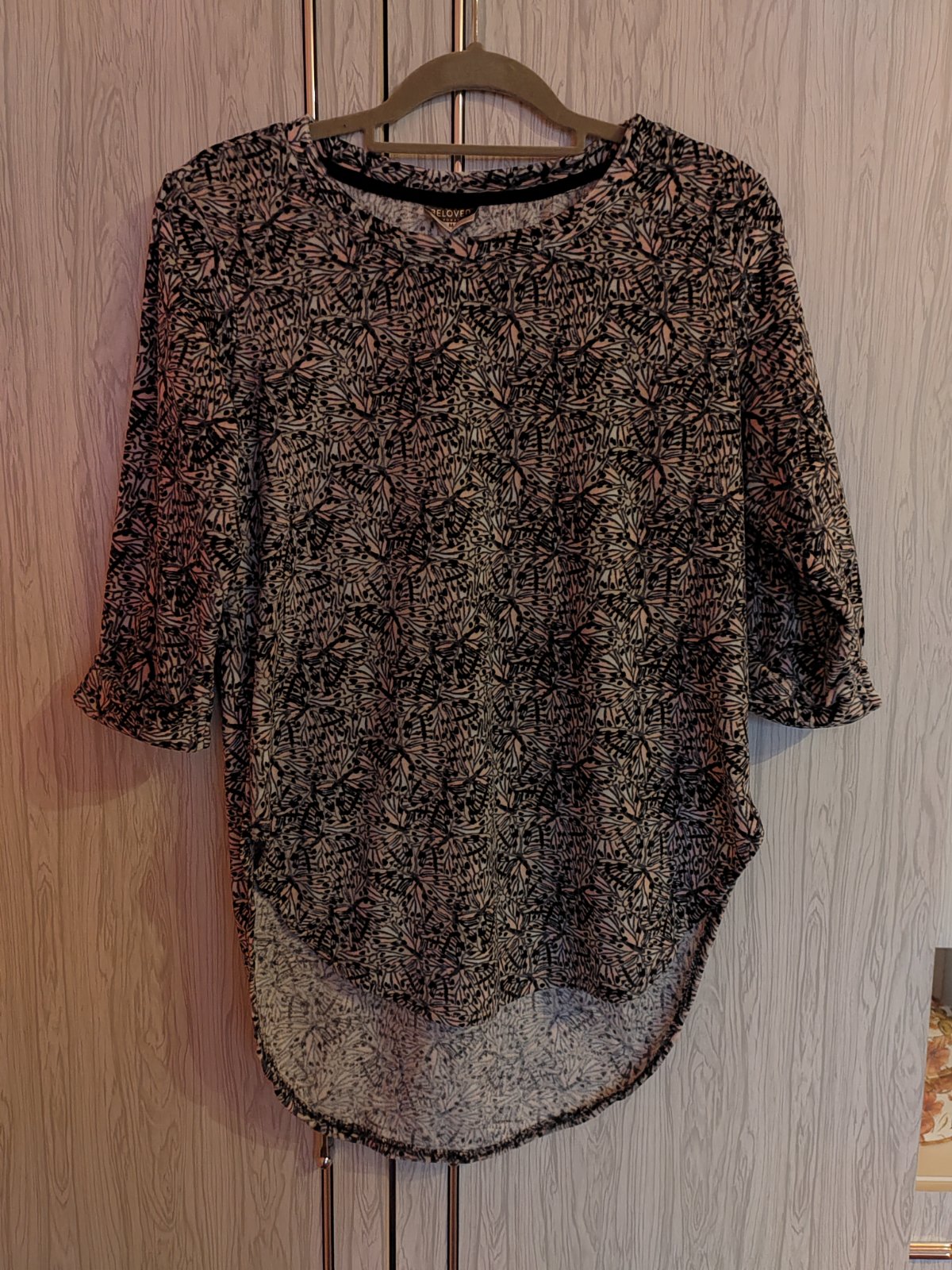 Tenší, mäkký materiál, veľmi príjemný na nosenie. So vzorom motýľov. 2x oblečený. Sadne na S, M menšie L.