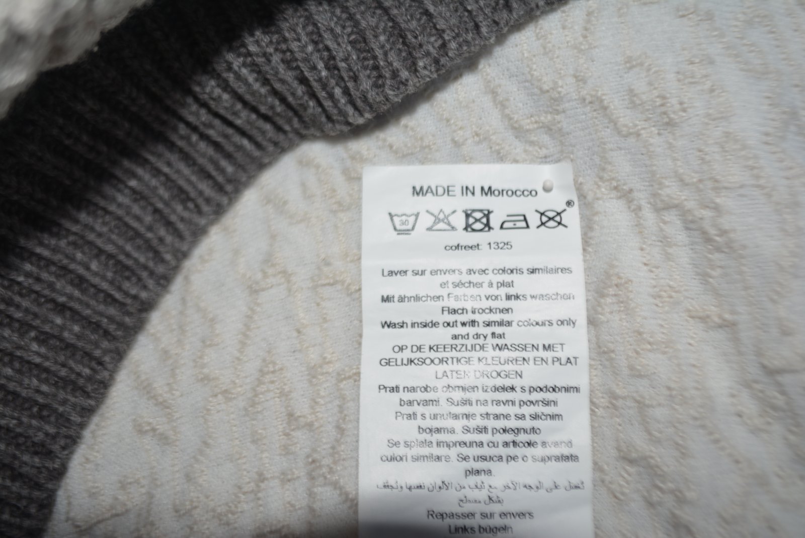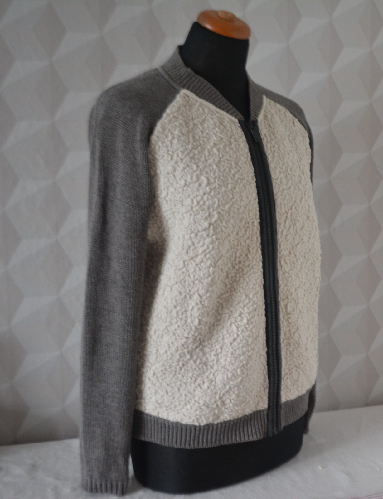 Má raglánové rukávy a textúrovaný predný panel v béžovej farbe, zatiaľ čo rukávy a zadná časť sú sivé. Okolo zipsu je kožené obšitie.