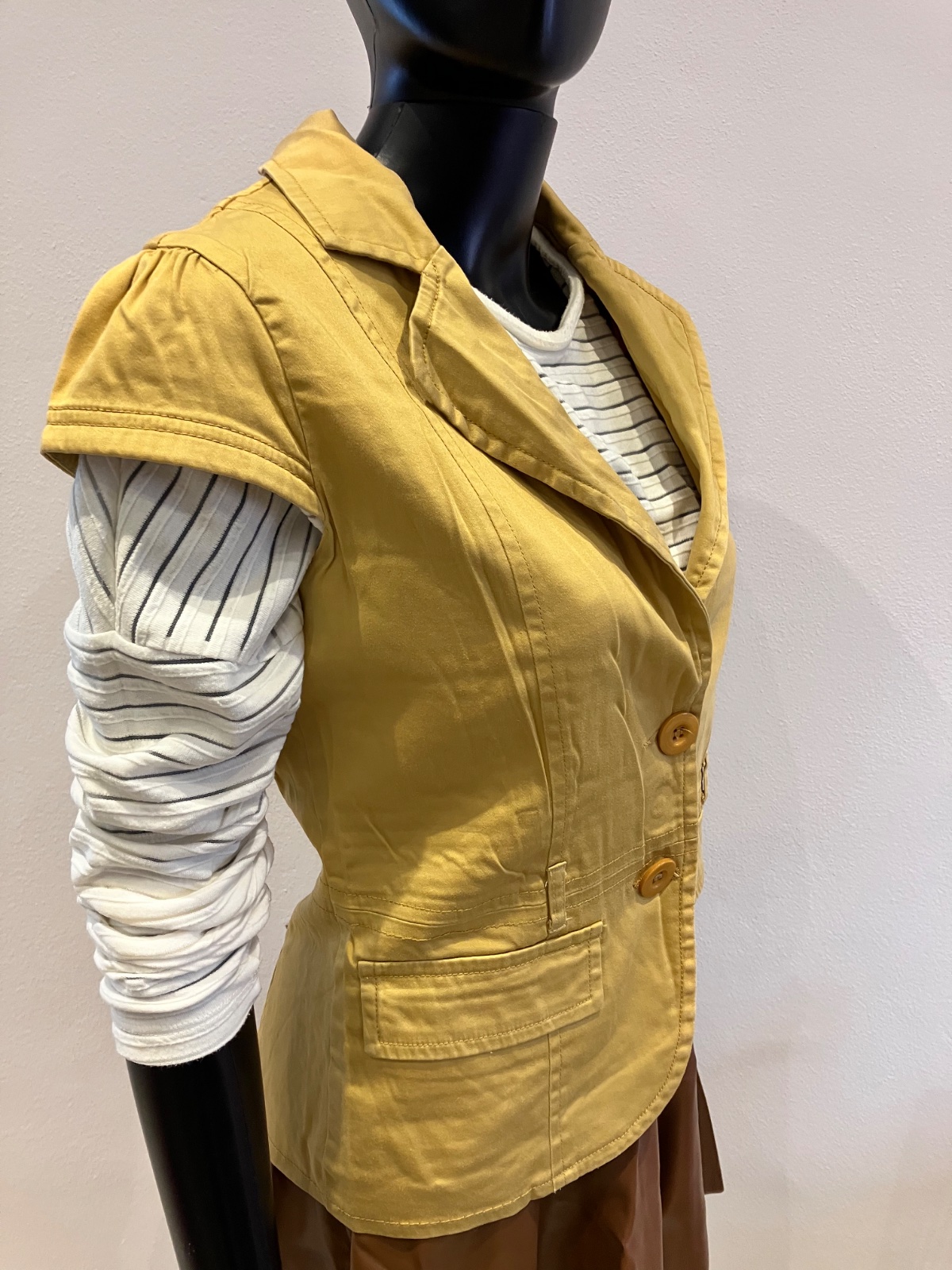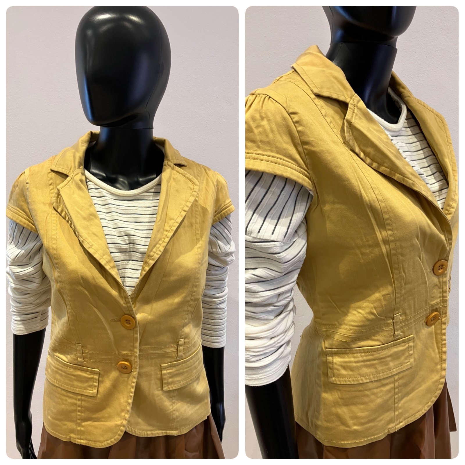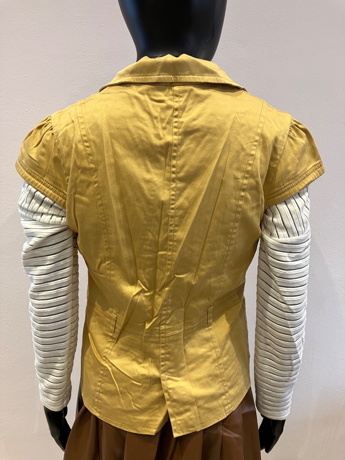 Dámska vesta s krátkym rukávom, zapínanie na dve gombíky, elastická, pútka na opasok. Veľkosť cca S.