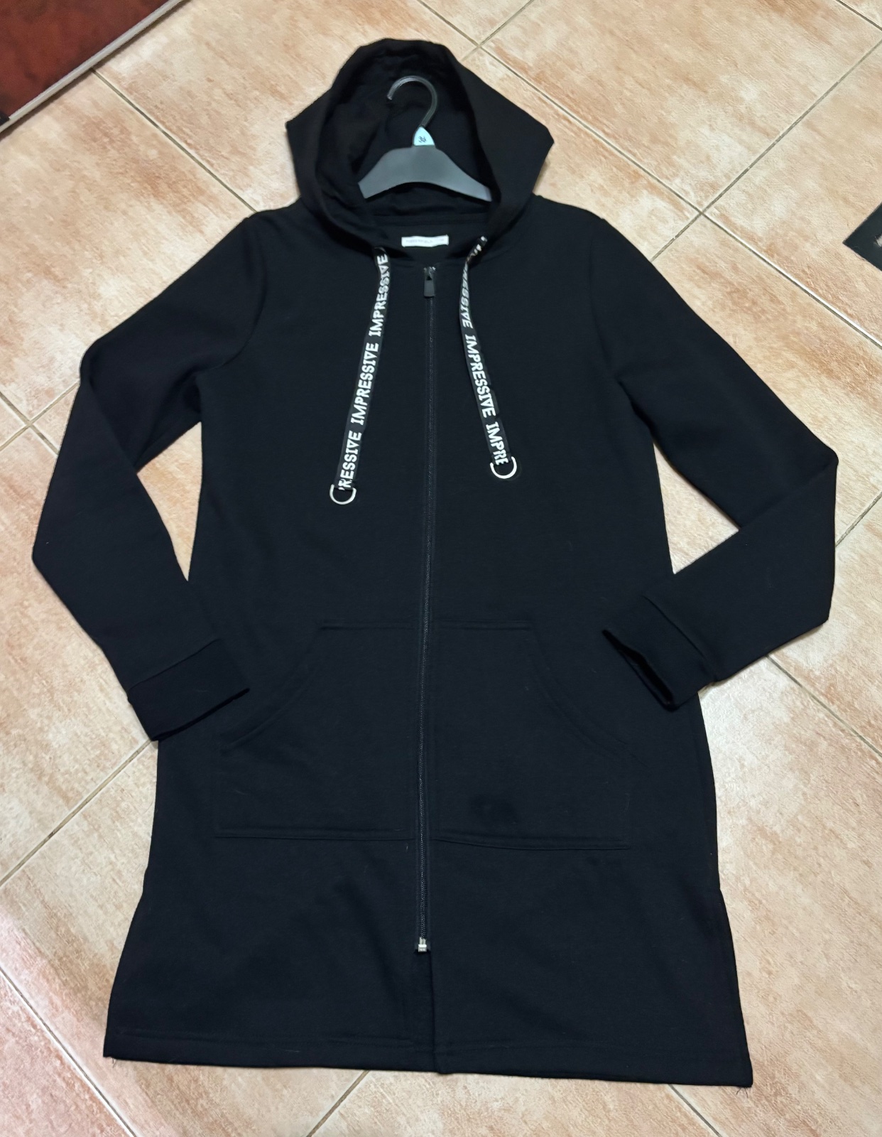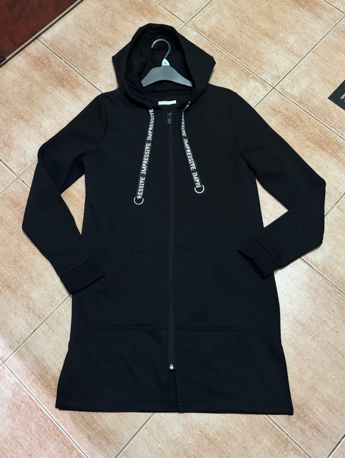 Predlzena mikina. Min nosenia. Na mi kine je pri spodnom ruží im cvoku mala dierka. Ak je mi kina zapnutá, dierka nie je vidno.