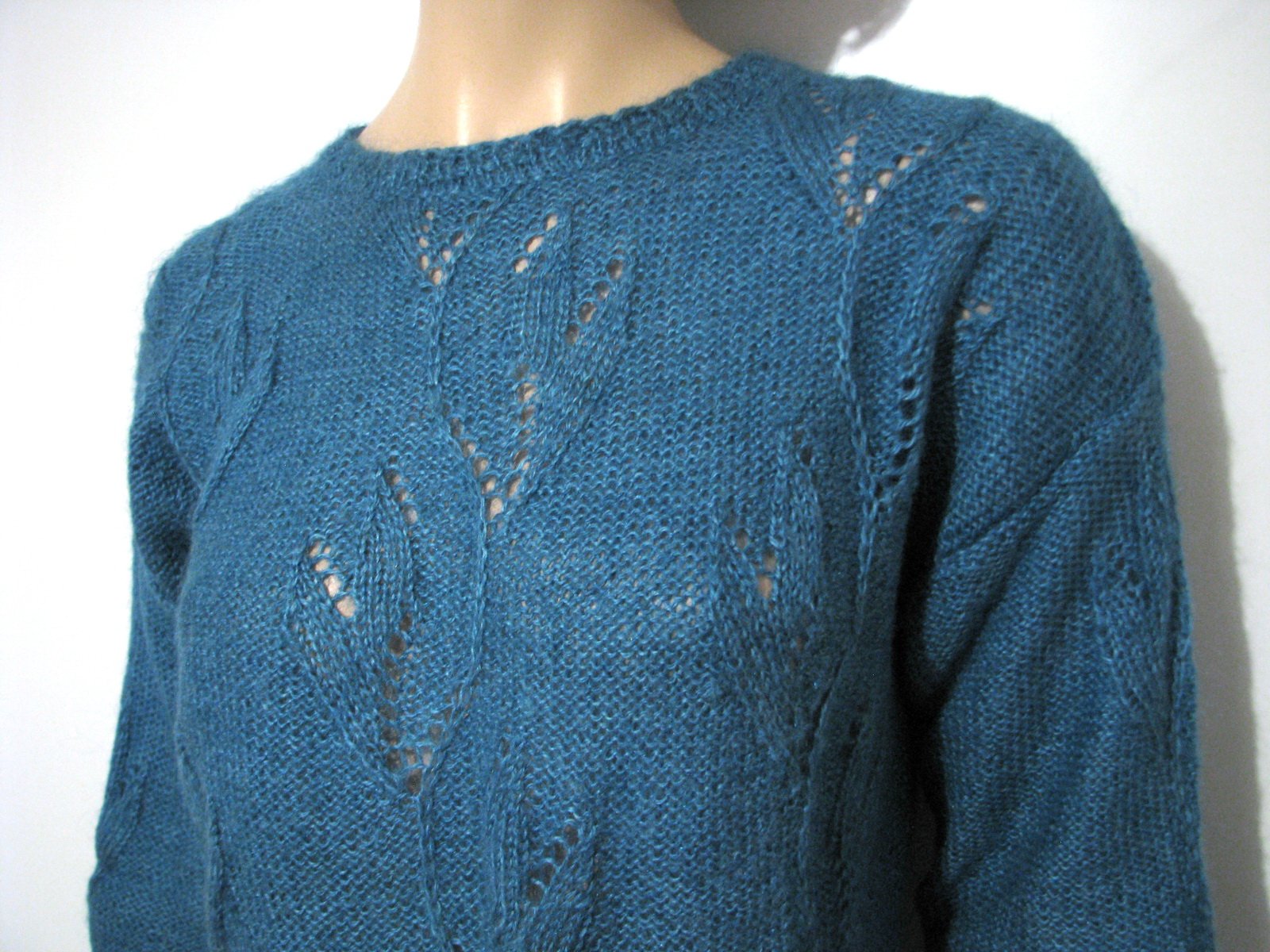 Krásny ručne pletený sveter tmavo-tyrkysovej, tzv. petrolejovej - modrozelenej (skôr do modra) farby s kvetinovým mierne dierkovaným vzorom. Málo nosený, pekne zachovalý, bez poškodení. Veľkosť odhadom M, no pokojne aj na S (S je figurína). V prípade záujmu premeriam.
