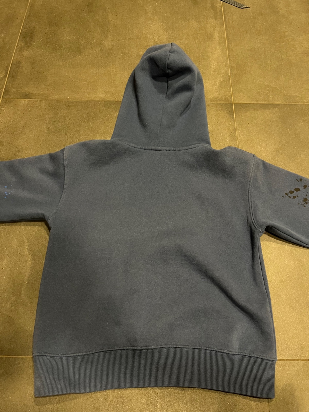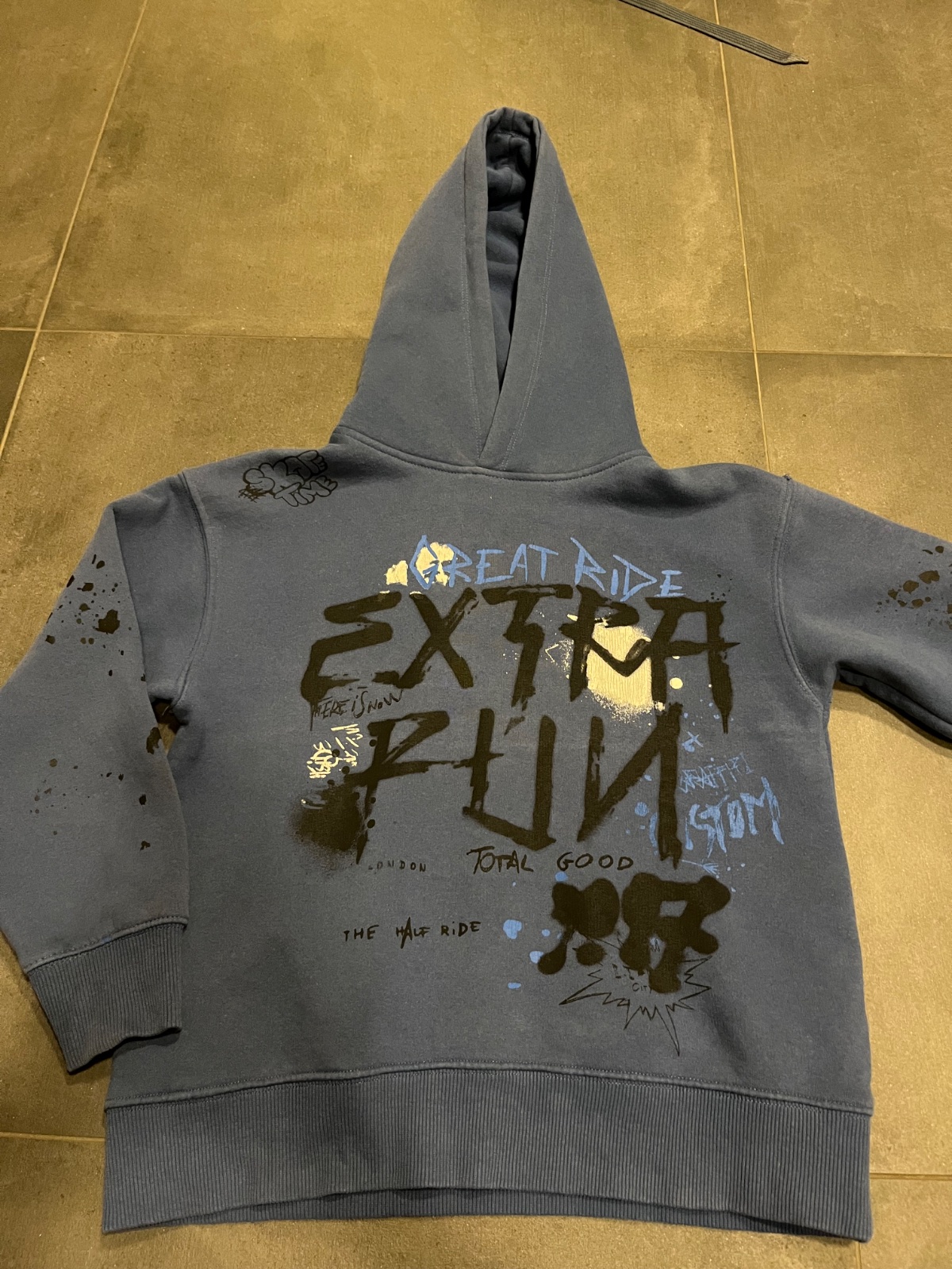 Mikina asi 2x oblečená, nestihli sme vynosiť. Veľkosť je sice písana 116, ale veľkosťou je ako 134/140. Dlzka je 54cm, sirka 43cm. V skutočnosti krajšia ako na fotkach, je tmavomodra v 100% stave