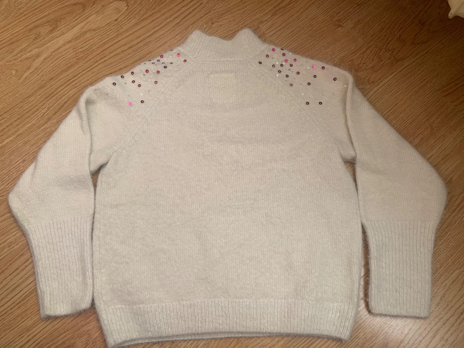 Krásny mäkkučký pulovrik. Materiál je jemne chlpatý a na dotyk jemný. Svetrik je v super stave, len na rukávoch sú asi 3 drobunké oranžové frcky a 1 modrá. Je to na foto, no sú takmer neviditeľné, kým ich nehľadáte.