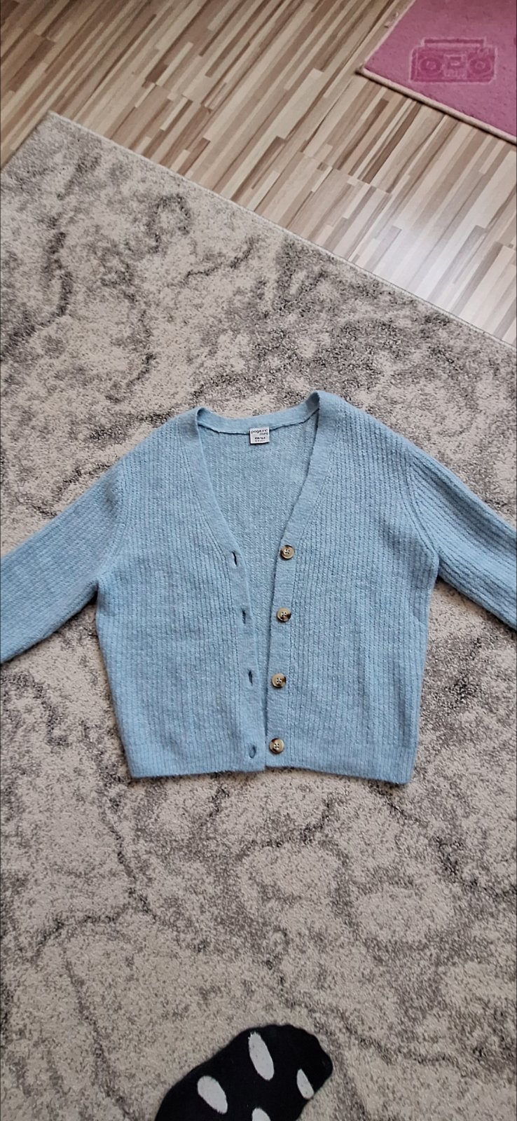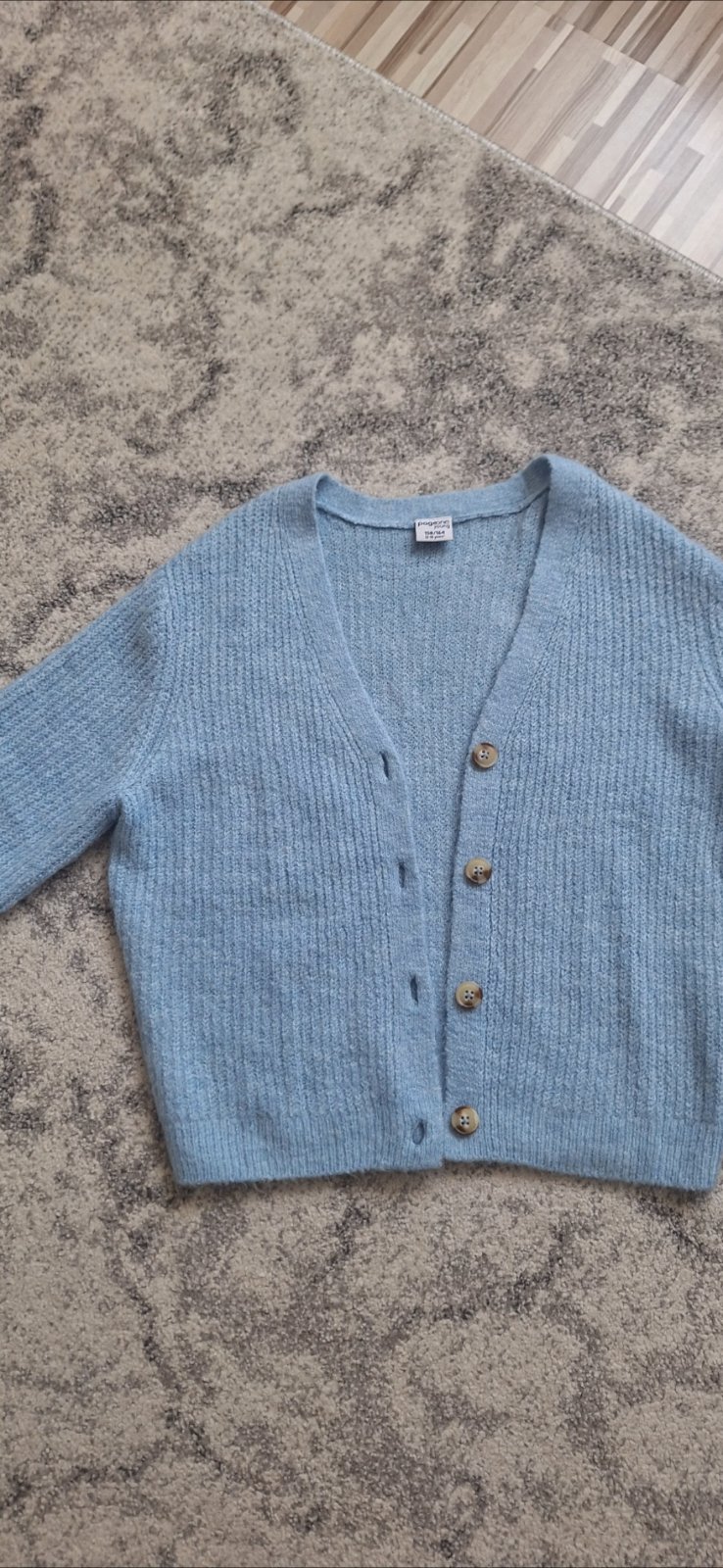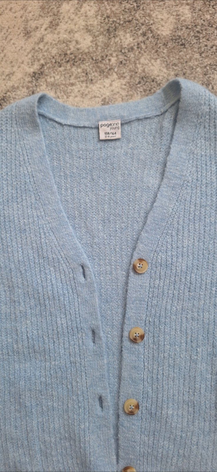 Veľmi príjemný svetrík so zapínaním na gombíky v melírovomodrej farbe. Materiál: 70% bavlna, 30% polyamid Rozmery: dĺžka 57 cm, šírka pod pažami 41 cm, šírka v páse pri nenatiahnutom patente ...