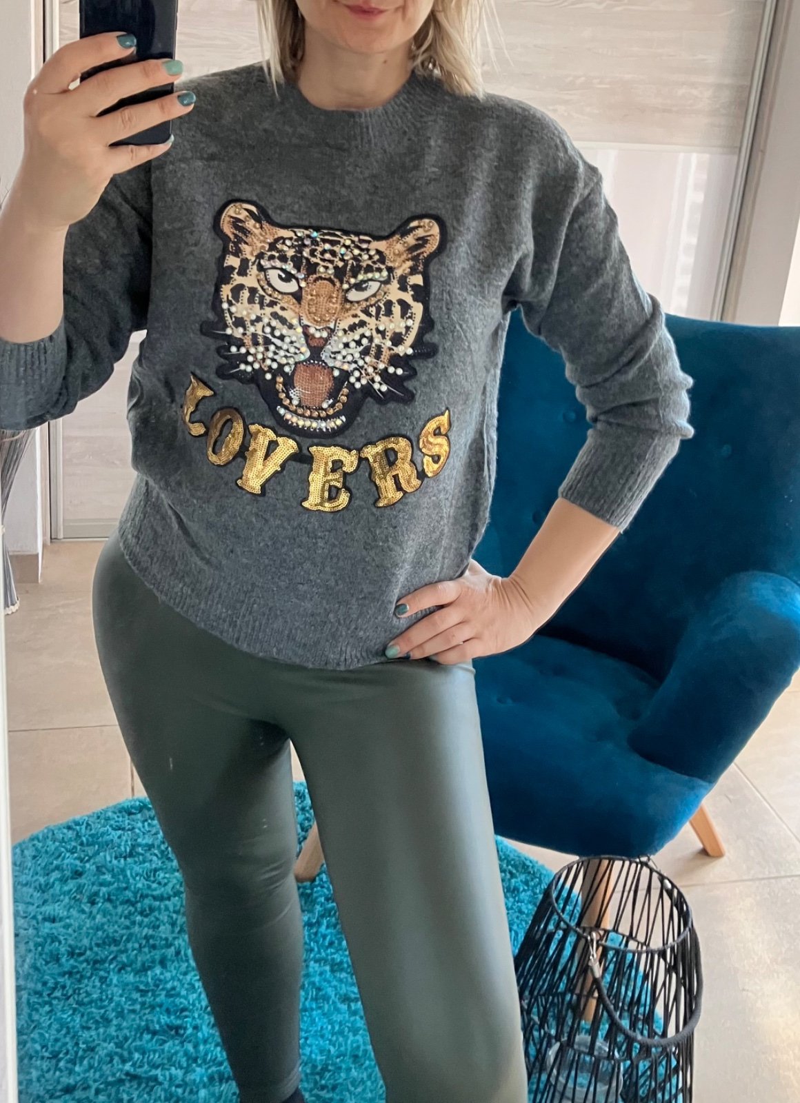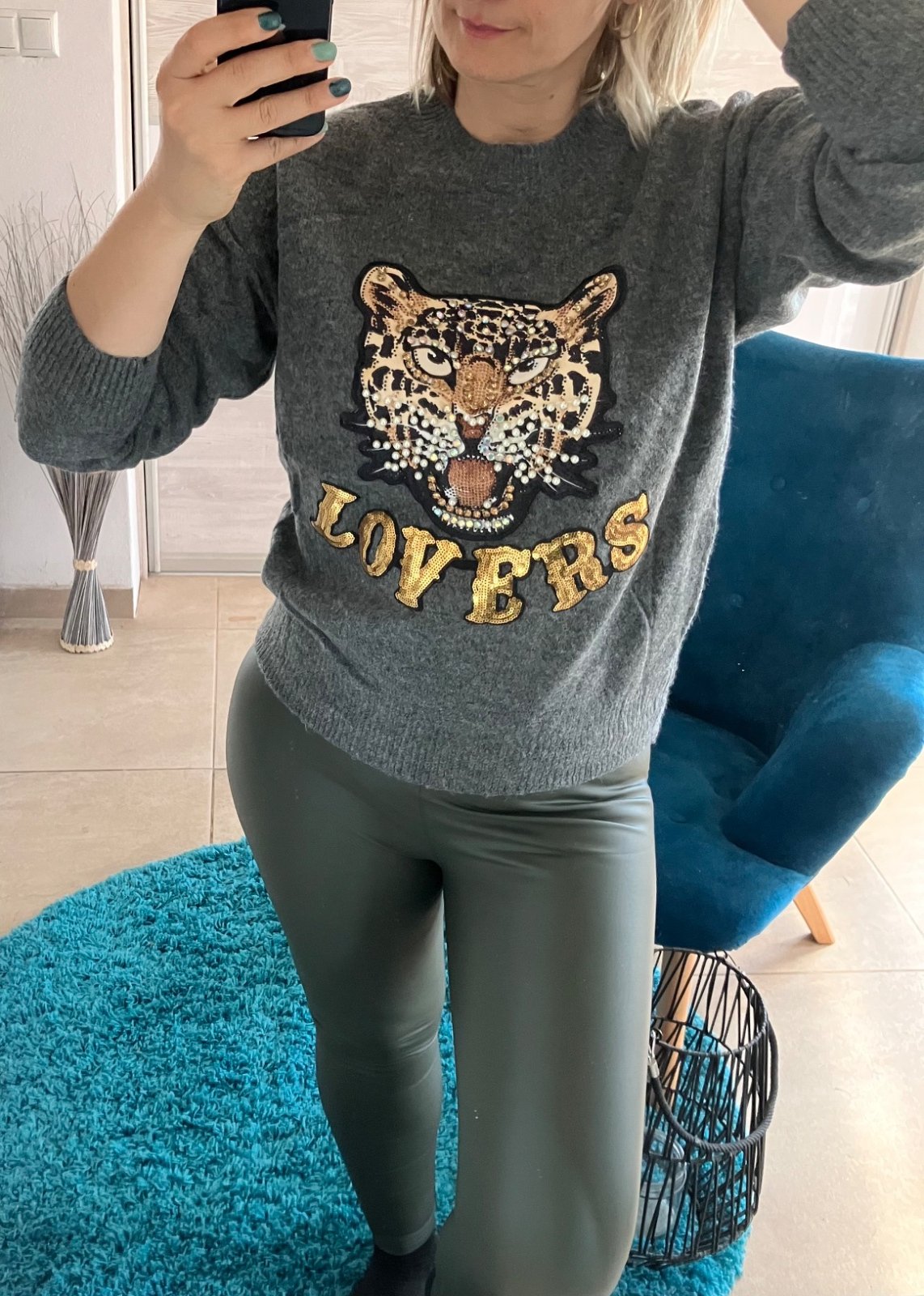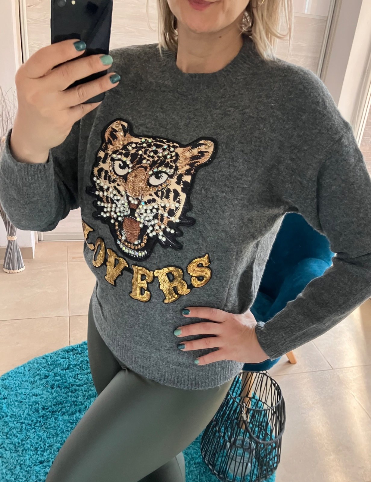 SkladomDámsky sivý sveter, zdobená flitrovanou tigrou hlavou a nápisom „LOVERS“.Prednú stranu zdobí veľký, detailný dizajn tigrej hlavy, posiaty kamienkami a perlami pre trblietavý efekt. Pod ním je slovo „LOVERS“ v zlatých flitroch. Elastický. Materiál:50%akryl, 30%polyamid, 18%viskóza, 2%elastan. Veľkosť UNI (vhodná pre S,M,L,XL). Krajina pôvodu: ČĽR.