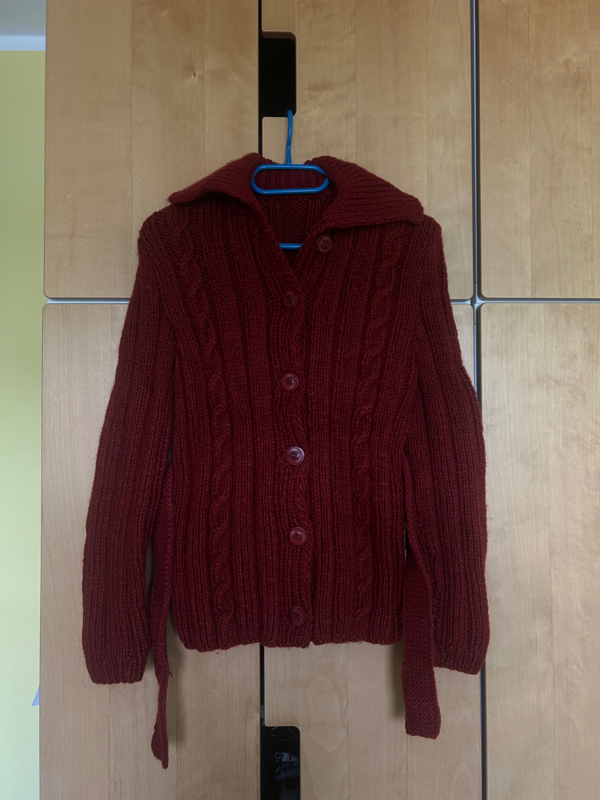 Sveter je prekrásny, je ručne štrikovaný, dlhší s opaskom. Veľmi teplý.