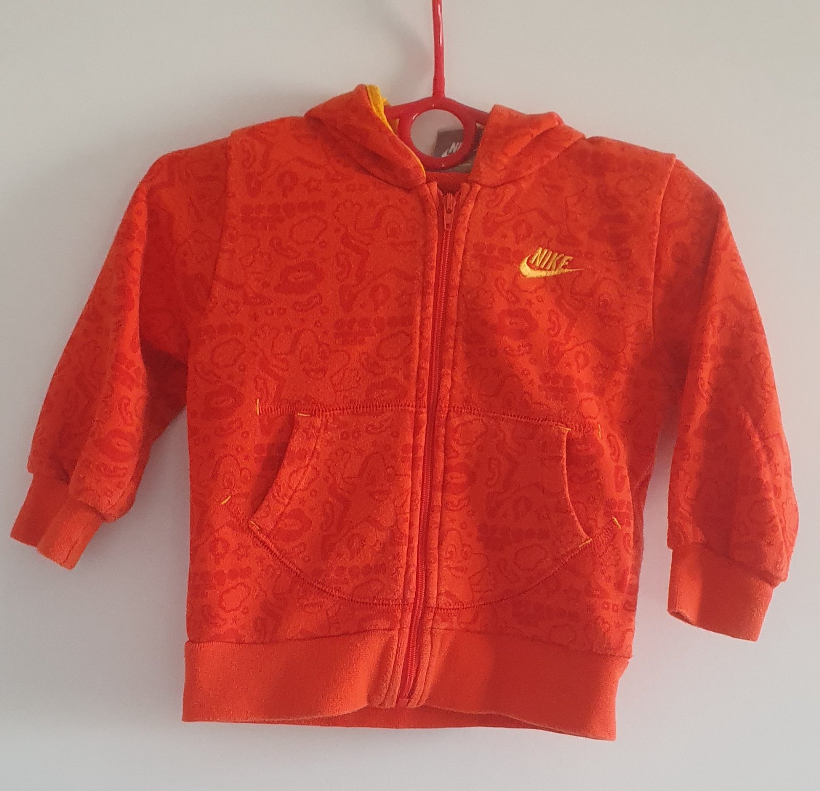 Predám nosenu mikinu, farba červeno oranžová, noseny stav, bez dier, ešte poslúži