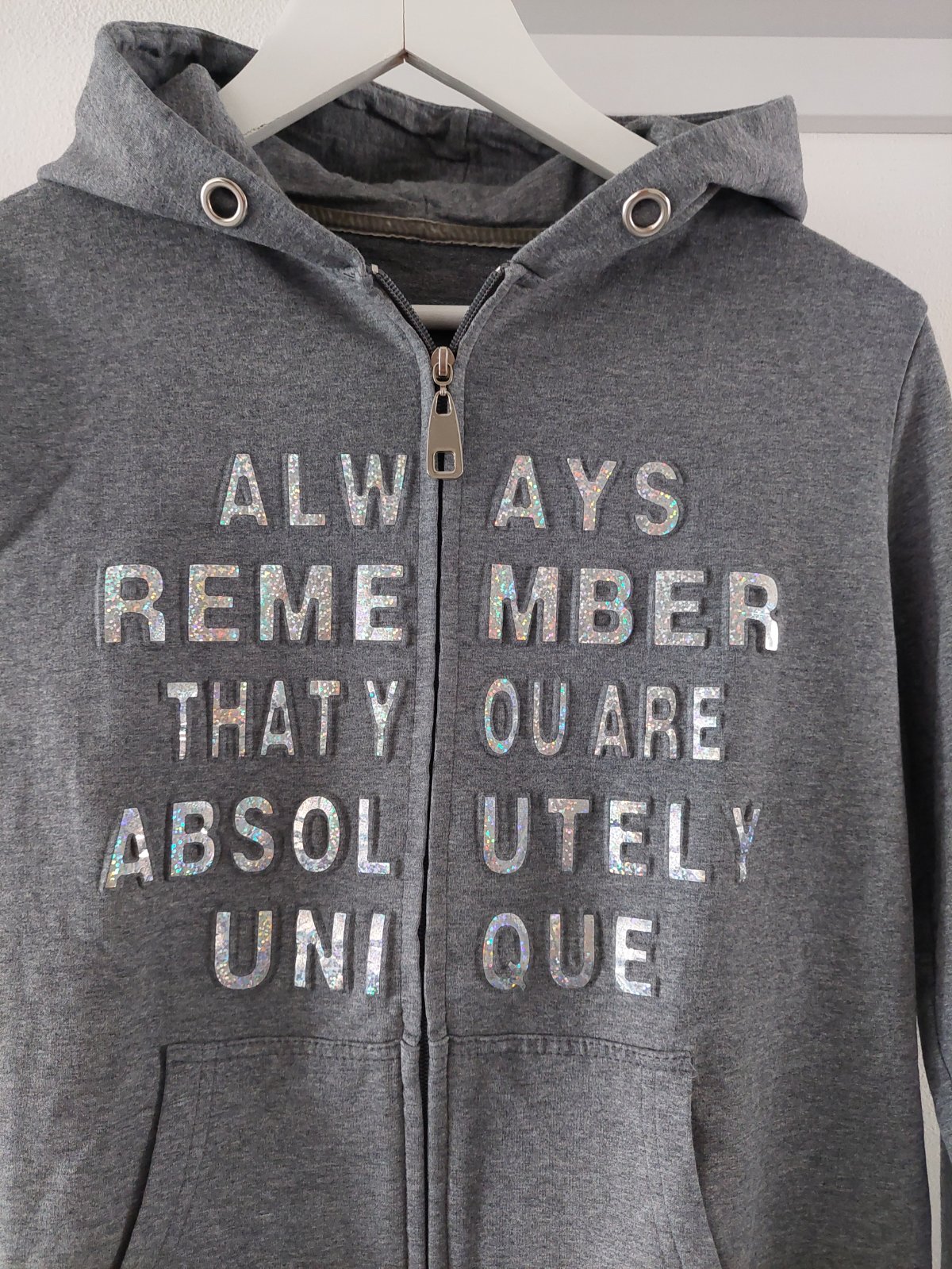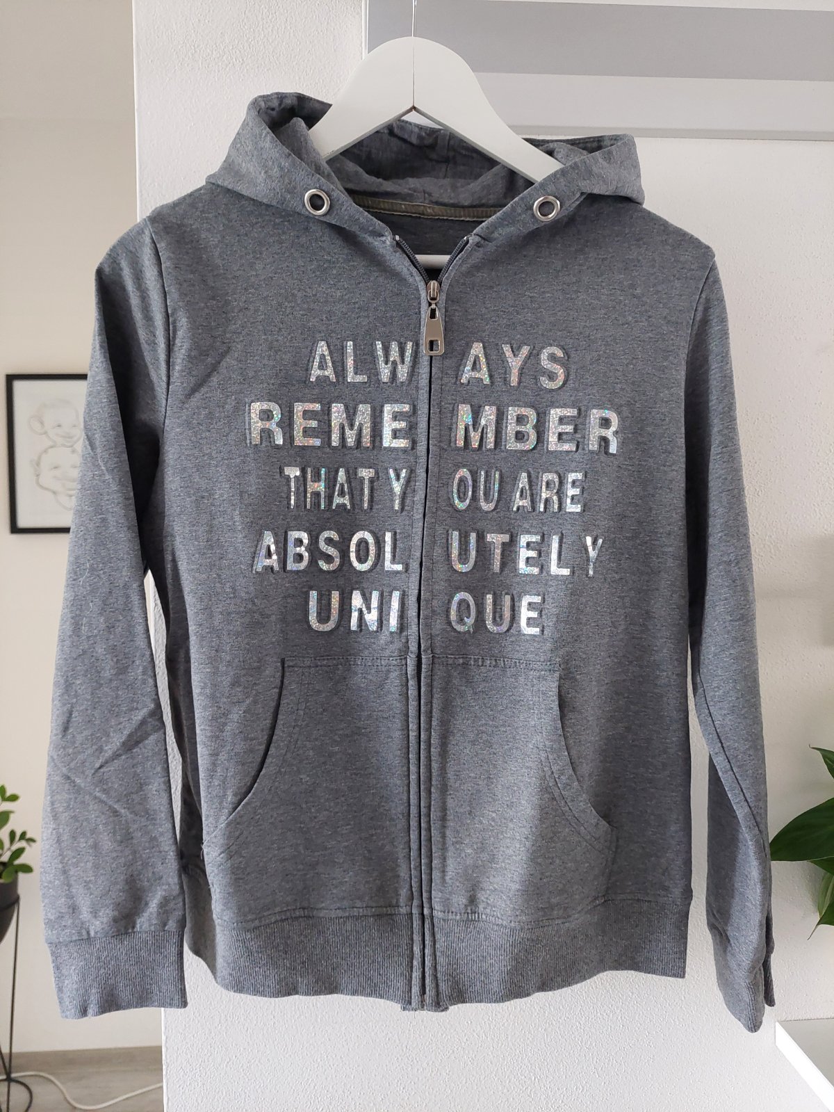 Predám krásnu šedú mikinku s trblietavým krásnym nápisom, veľ. je taká S/M by som povedala , štítok som odstrihla, je príjemná skôr tenšia , elastická s kapucňou, rozmery:dĺžka 57cm a šírka pod pazuchami je 46cm.