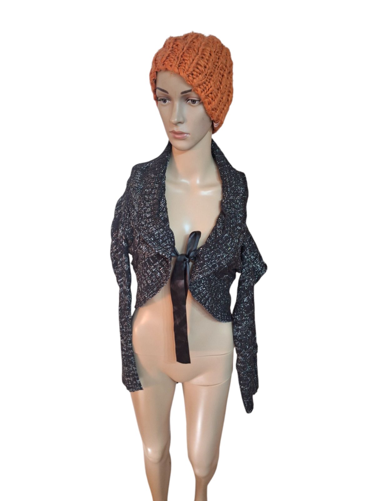 Dámske čierno strieborné značkové bolérko na zaväzovanie. Dĺžka je 45cm, obvod hrudníka je 86cm a obvod pása je 78cm. Dĺžka rukáva je od krku 70cm. kód 2168