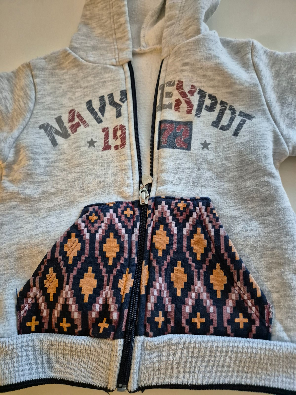 1ks mikina šedá (kupena v zahranici) vpredu so vzorom zapínanie na zips s kapucnou