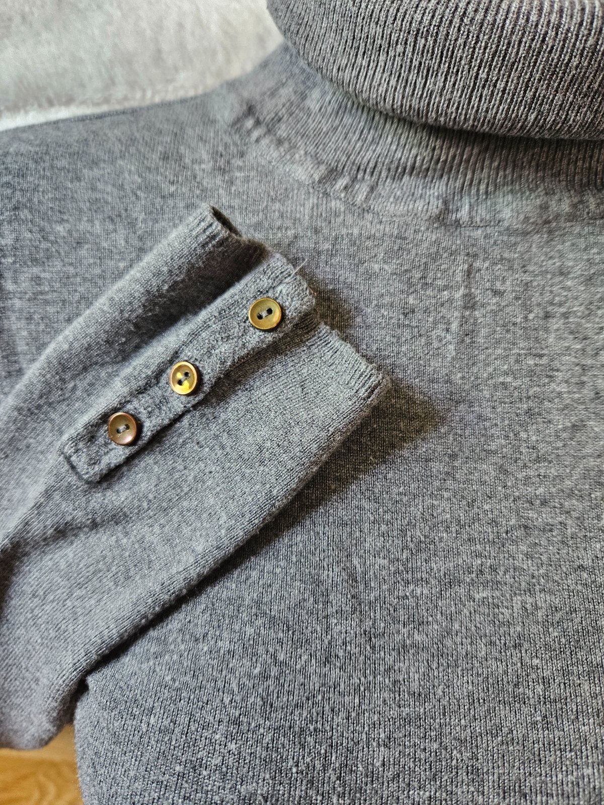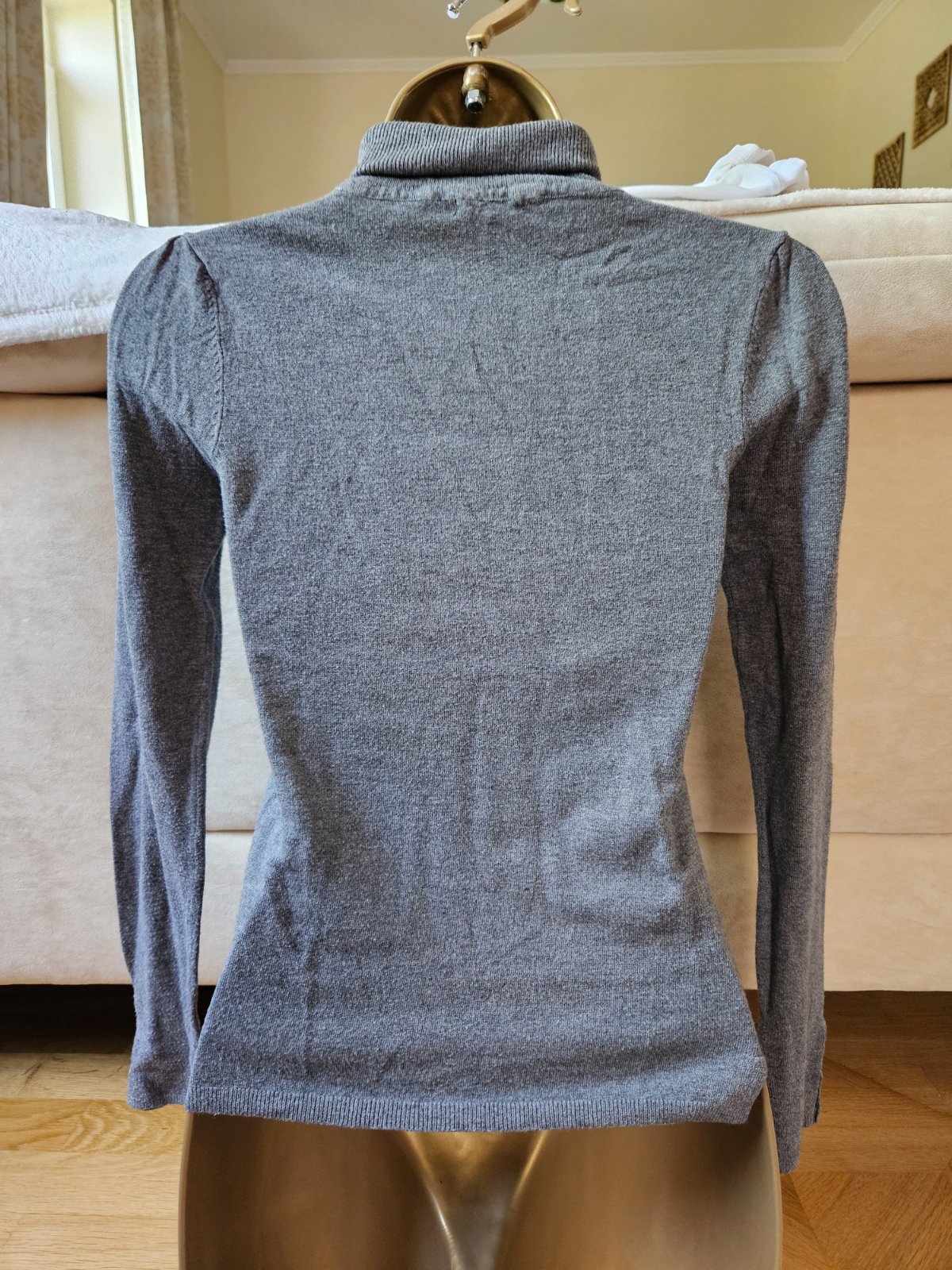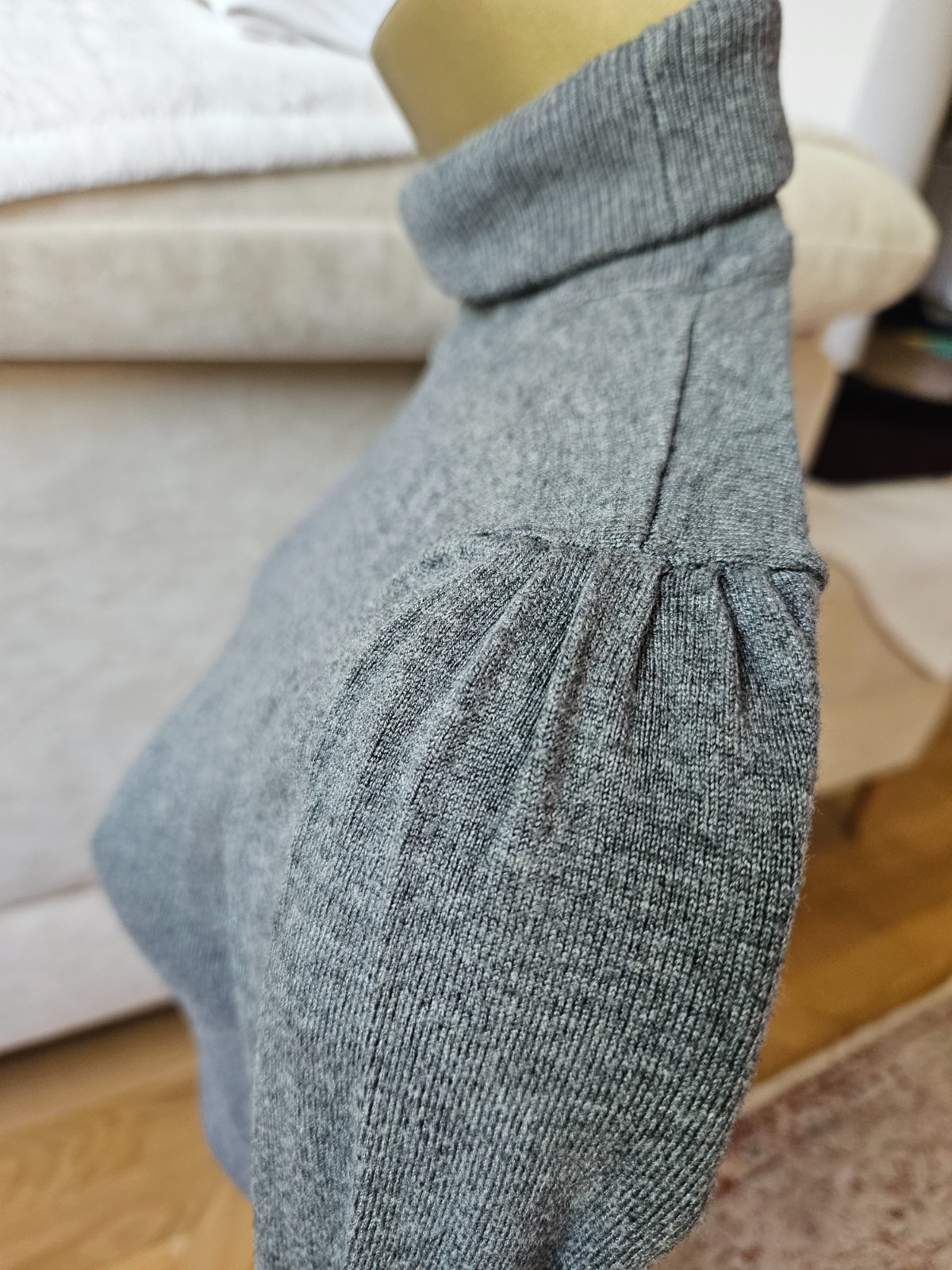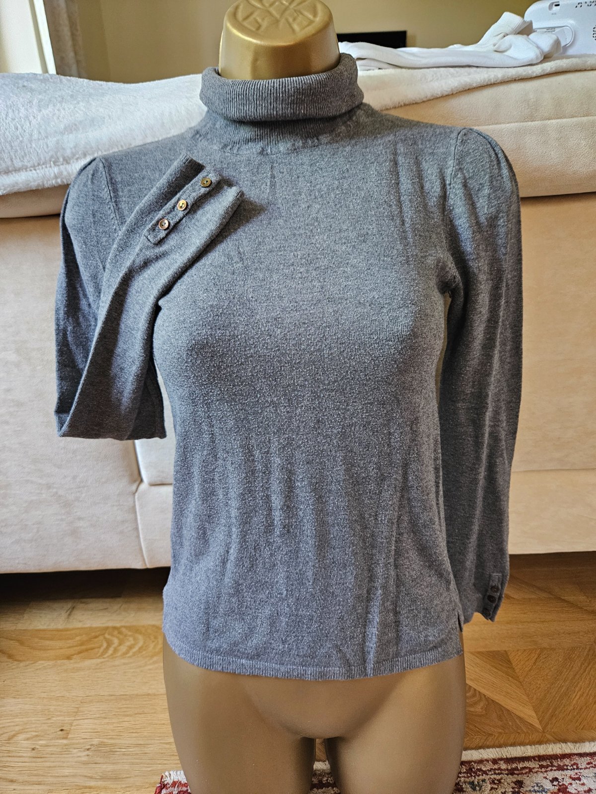 Rolák s aplikáciou na rukávoch a pekne tvarovanými rukávmi. Štítok tam už nie je ale figurína je veľkosť S, trochu zožmolkovaný ale ináč ok.