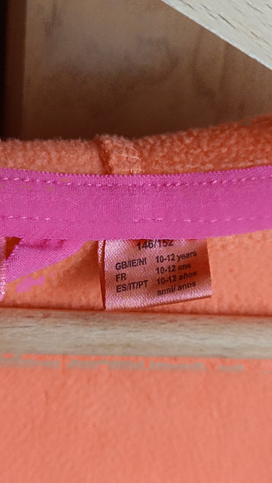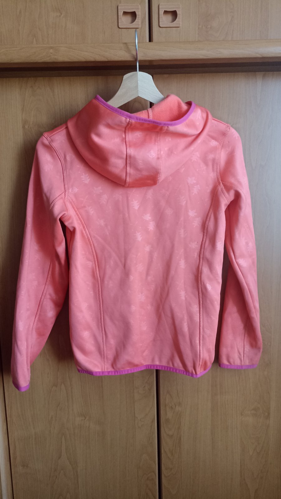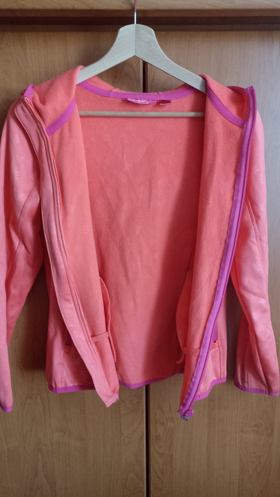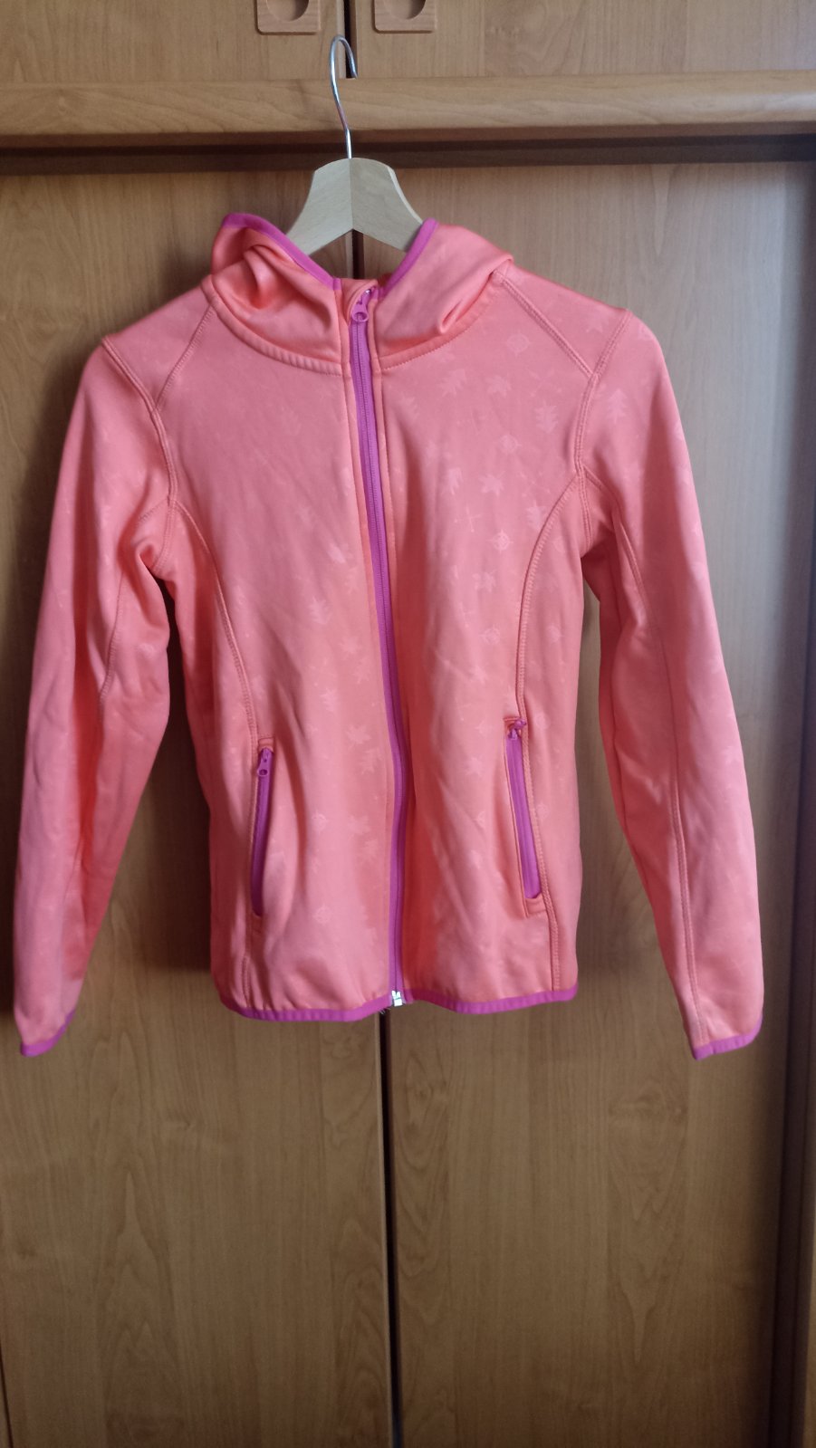 Dievčenská mikina s kapucňou a vreckami, pekná oranžová farba s ružovým lemovaním, nosená, veľ. 146/152.
