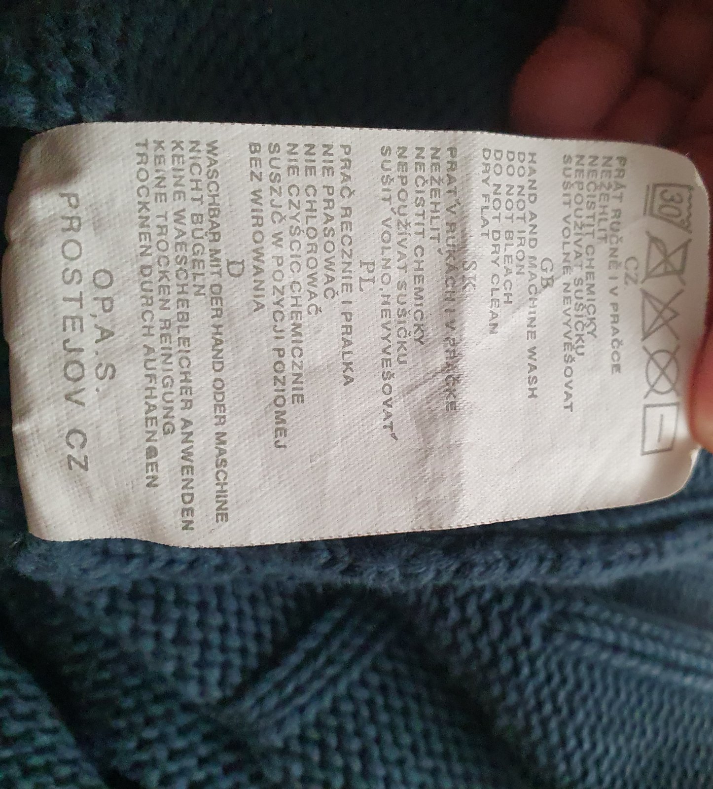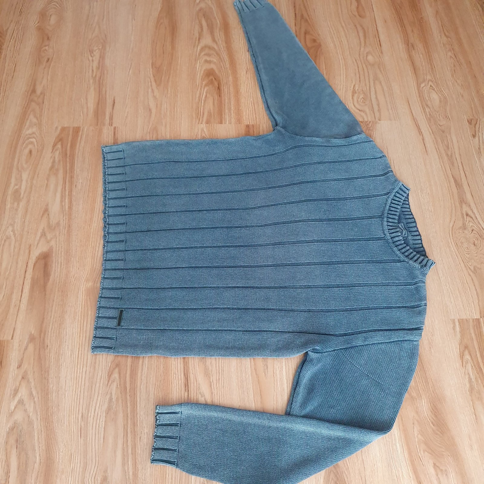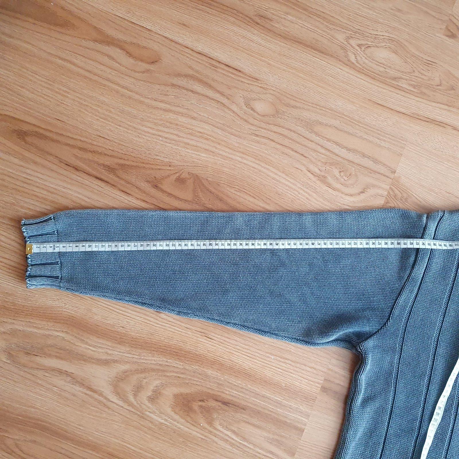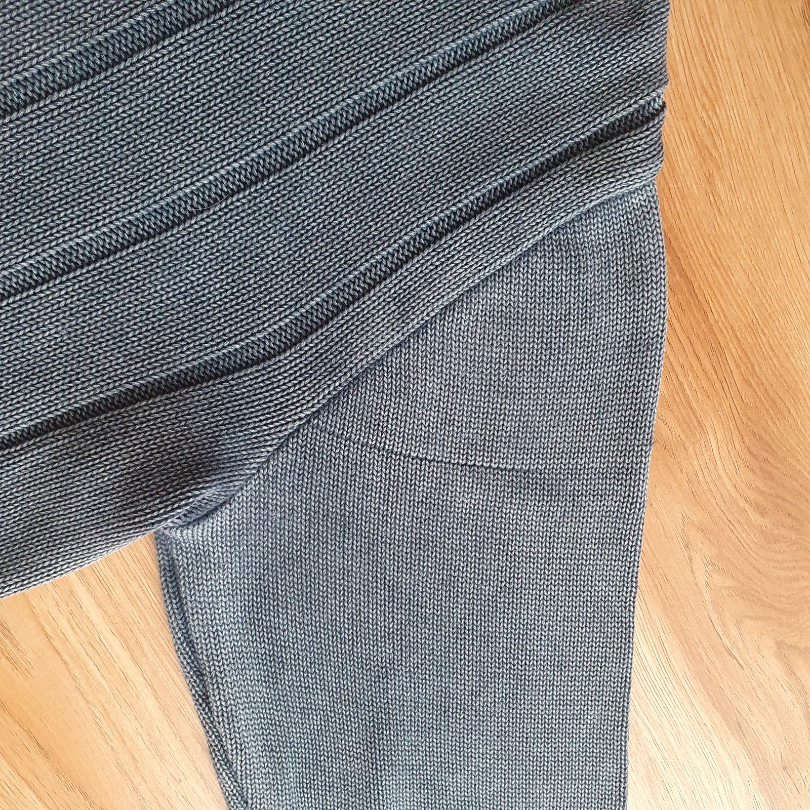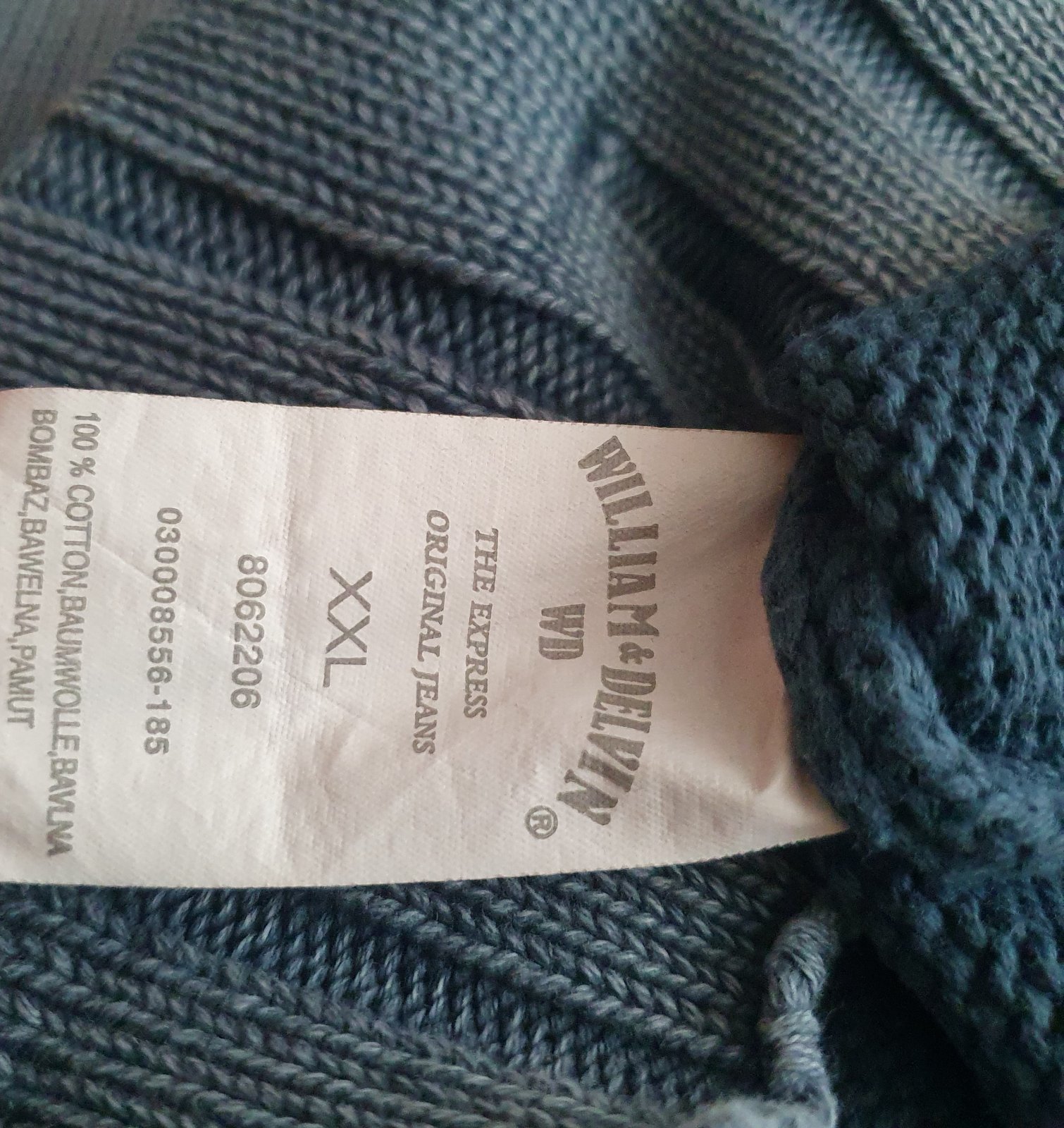 1x použité a oprané. Na ľavom ramene od výroby chyba v tkanine. Inak žiadne poškodenia. 100% bavlna, farba denim. Krásny sveter, pre nás veľký. Cena je bez pošty