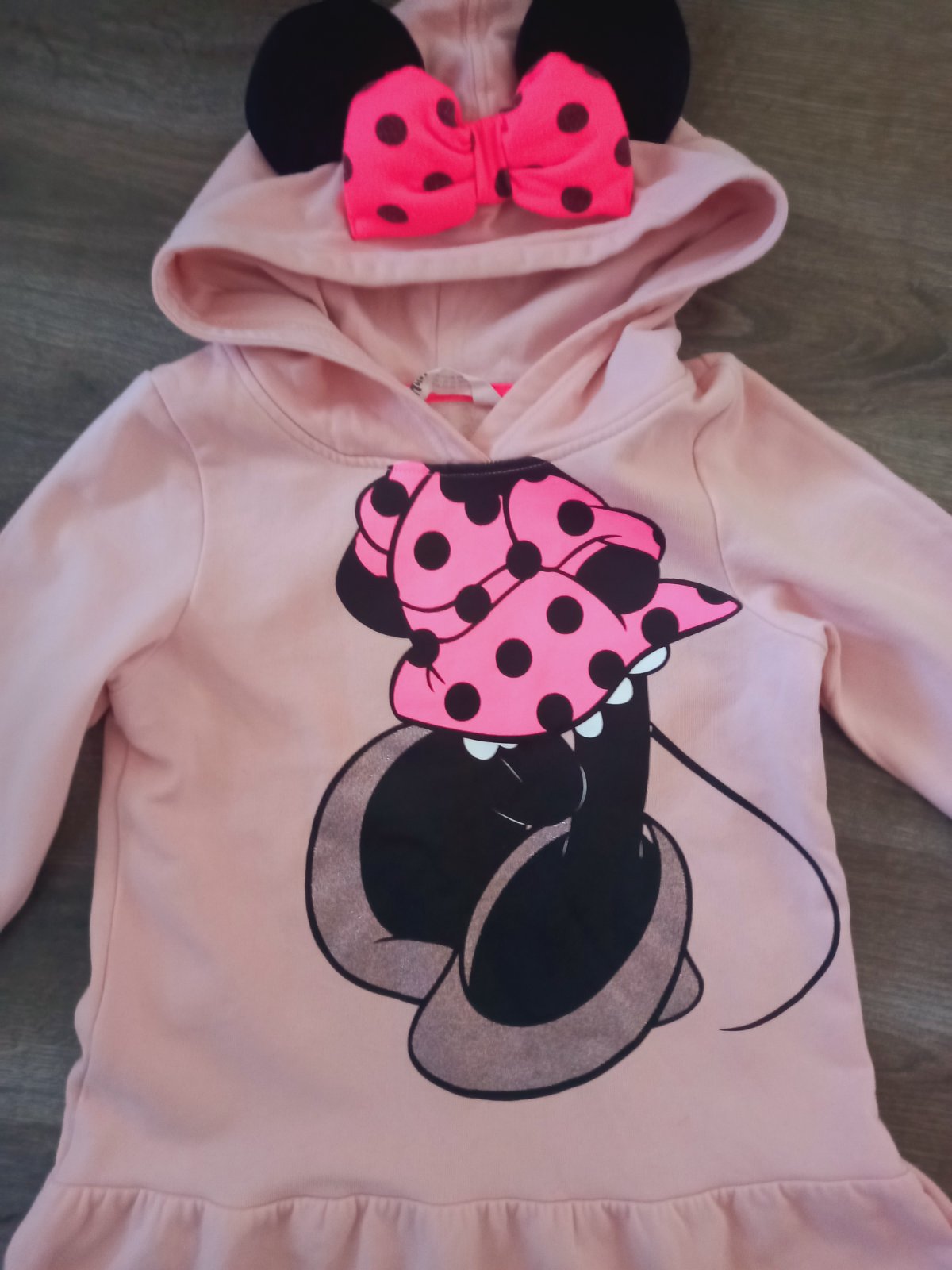 Krásna predĺžená mikinka s Minnie,kupovaná v H&M, veľkosť 122/128,mikinka je vo veľmi dobrom stave, až na svetlý fliačik dole, nevidiet veľmi, ale uvádzam to.cena 8 eur.