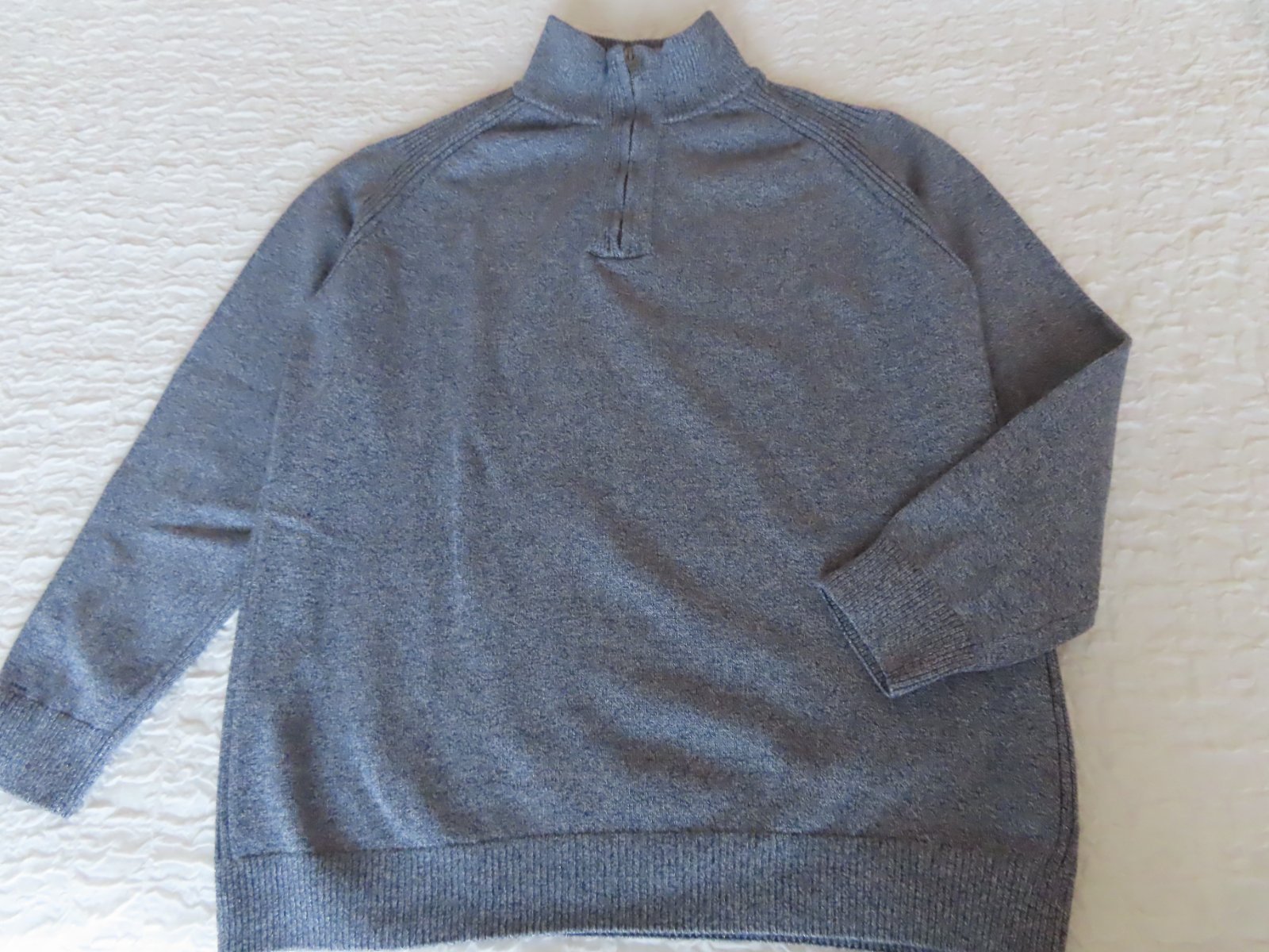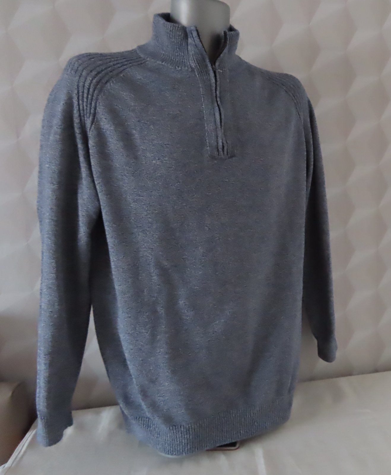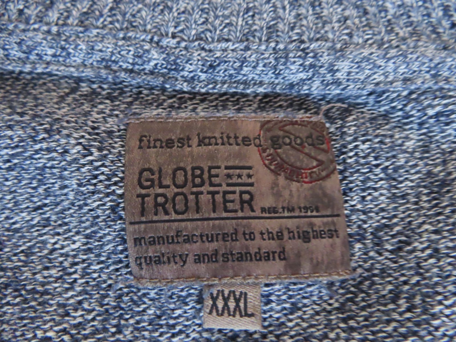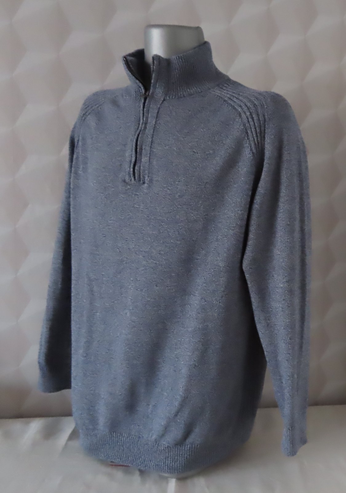 Šedo-modrý melírovaný pulóver Globe Trotter, veľkosť označená XXXL, sedí na XXL - tu sú rozmery: dĺžka 71cm, pod pazuchami 2x58cm, rukáv je raglánový - od krku 77 a od pazuchy 49cm.