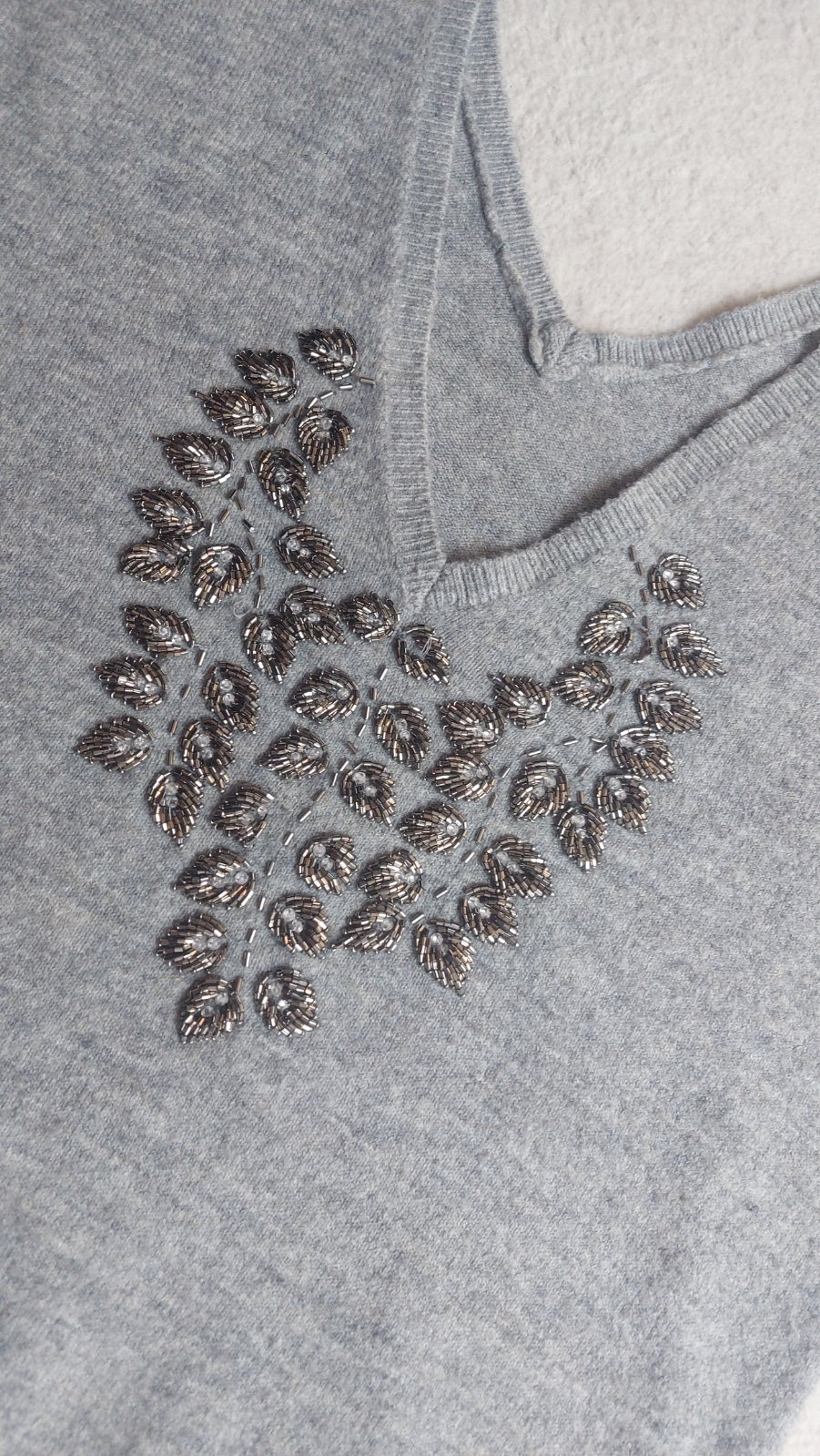 výstrih do V, da sa nosiť z oboch strán. bud mate ornament vzdau na chrbte. co vyzerá super. alebo aj vpredu. záleží od nálady
