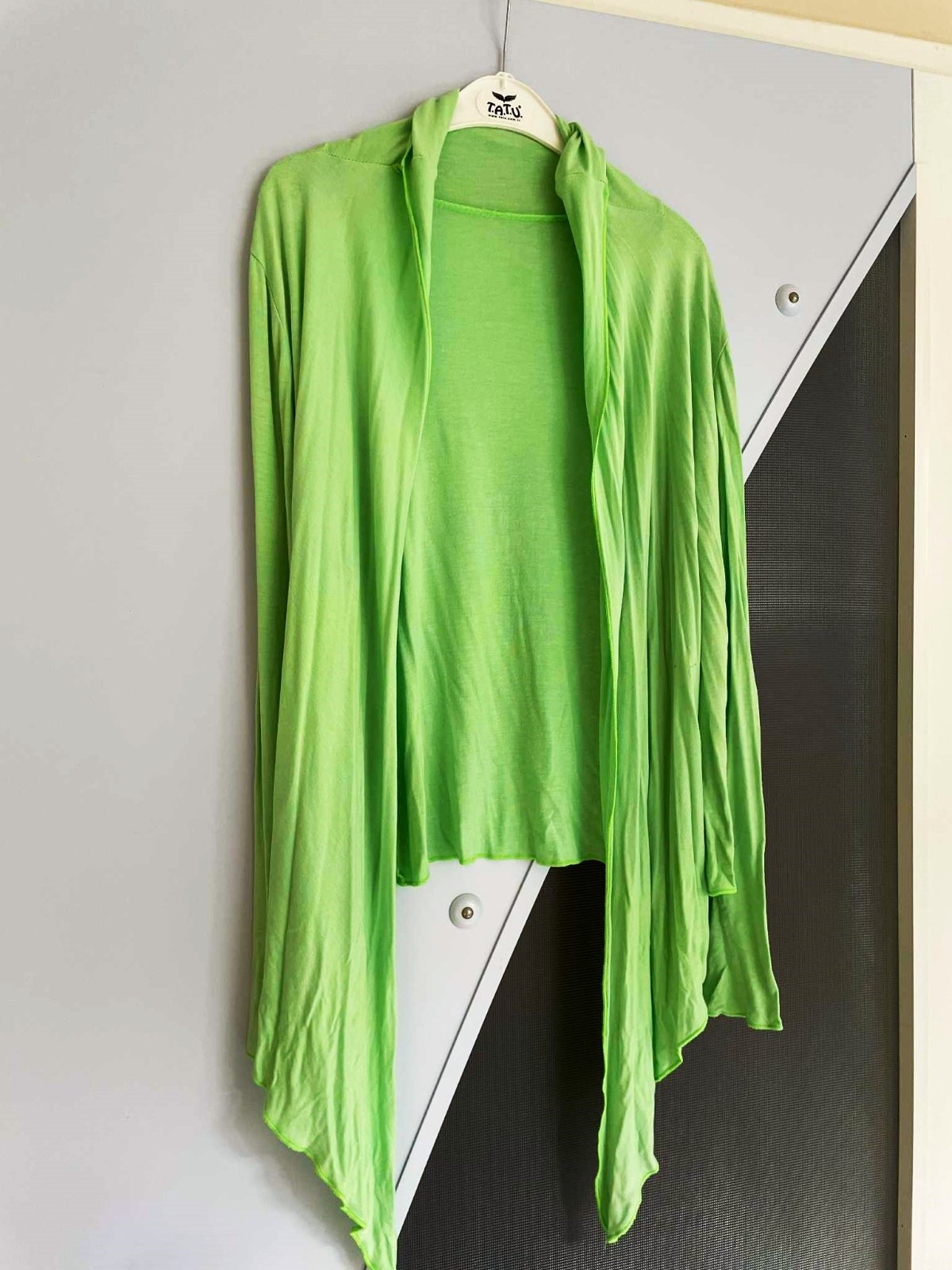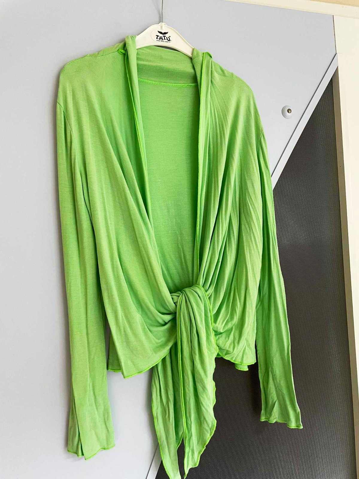 jemný letný svetrík na uväzovanie,veľmi variabilný strih,krásna jablkovo zelená farba,ľahúčky,tenký,super na letné chladnejšie rána alebo na jeseň,prípadne na leto na dovolenky - na chladné večery,top kúsok,je to uni veľkosť ,od M -XL, v top stave