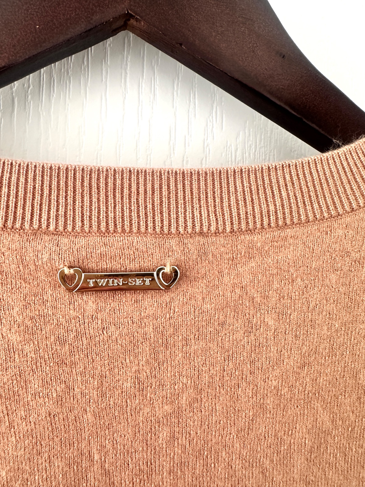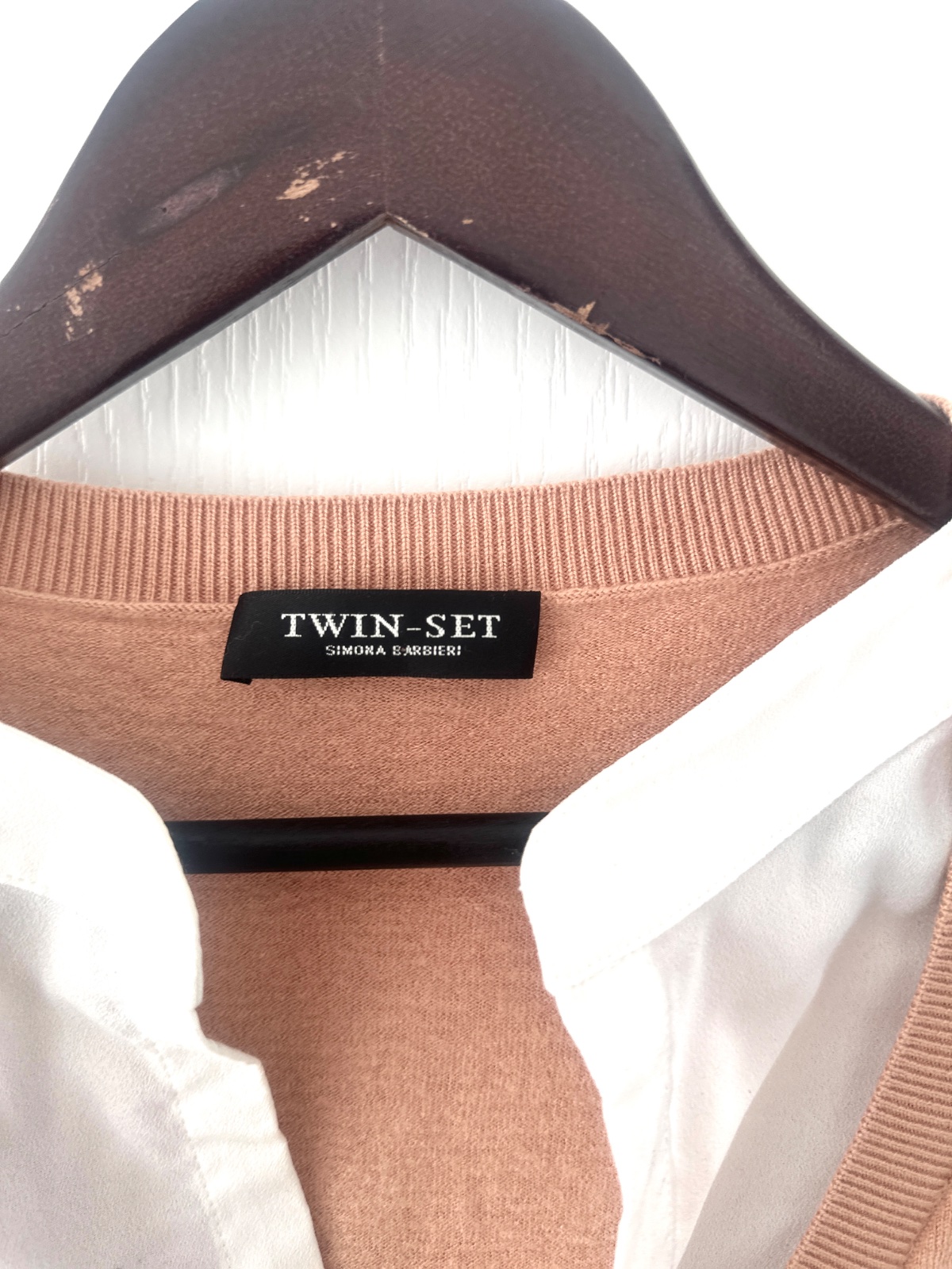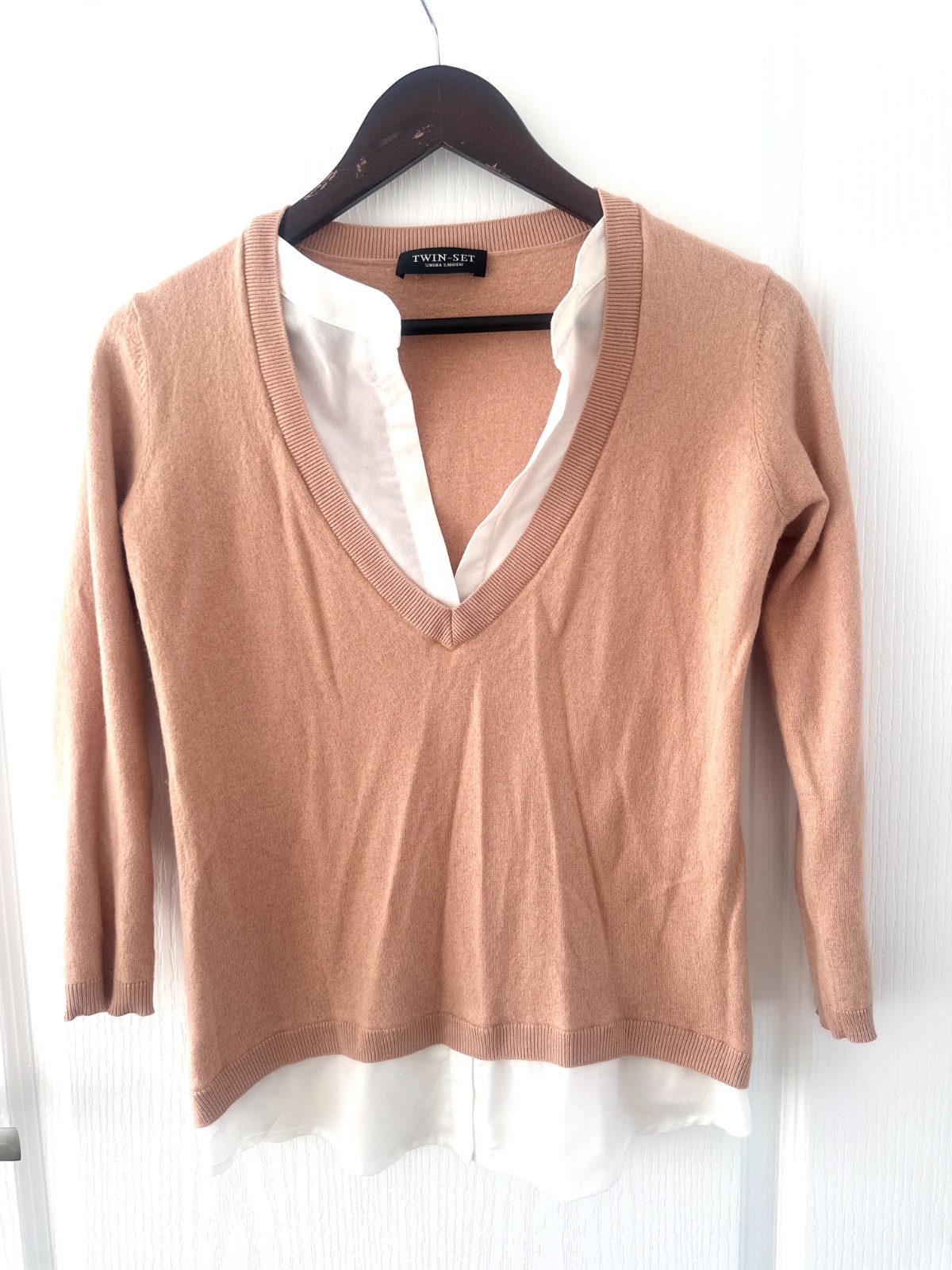 Sveter Twinset prémiovej značky v krásnej béžovej farbe. Sveter má 3/4 rukávy a výstrih v tvare V zdobený bielym materiálom. Biely materiál zdobí aj spodok svetra. Celé to pôsobí, ako keby pod svetrom bola biela blúzka. Sveter má veľmi dobré zloženie: 68% viskóza, 30% vlna a 2% kašmír. Na zadnej strane pri výstrihu je zlaté logo značky. Sveter je veľmi pekný a príjemný na dotyk. Veľkosť na štítku je XS, ale vyzerá skvele aj na veľkosti S.