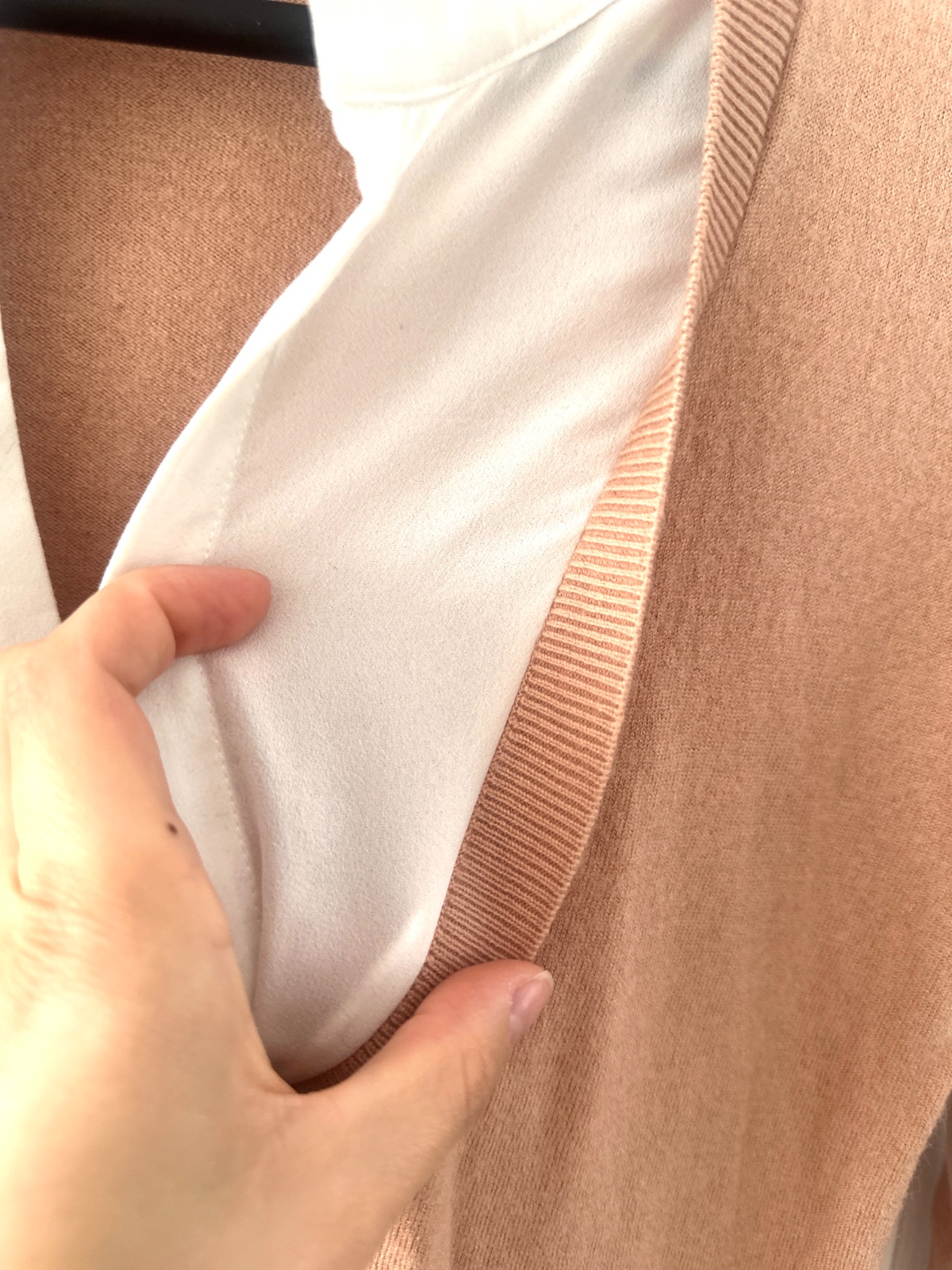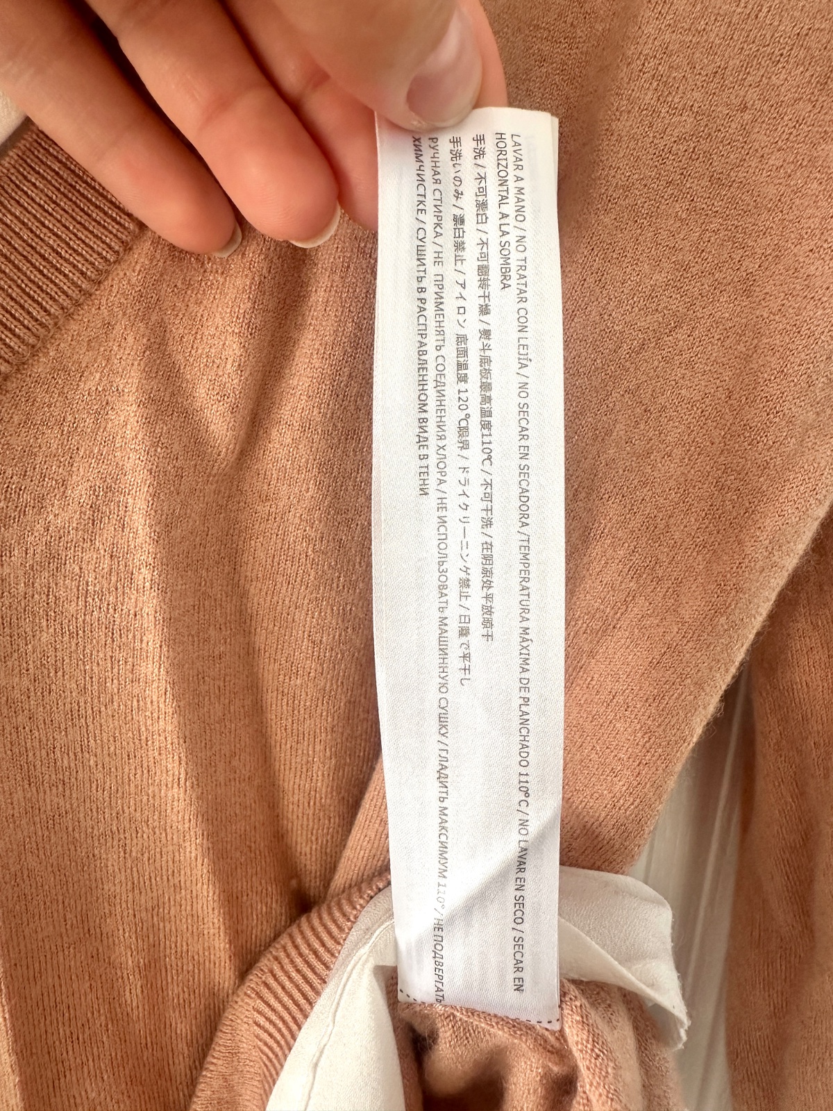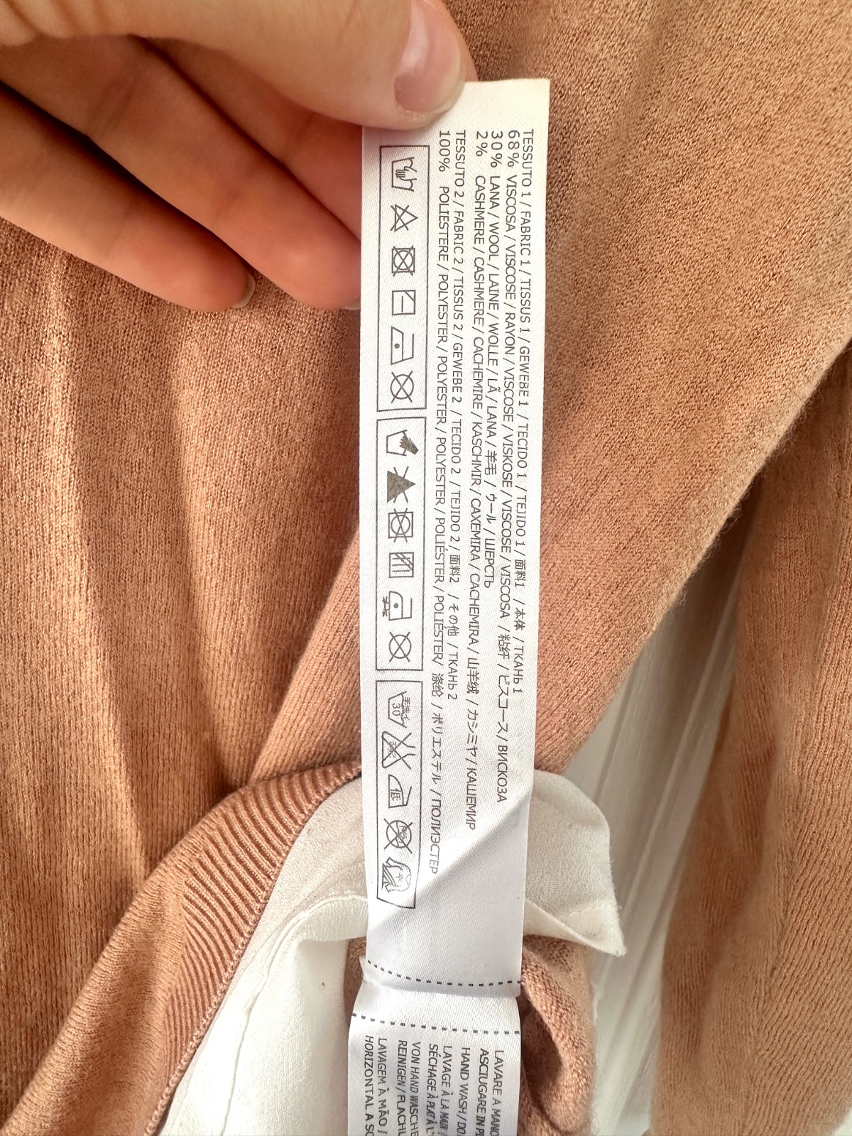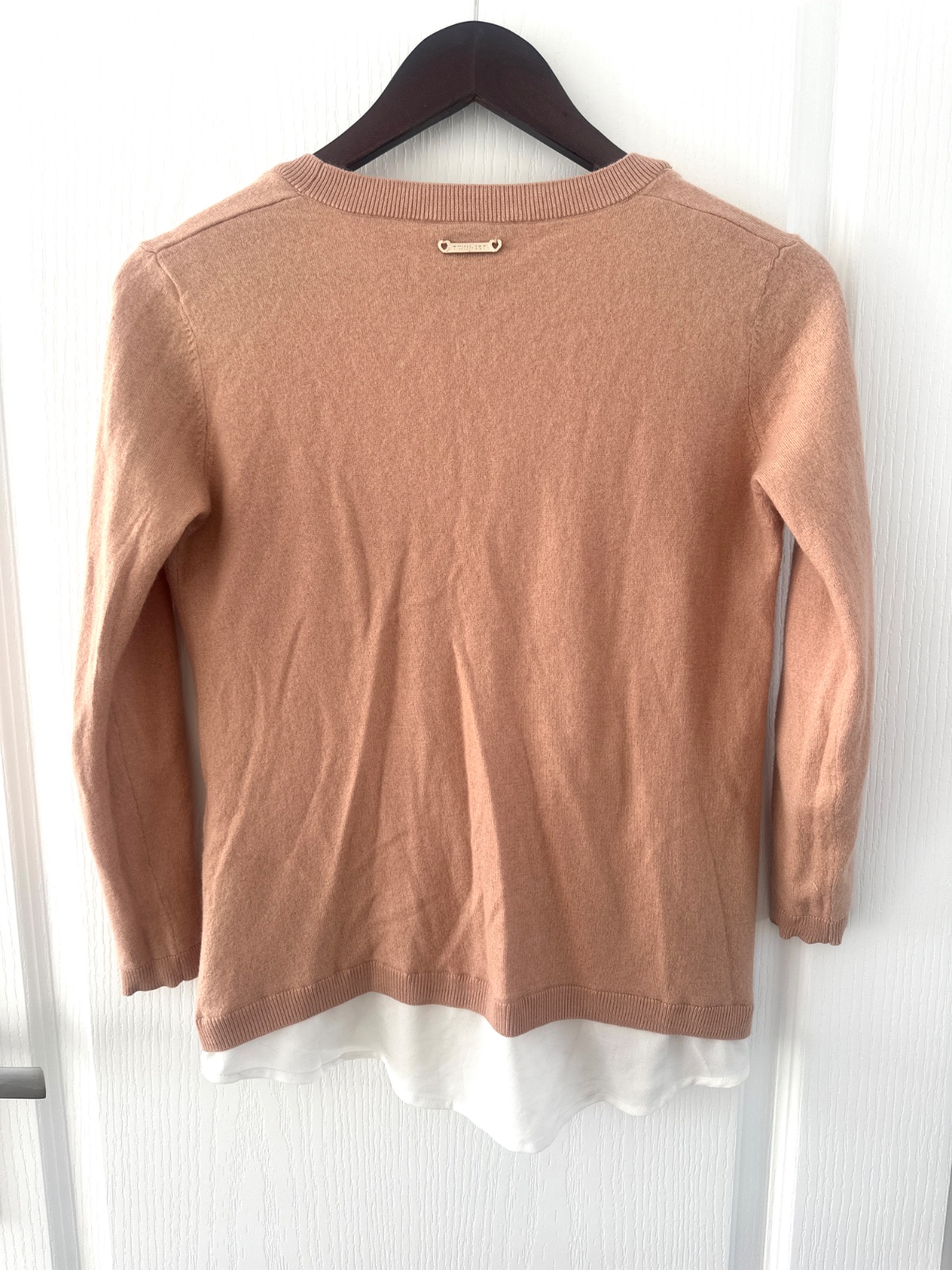 Sveter Twinset prémiovej značky v krásnej béžovej farbe. Sveter má 3/4 rukávy a výstrih v tvare V zdobený bielym materiálom. Biely materiál zdobí aj spodok svetra. Celé to pôsobí, ako keby pod svetrom bola biela blúzka. Sveter má veľmi dobré zloženie: 68% viskóza, 30% vlna a 2% kašmír. Na zadnej strane pri výstrihu je zlaté logo značky. Sveter je veľmi pekný a príjemný na dotyk. Veľkosť na štítku je XS, ale vyzerá skvele aj na veľkosti S.
