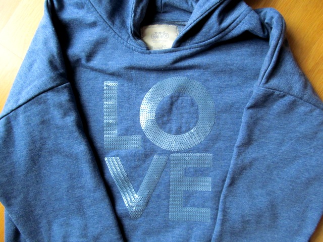 stredne hruba mikina riflovej farby, kapucna podsita, na spodnom okraji 1 funkcny zips, aplikacia vpredu je z flitrov ton v tone, minizmolky z prania, inak bez chyb. Rukav od krku 66 cm, sirka pod pazuchou cca 51 cm, dlzka od pleca cca 57, vzadu asi o 1 cm dlhsia. Komercne foto sivej farby je pre lepsiu predstavu o aplikacii.