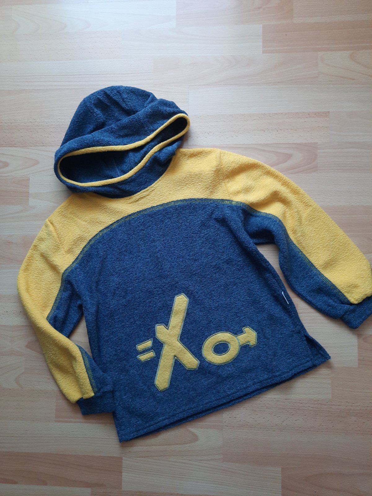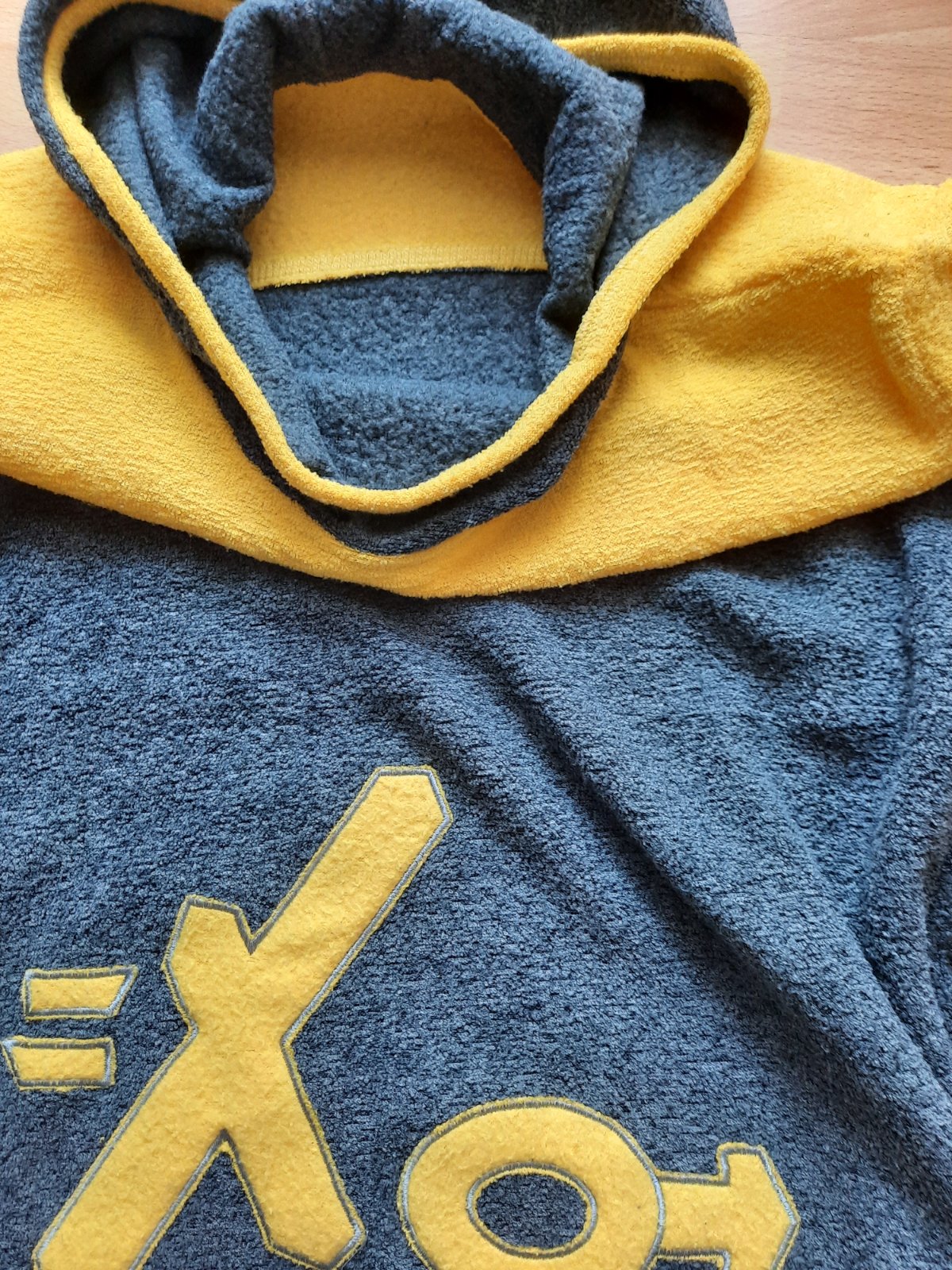 Predám pulóver (mikinu) s kapucňou v sivej farbe v kombinácii so žltou.Na prednej časti s malou ozdobou písmen. Je vo veľmi dobrom stave, bez dier a fľakov, z príjemného mäkučkého materiálu-mierne zateplený zvnútra.