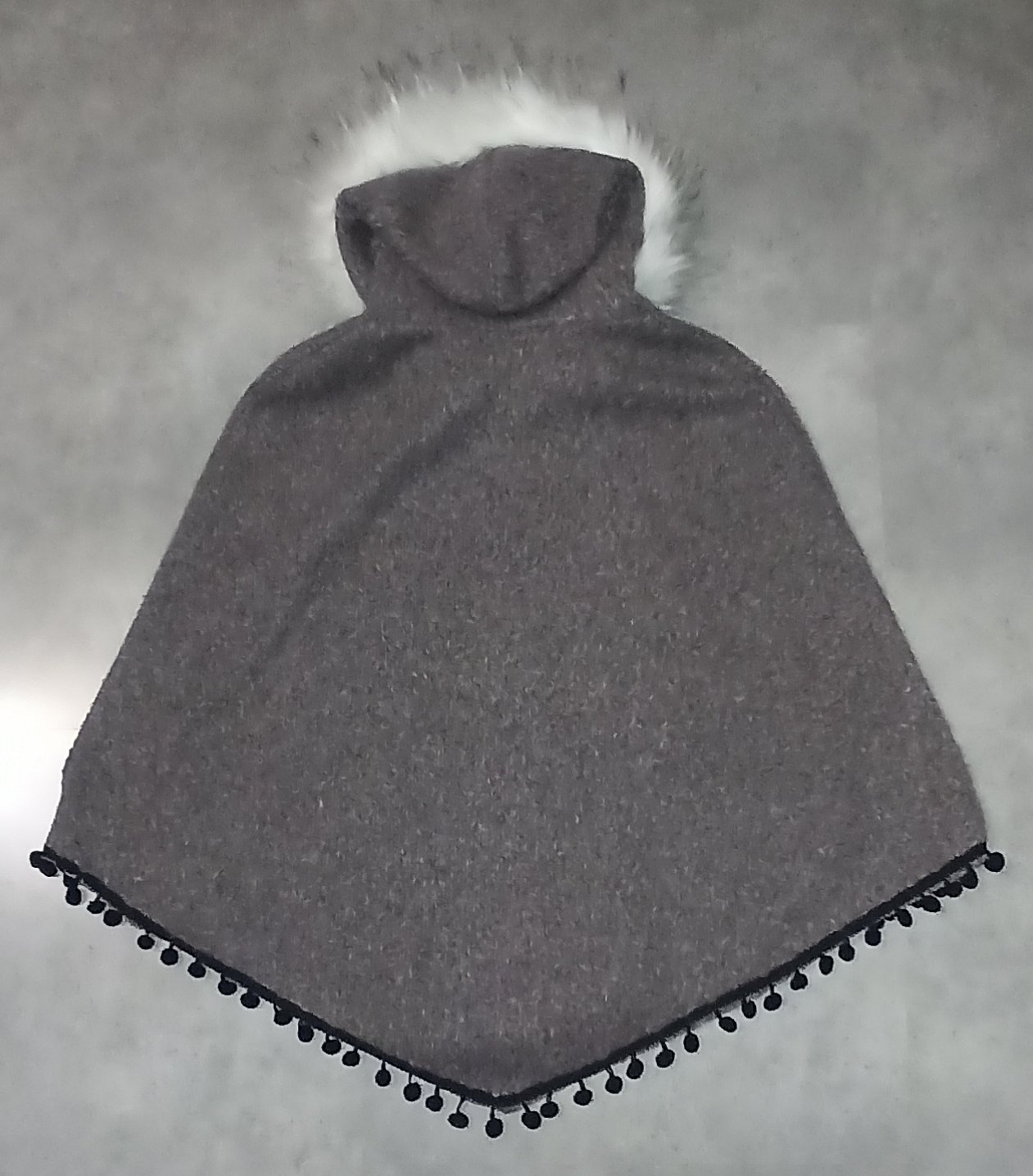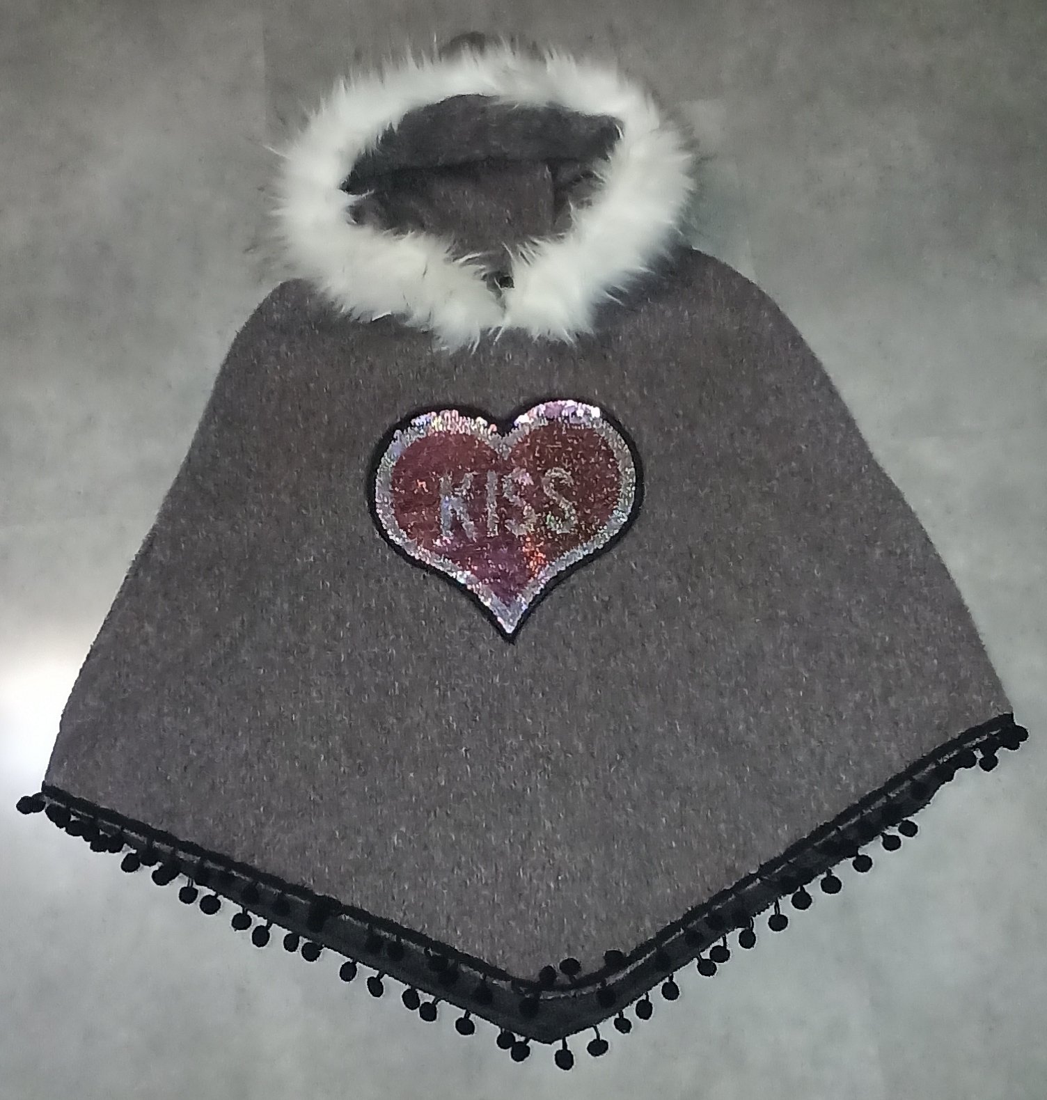 Teplé hrejivé dievčenské pončo s kapucou s bielou kožušinou a dvoma otvormi na ruky. V strede meniaci sa trblietkový nápis KISS. Dľžka ponča v strede od ramena 65 cm.