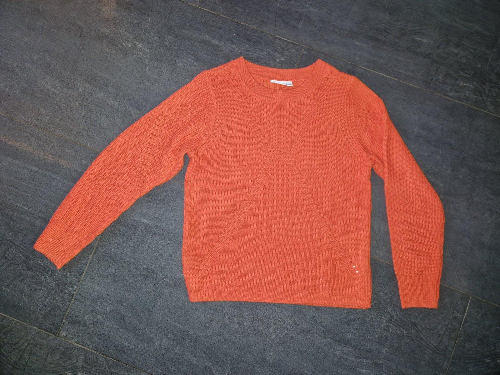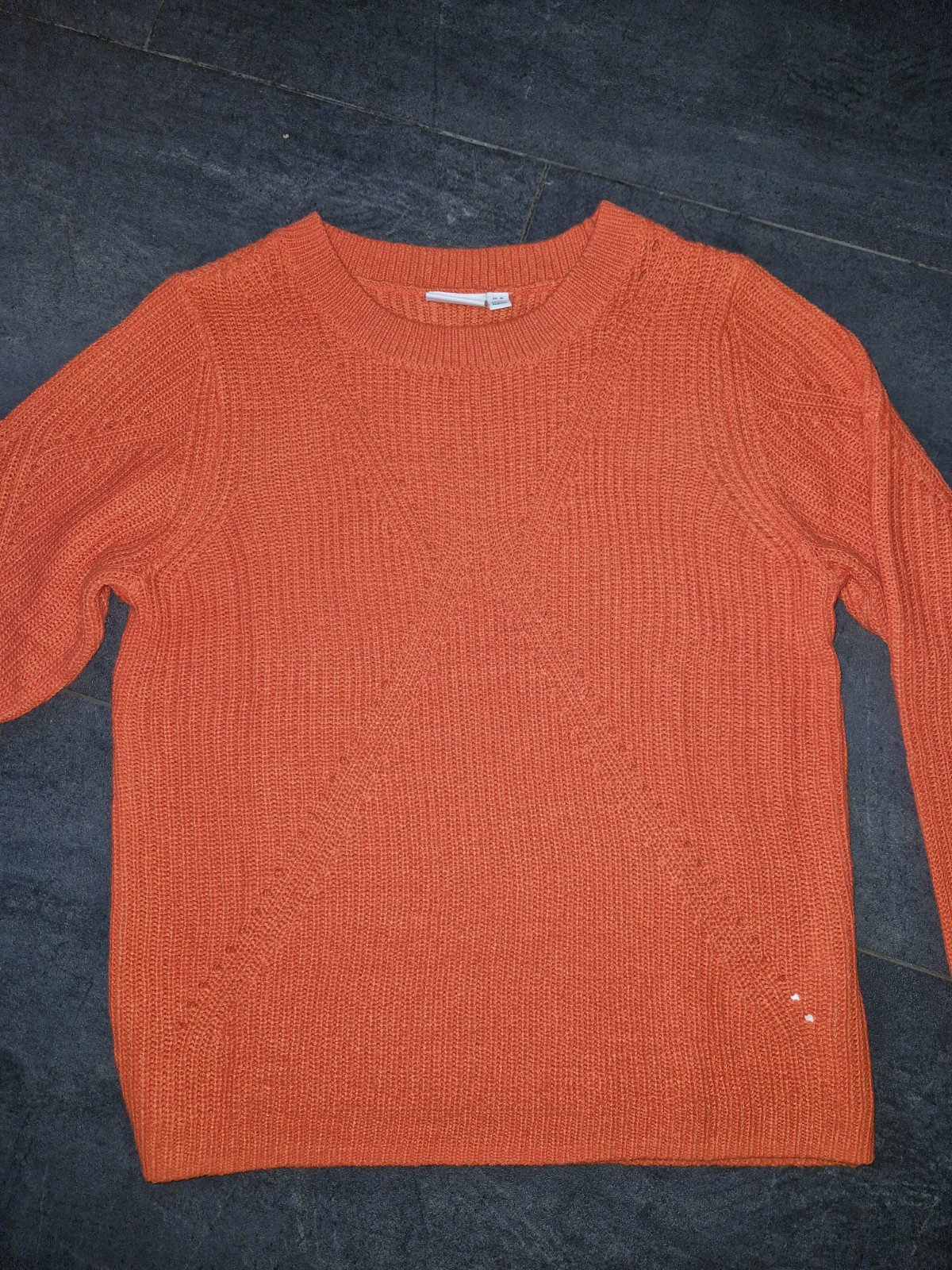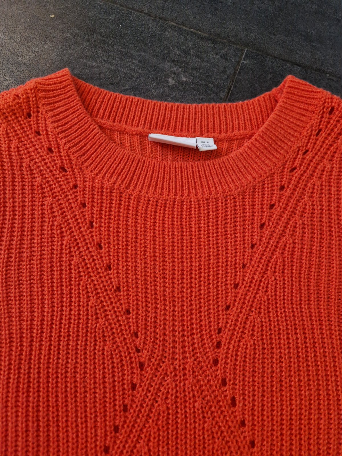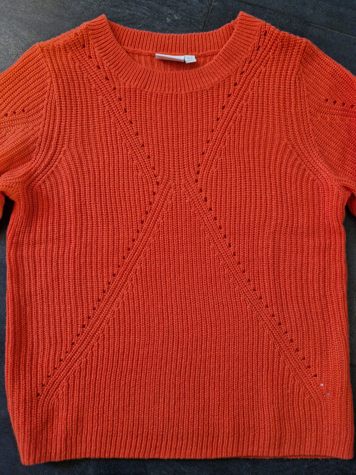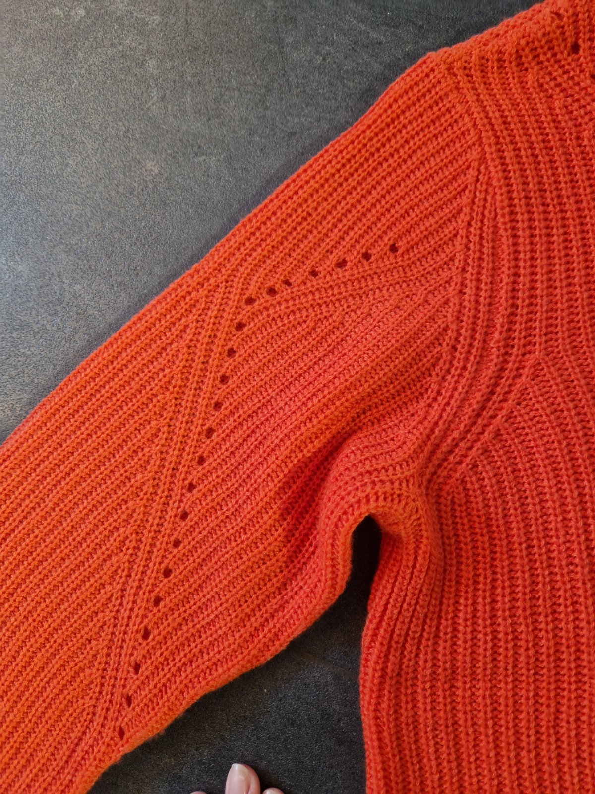 Super stav, max 2x oblečený. Výrazná mrkvová farba. Efektné dierkovanie. Stredne hrubý. Šp paz 50, dĺžka 62, rukáv s plecom 8+66