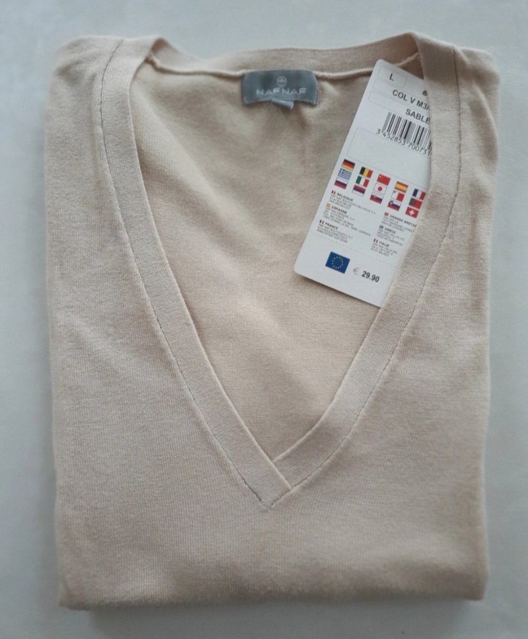 Velkost pisana L, ale je dost tesny, preto zaradeny v M a preto ho predavam
