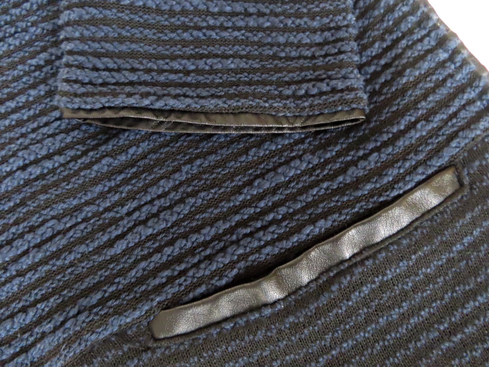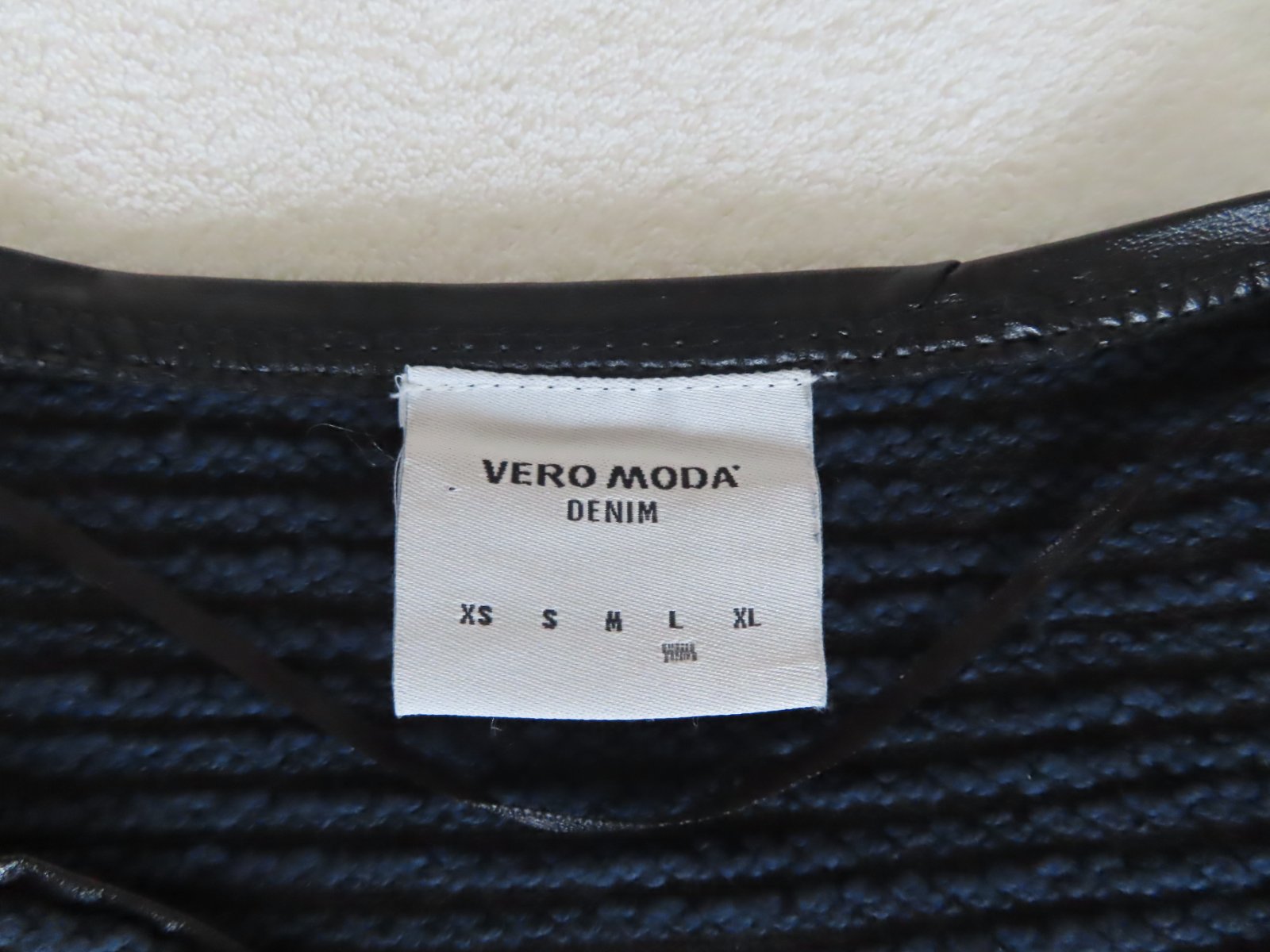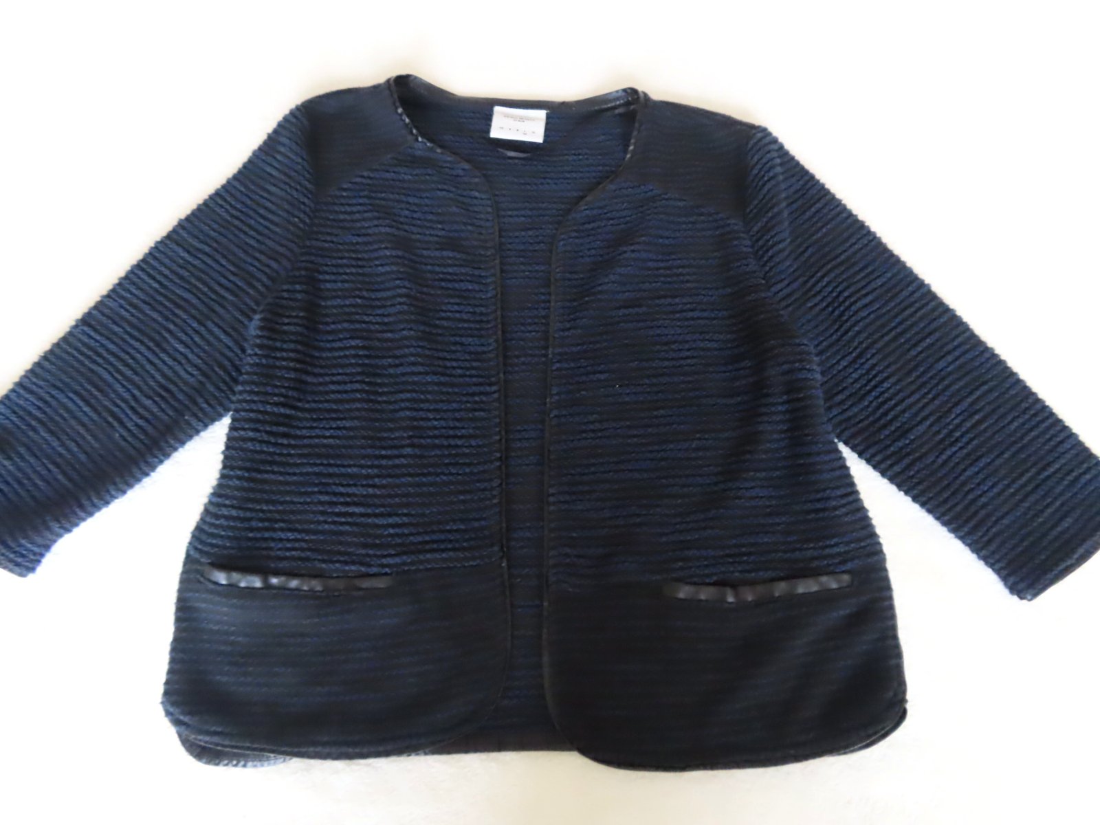 Dámske bolerko Vero Moda, kombinácia farieb tmavá modrá a čierna, lemované čiernou koženkou.