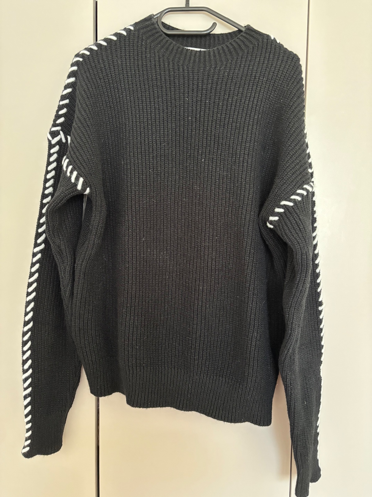 Čierna farba s výrazným bielym dekoratívnym prešívaním na rukávoch, ktoré dodáva svetru moderný a štýlový vzhľad.