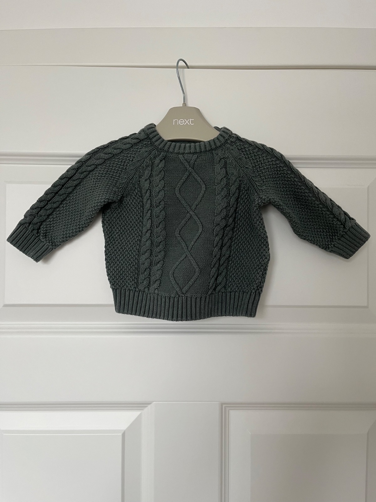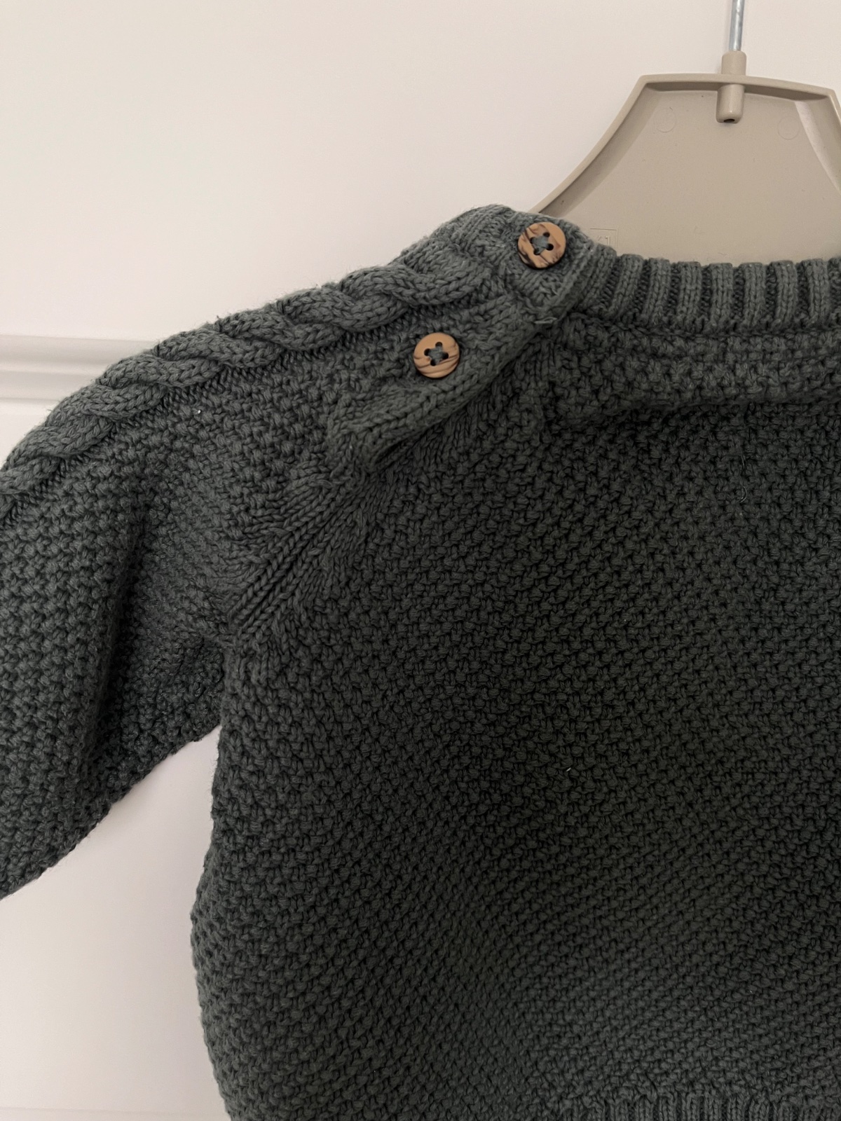 C&A, velkost pisana 3-6mes, skor mensi, pekna sivozelena farba, zapinanie pri krku na drevene gombiky