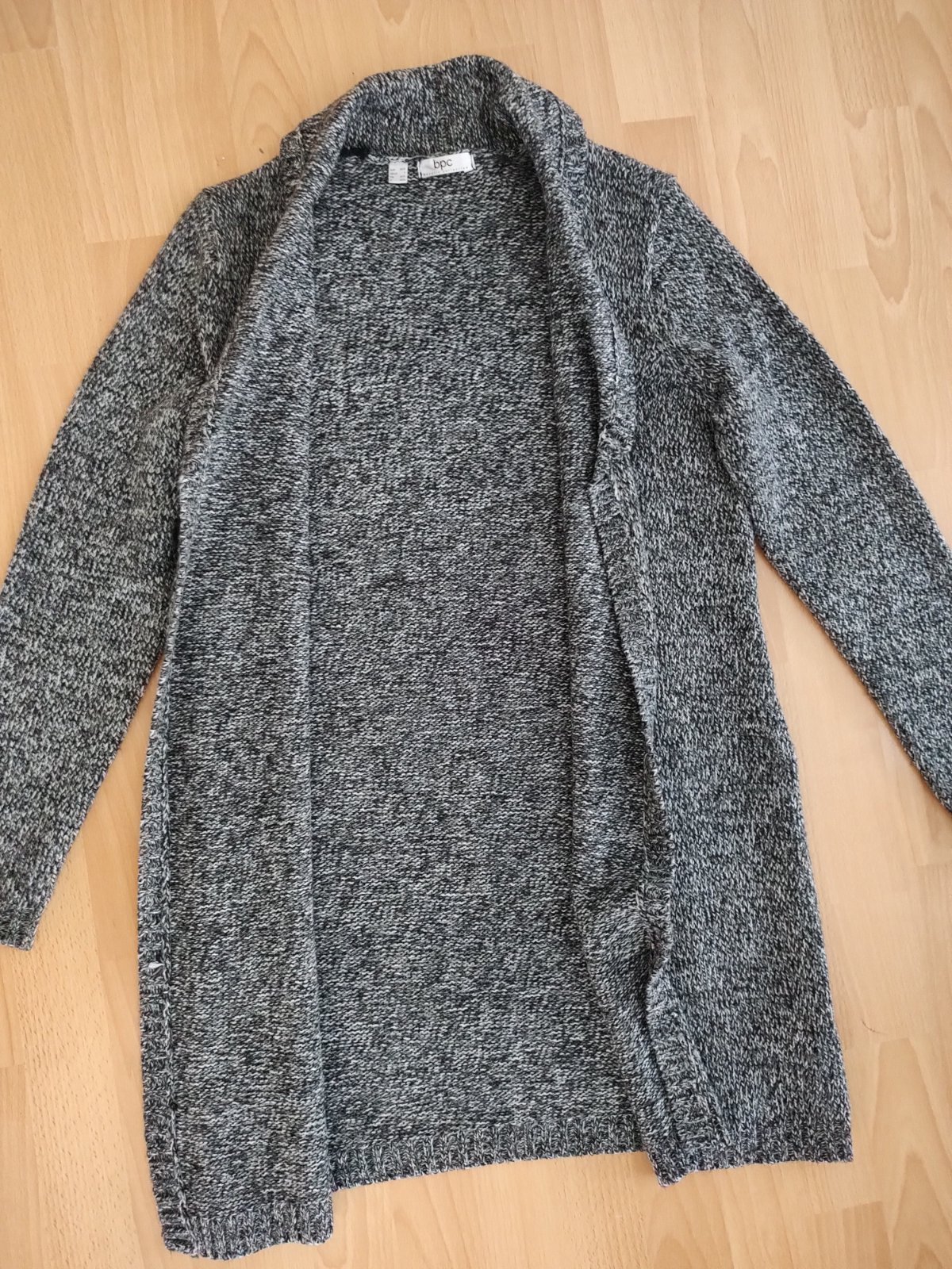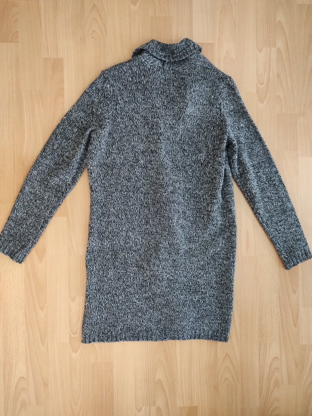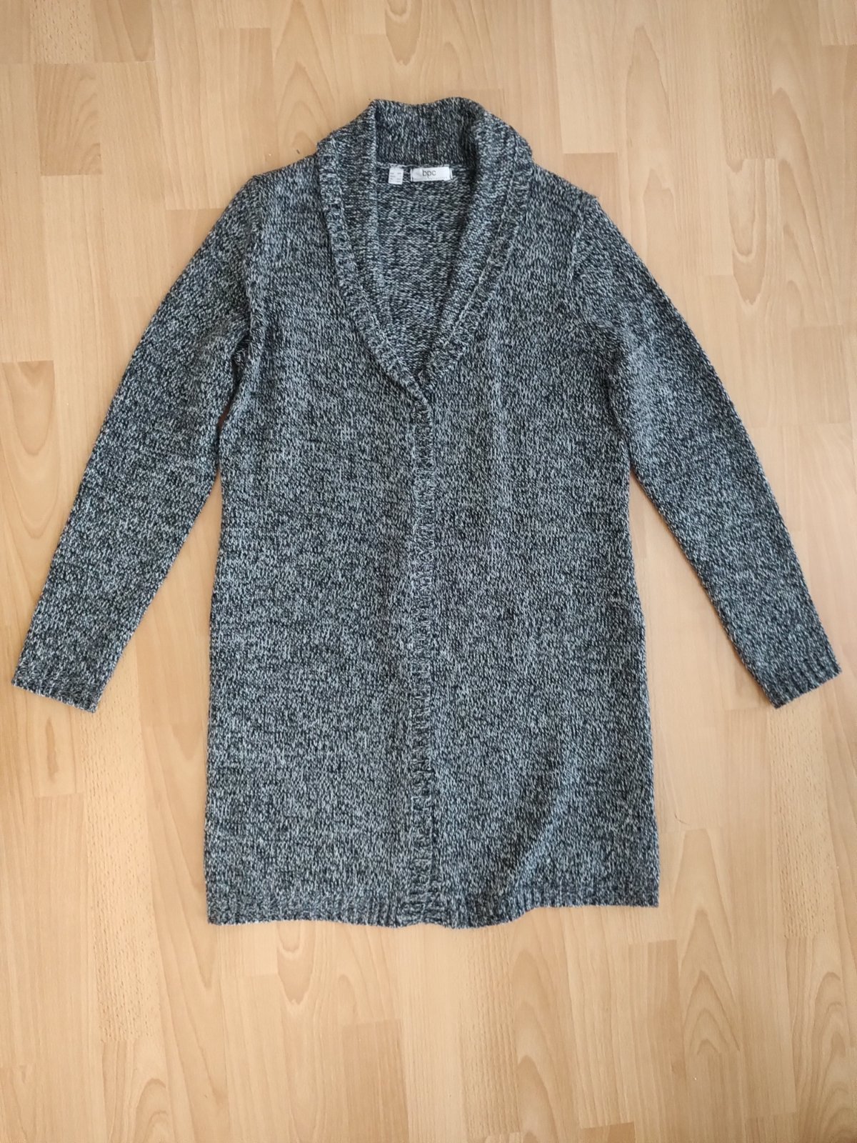 Tmavošedý melirovany predĺžený sveter, bez zapínania, ľahký,no teplý. Párkrát oblečený, stále v top stave. Veľkosť uvedená 36/38. Ideálny na veľkosť M