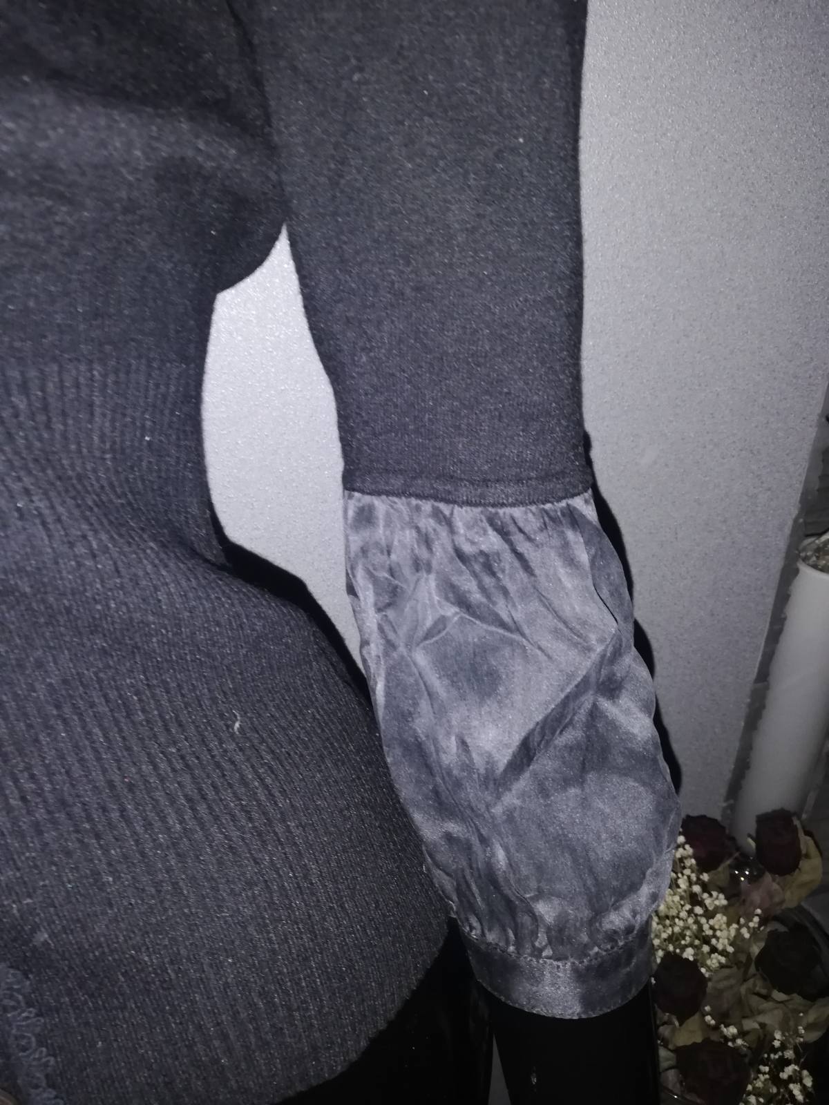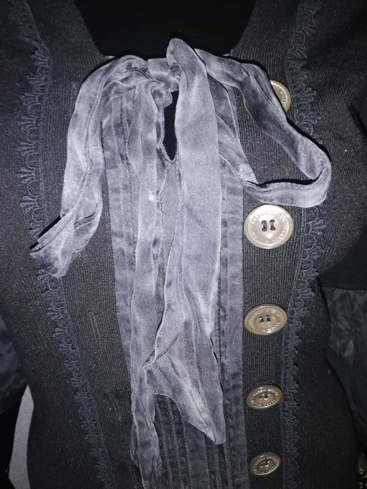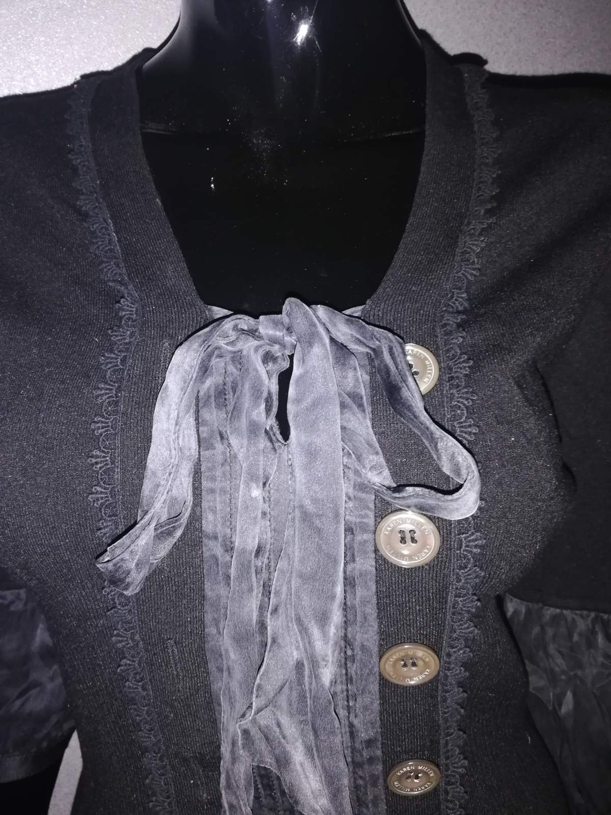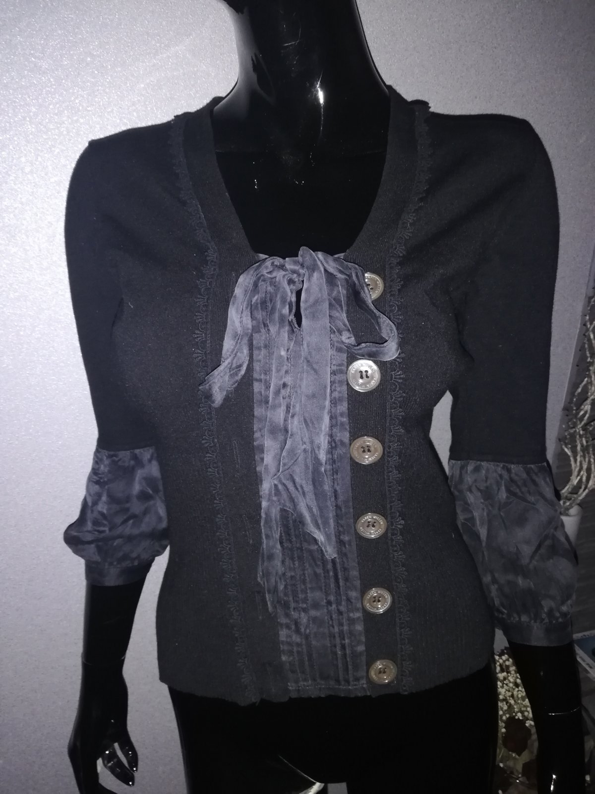 Výborný stav,kvalitka,nezmolkuje sa, pružné,čierne, šedé hodvábne rukávy a viazacka, veľkosť 2, sedí na S/M,s.pod pazuchami 43 cm,d.56 cm