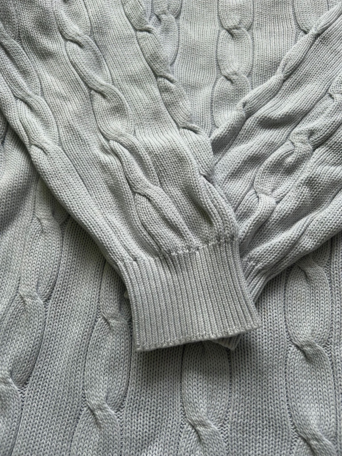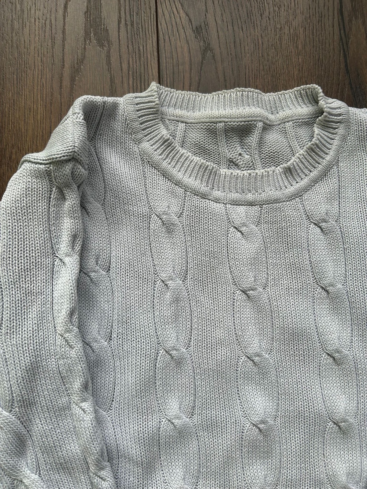 Svetlomidrý sveter, nosený.