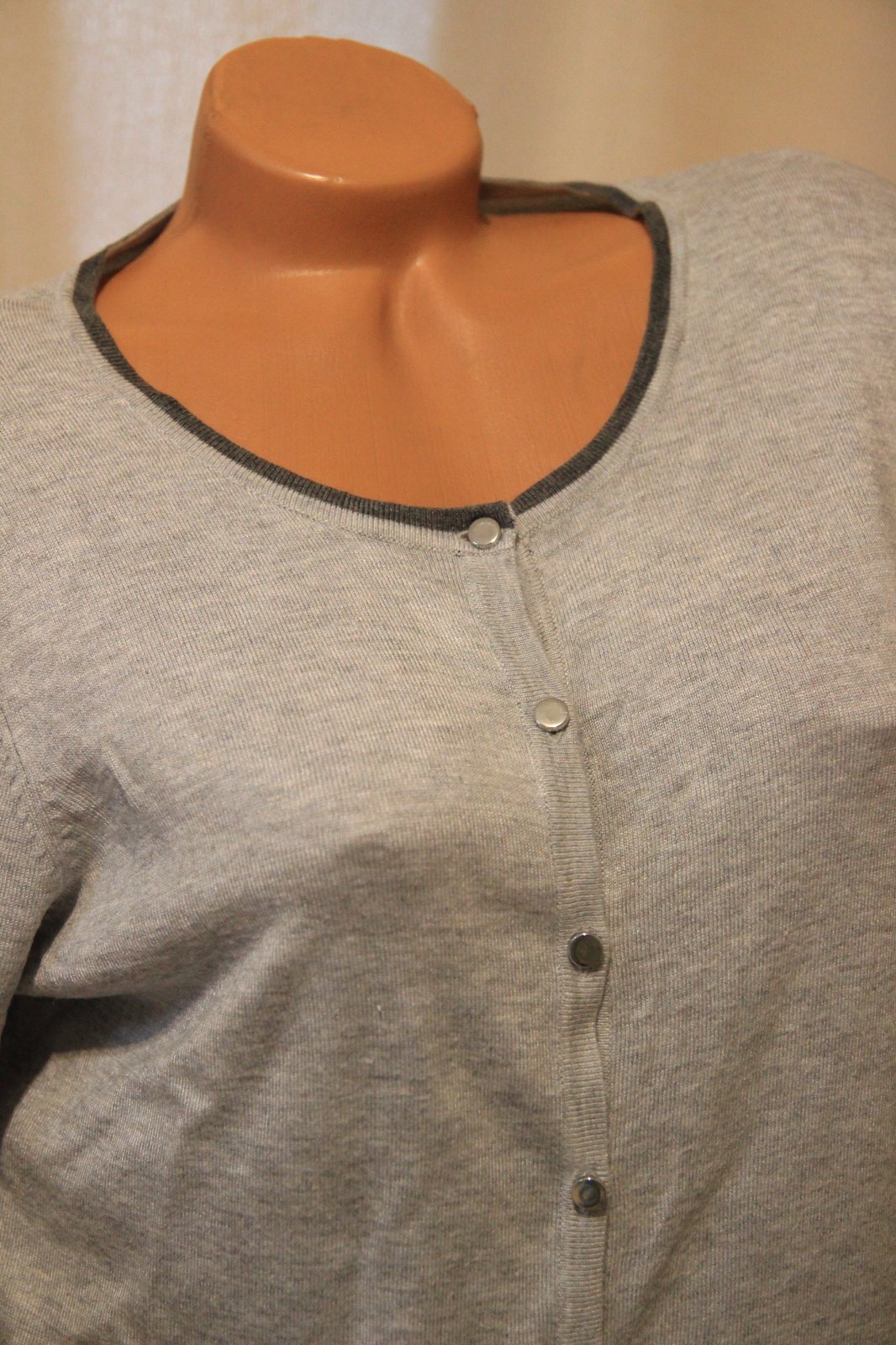 Bledo šedý kardigan na gombíky, veľkosť XL. Dva gombíky na spodku sú ošúchané.