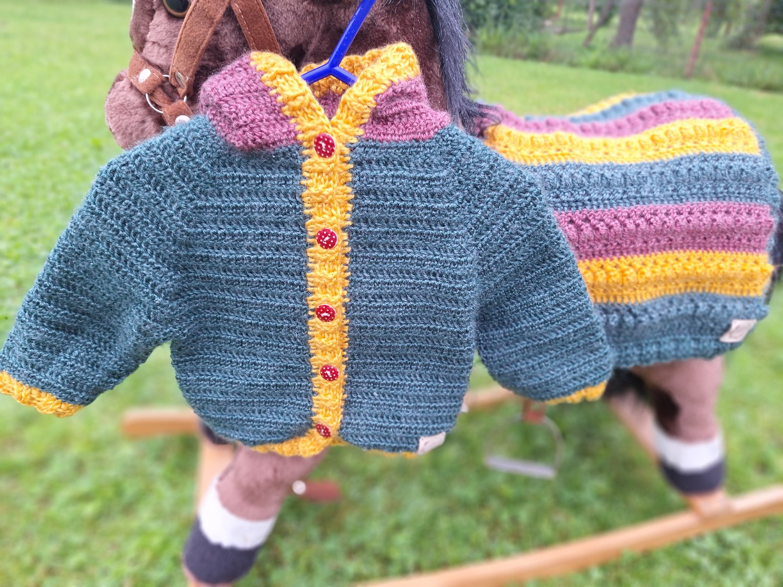 Pekný pletený svetrík z príjemného materiálu, ručná práca, veľkostne to odhadujem na tých 62, ale ponosíte dlhšie... Sú k nemu zladené aj čiapočky a ponožky, všetko vo veľmi dobrom až top stave, až...