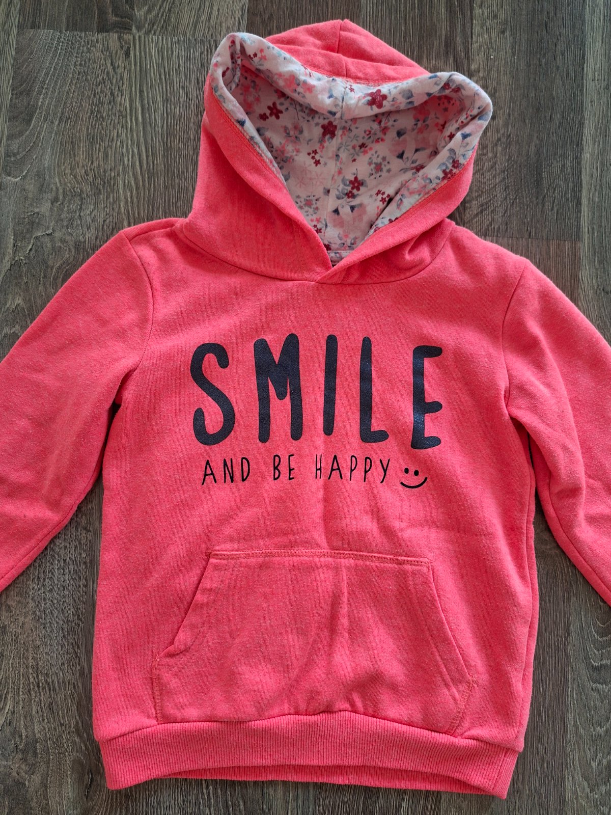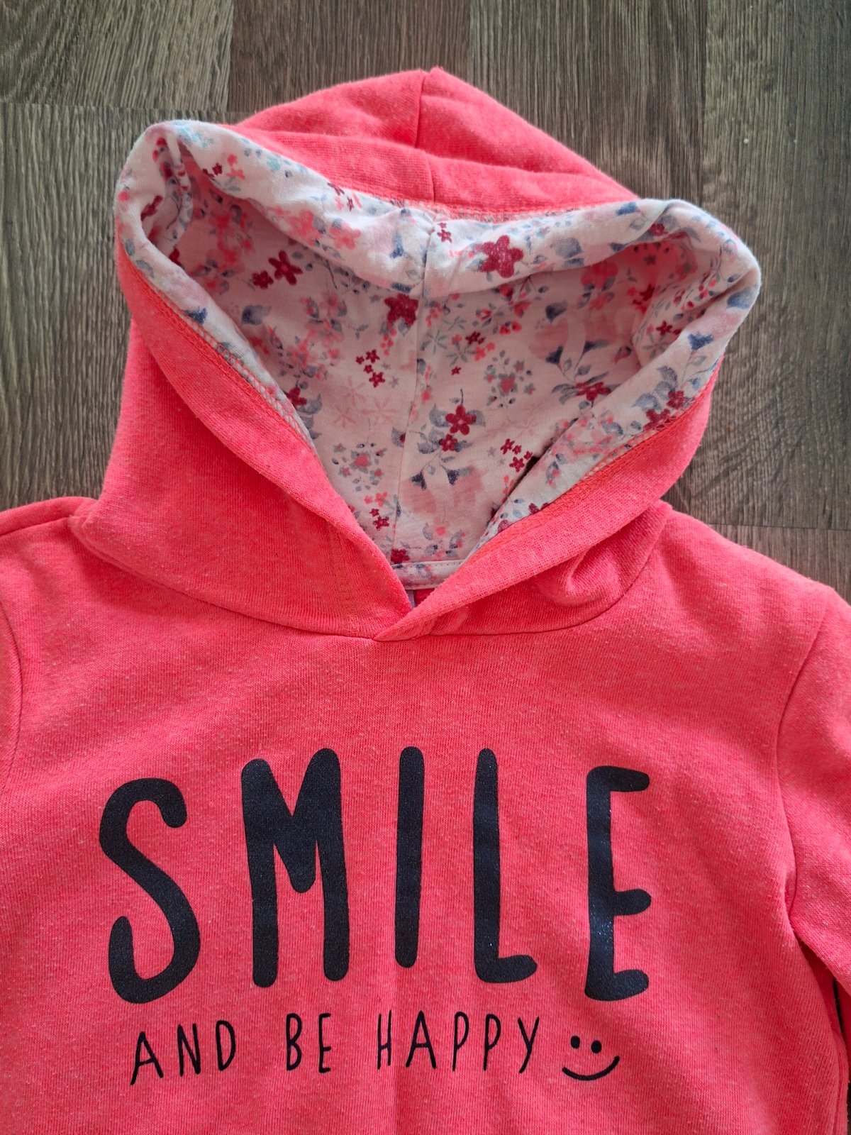 Roztomila mikina krasnej kriklavej ruzovej farby s kvietkovanou kapucnou a napisom SMILE and be happy.