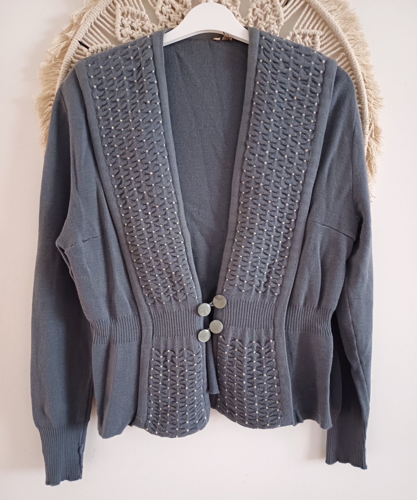 Sedy svetrik na zapinanie / gombiky. Velmi prijemny material. Noseny, ale velmi zachovaly. Velkost vacsie M az L