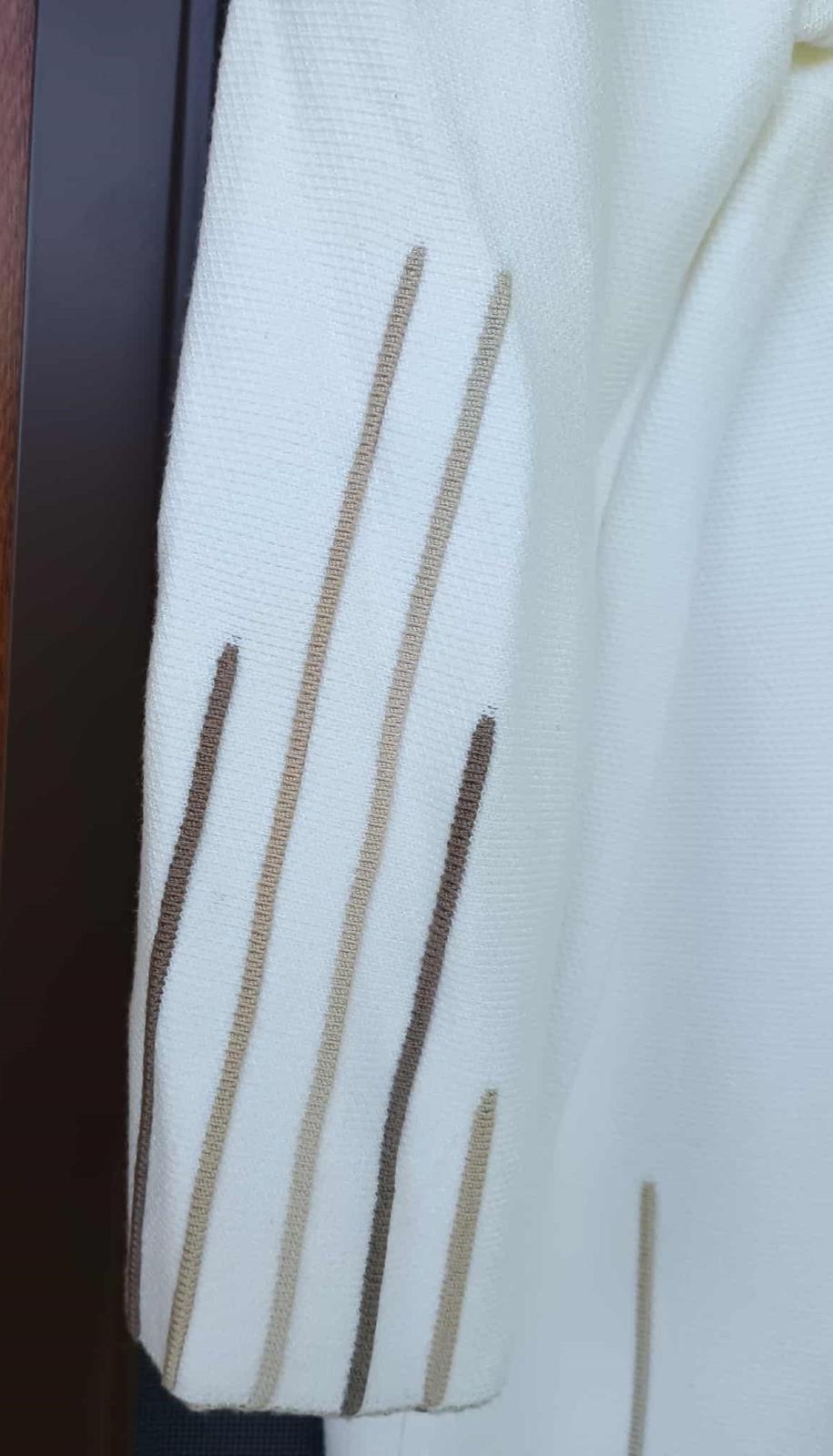 Teplejší svetrík, nosení príležitostne, bez poškodenia. Šírka 2x56 cm, dlžka 72, plece + rukáv 10+52 cm. Materiál elastický, farba smotanová