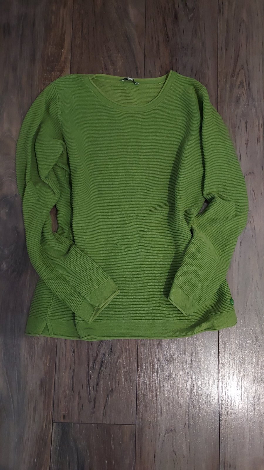 Asi trikrát oblečený svetrík značky Tom Tailor denim. Má zvoncové rukávy a bielo-zelené pásiky, pliešok na boku. Je bez poškodení, ako nový. Veľkosť S. Pôvodná cena 49,99eur.