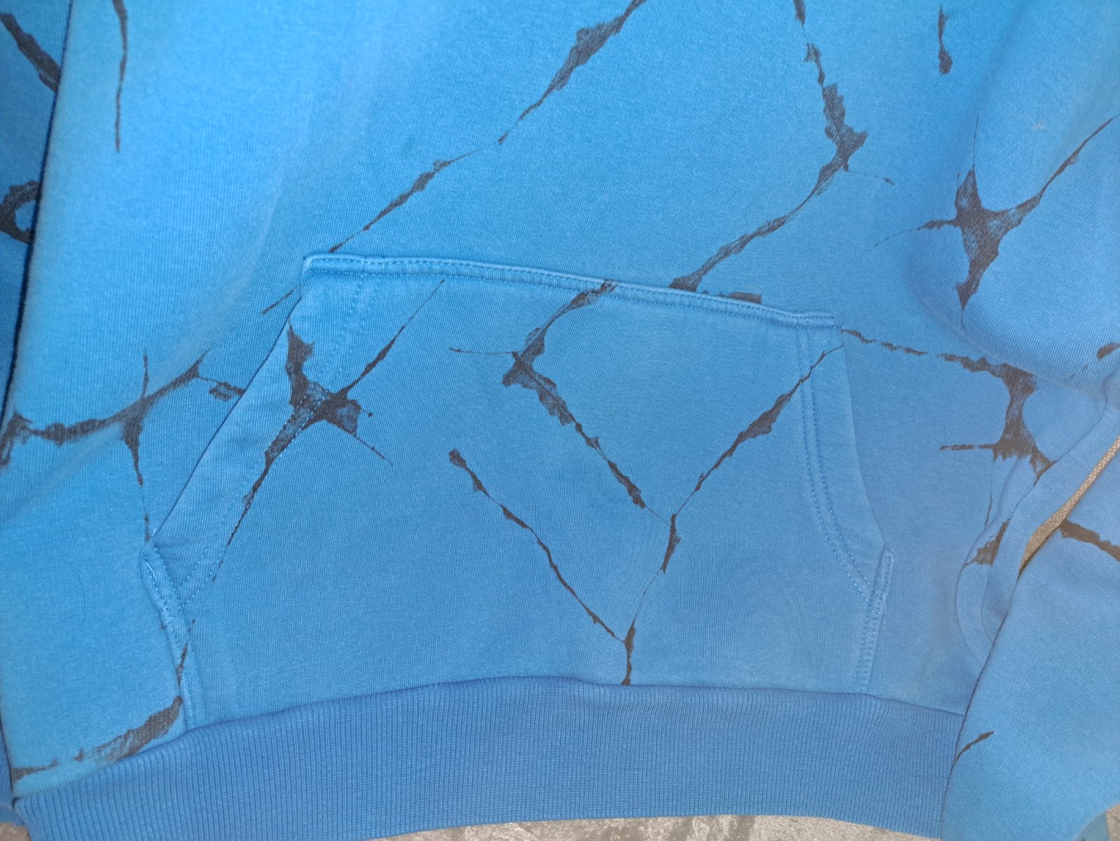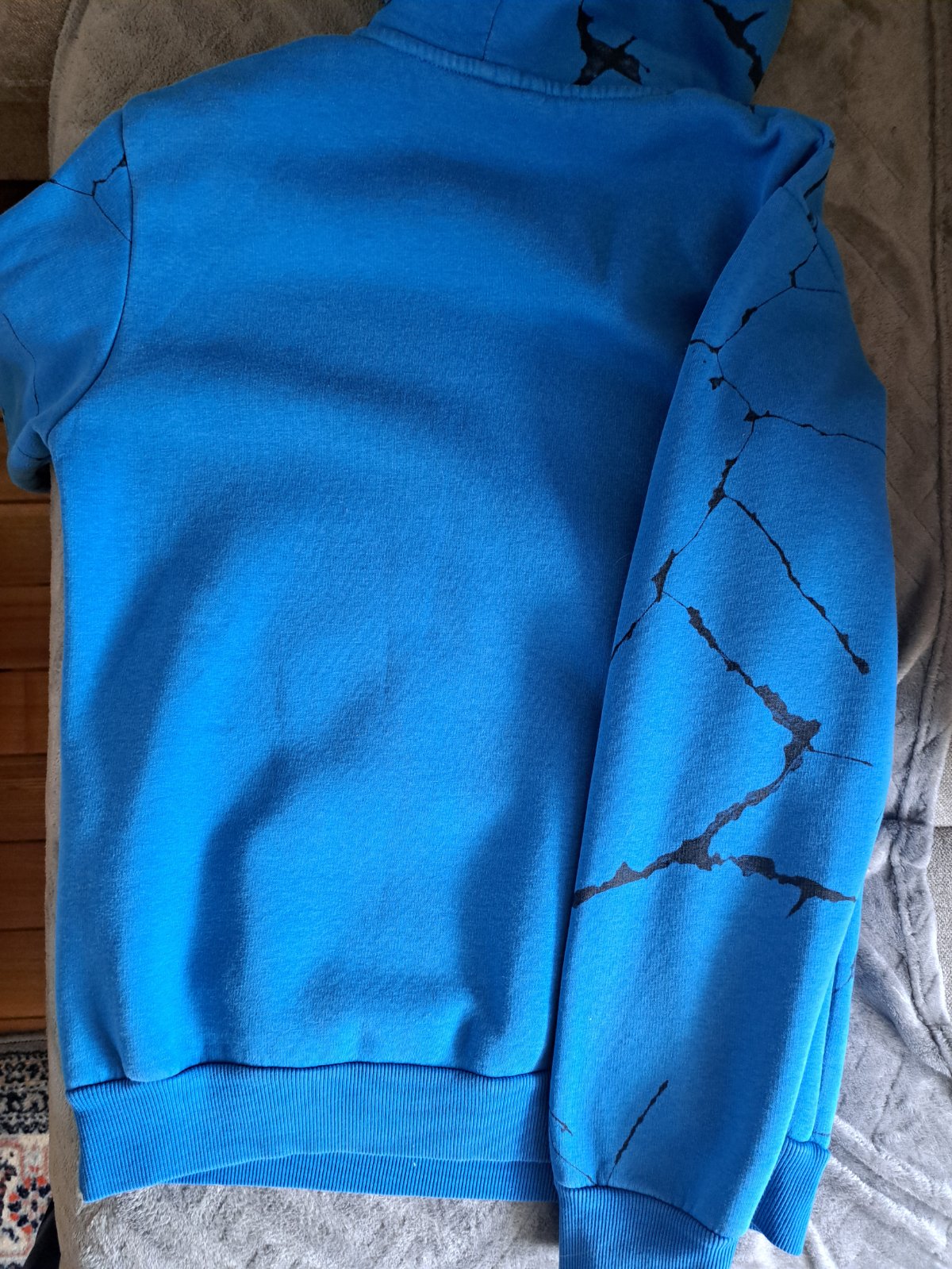 Zachovalá hrubšia mikina. Pod pazuchami 55cm, dĺžka 68cm. Farba je tmavšia (nie taká jasna ako na prvých fotkách). Niekde sa mi zdá ze farba je už vysuchana (tam kde je hrubšie presite) ale pri bežnom nosení nevidno.