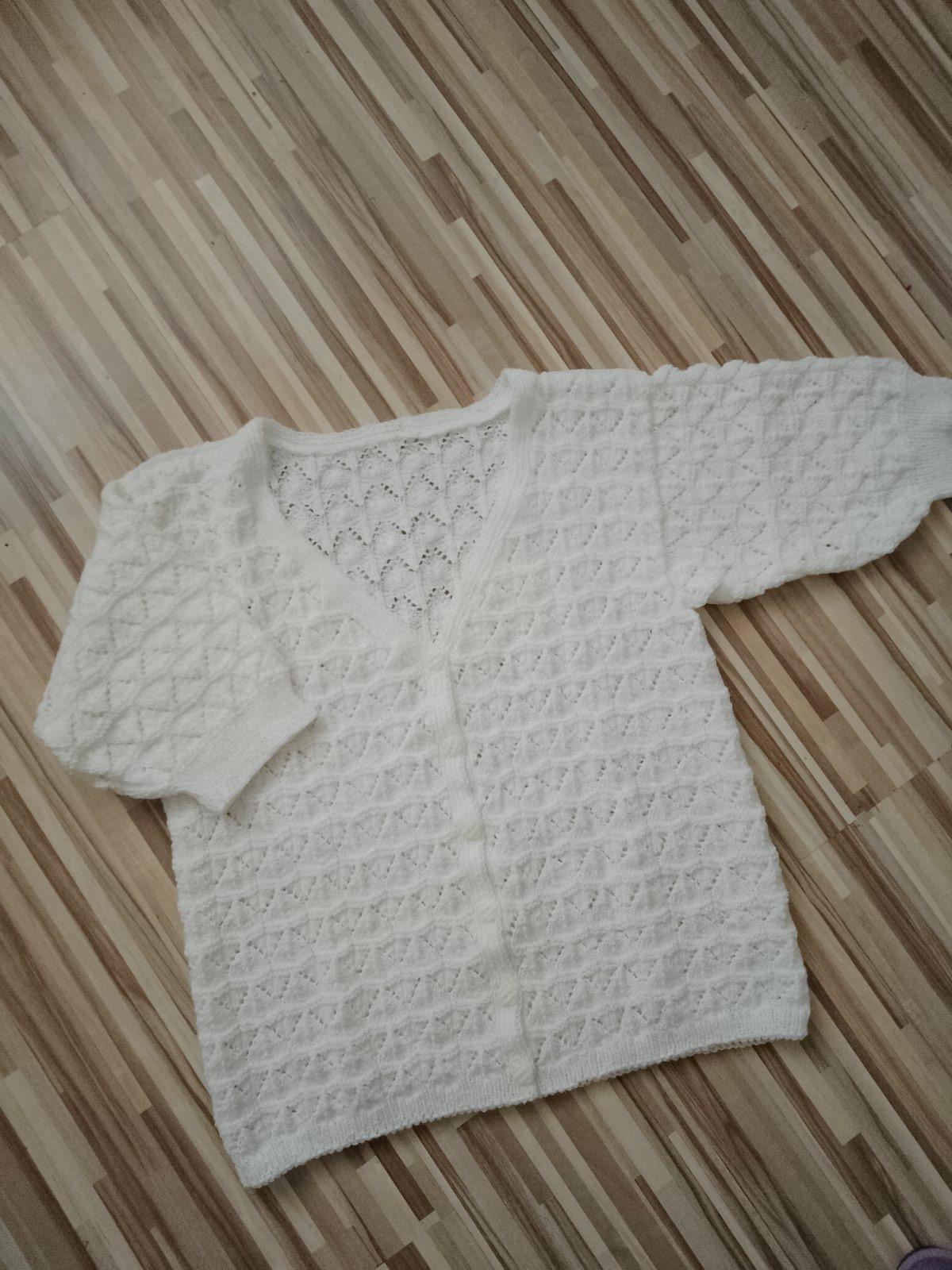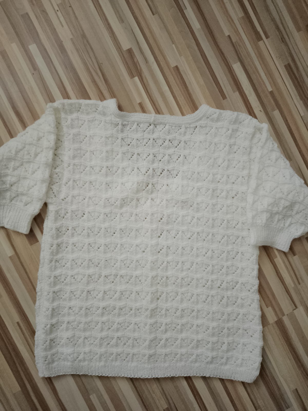Pleteý letný pulóver na zapínanie, krátky rukáv, je mi velký, obvod v kľude 108 CM, je pružný ešte povolí, dľžka59, plece 14, rukáv 29. Nemá žiadne poškodenie je len opraný, nenosené, 12 eur aj s poštovným doporučene druhou triedou
