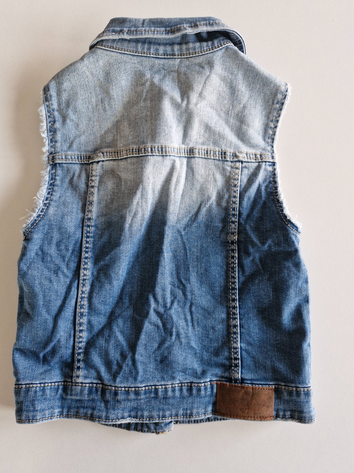 Nádherná riflová vestička, veľ. 128 (7-8 rokov), miestami vyšúchaný vzhľad, veľmi pekná farba rifloviny. Dve klasické a dve náprsné vrecká. Nenosená. Bližšie rozmery na vyžiadanie.