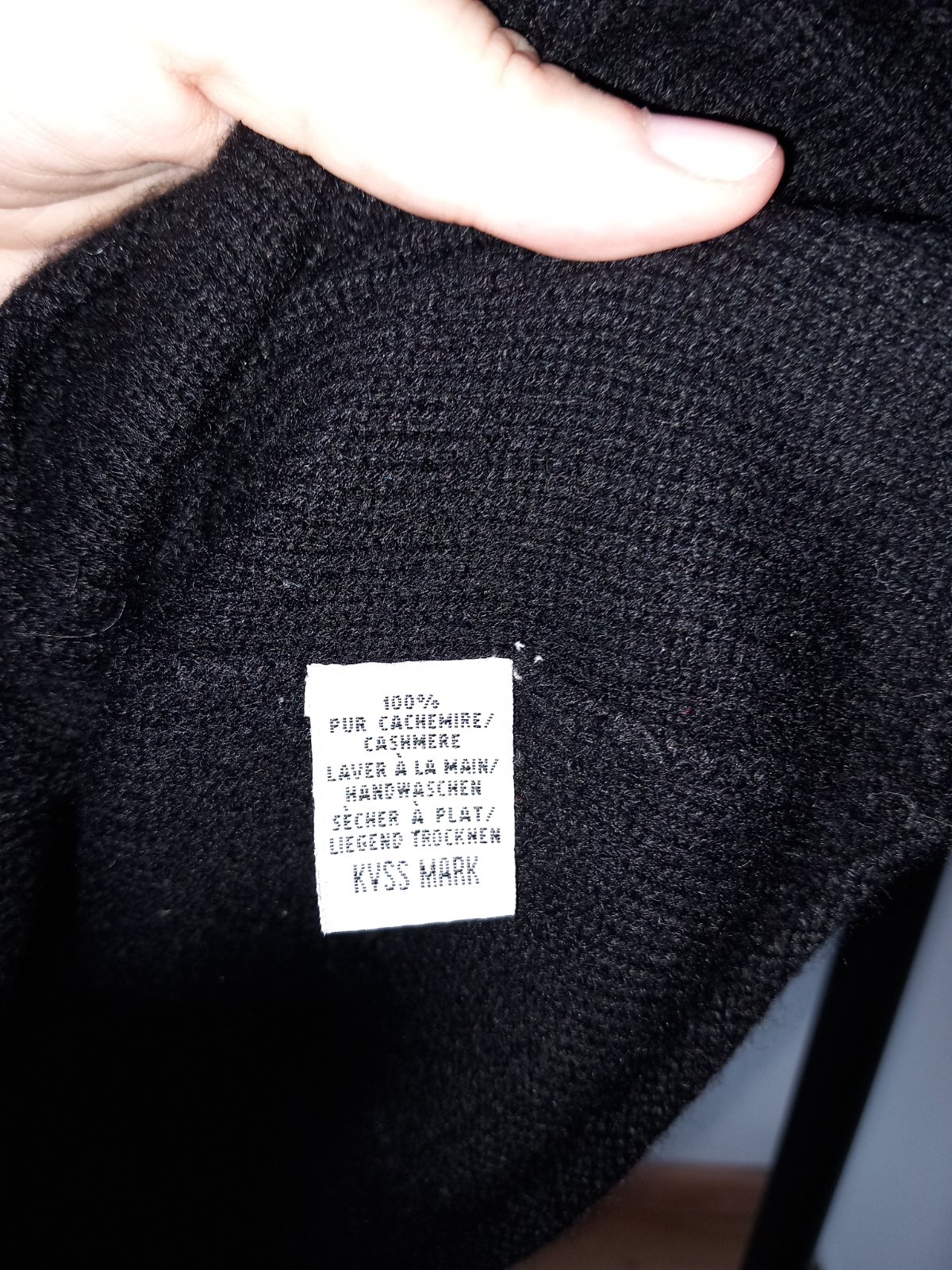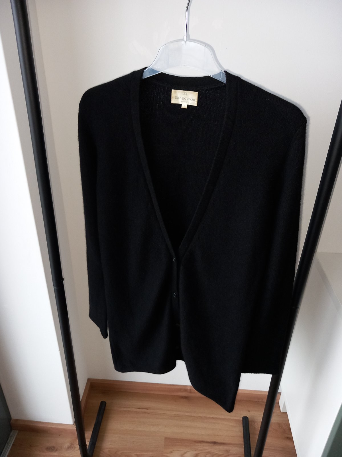Kašmírový kardigán od francúzskej značky Eric Bompard v sýtej čiernej farbe. Kardigán má rovný strih so zapínaním na gombíky. Rukávy a spodný lem sú ukončené voľne s mierne sa stáčajúcimi okrajmi. Pletenie na kardigánrme je obrátené (tzv. obratko je na prednej strane). Je to minimalistický a pritom zaujímavý kúsok a je vhodný do kapsulového šatníka.