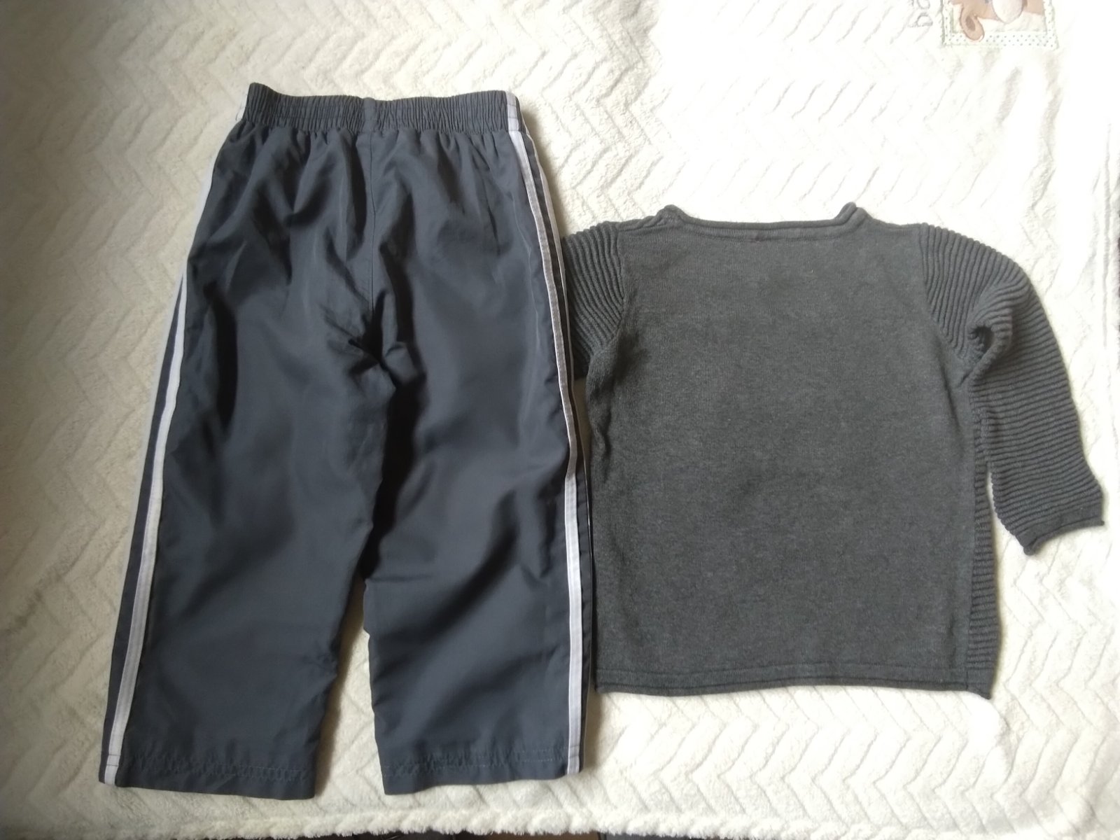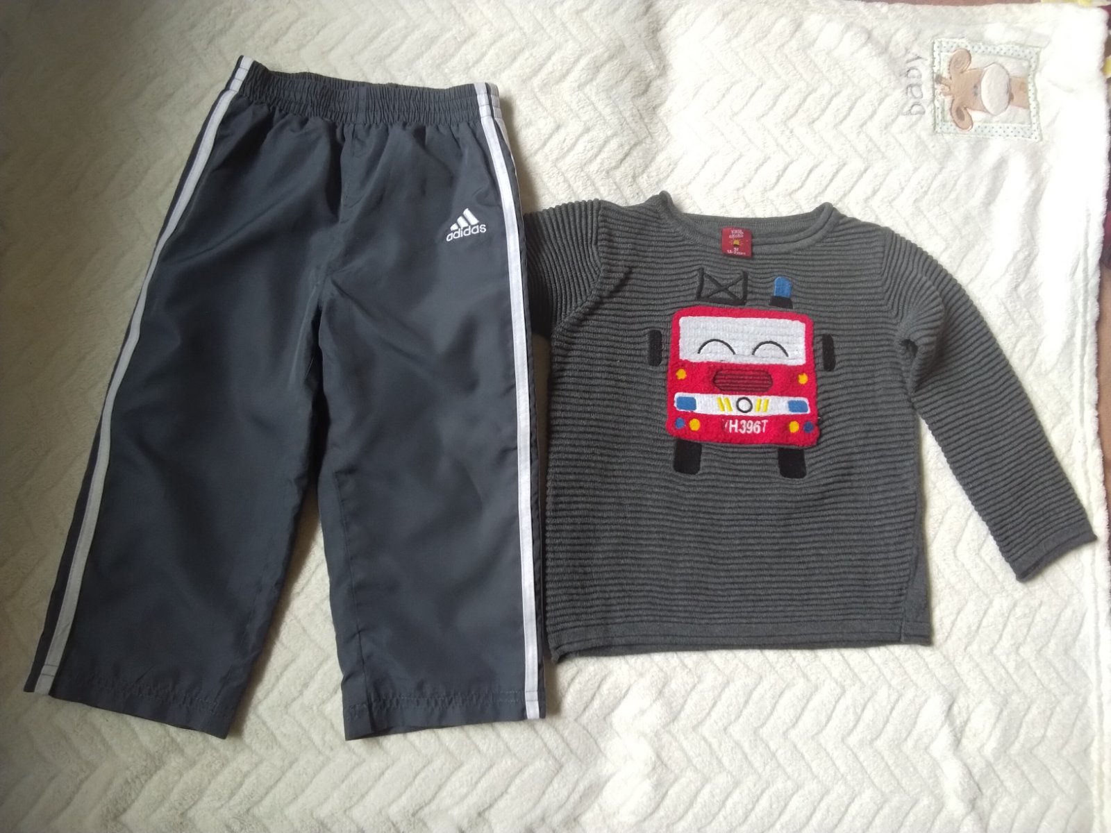 Pekný stav,na1.5-2 roky, dĺžka od ramena 34 cm, dĺžka rukáva od ramena 28 cm, nohavice Adidas veľkosť neuvedenà, dĺžka 48 cm,OP 21 cm×2, cena spolu 4.00€. Je možný osobný odber v DL, po dohovore a kúpe nad 8.00€ aj v Ba na autobus.st., alebo poštou.