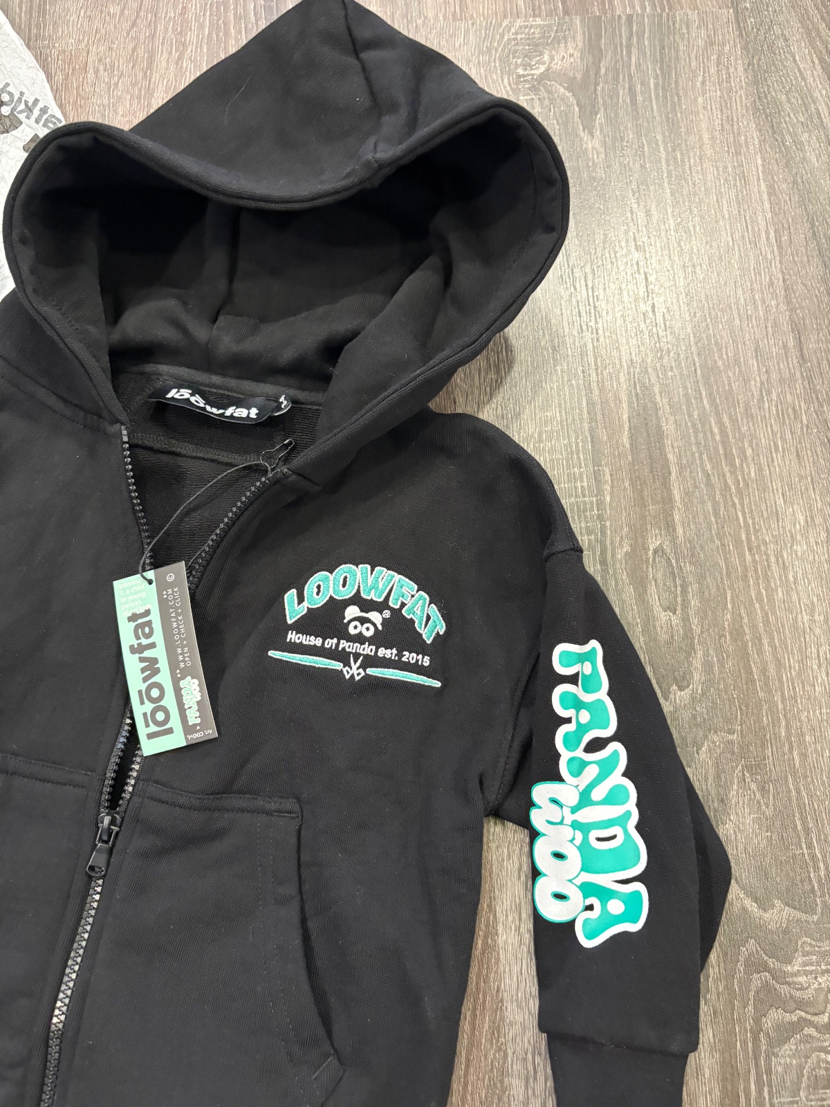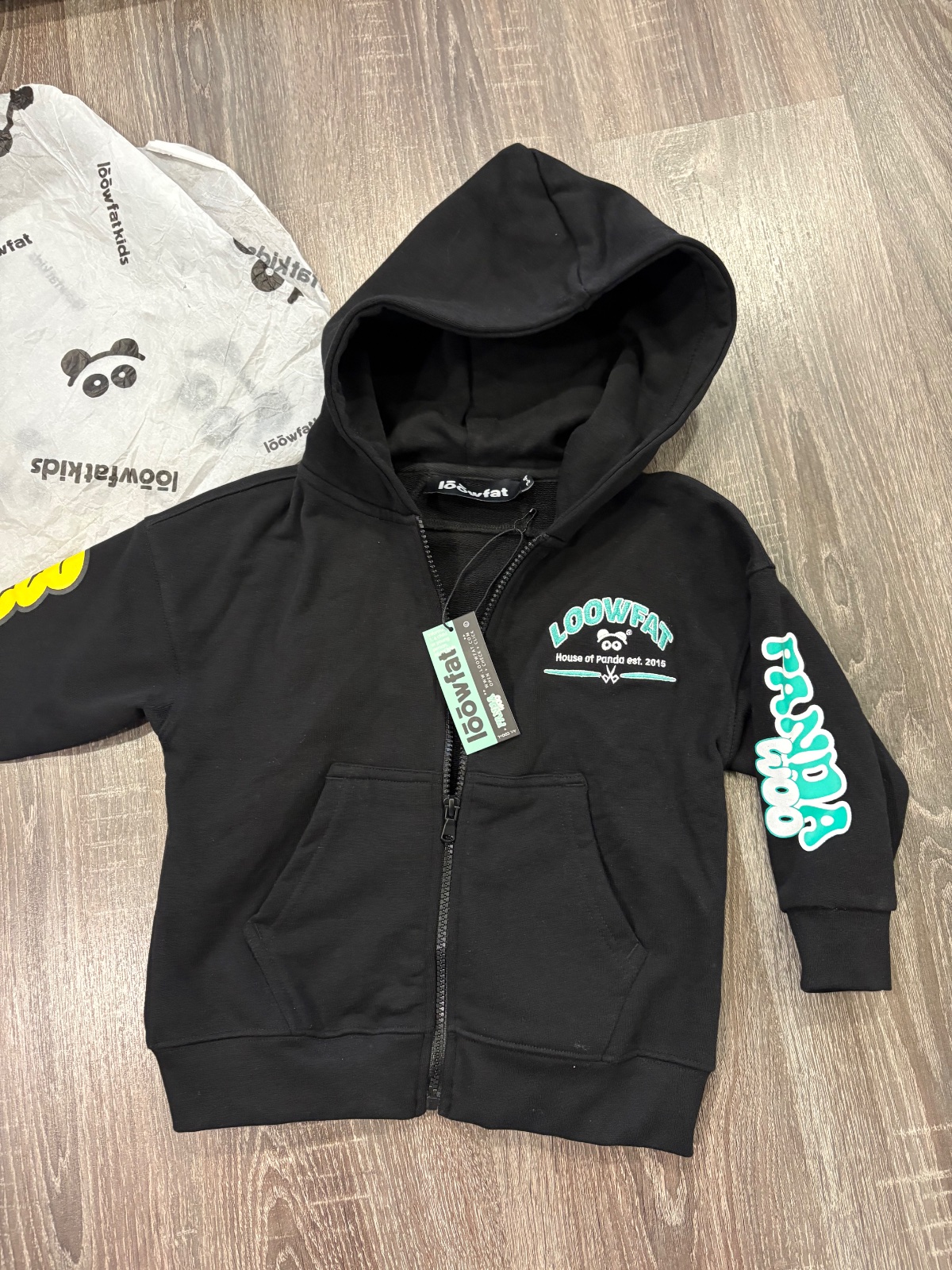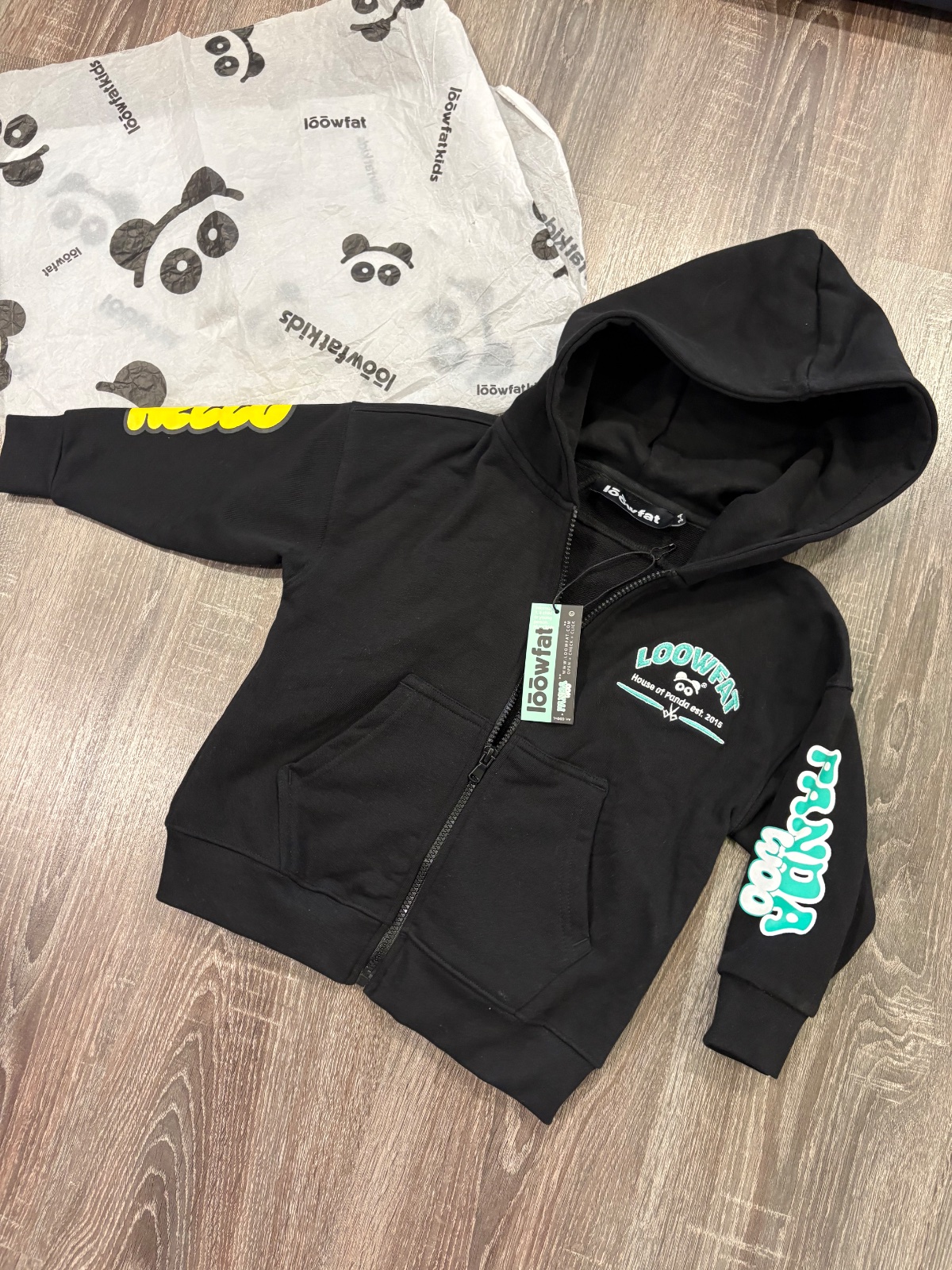 95.Loowfat nova detska mikina s kapucnou,velkost 3-4 roky.Dlzka je 45cm,dlzka rukava od krku je 42cm a sirka v podpazusi je od 41x2cm do 45x2cm
