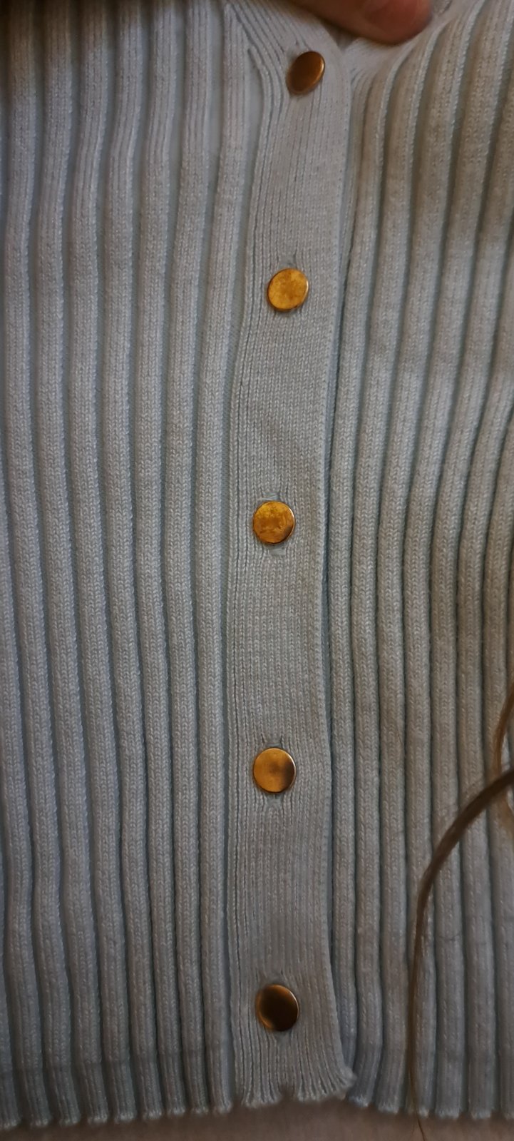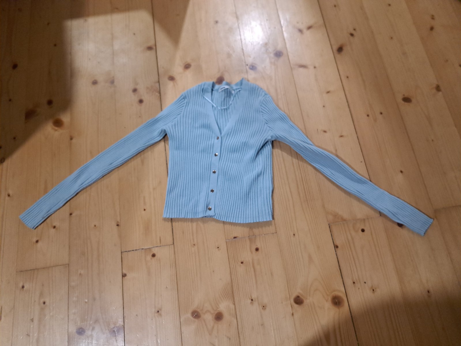 krasne bolerko/svetrik, na saty ci len tak na tricko, nosene len prilezitostne. ma malicke flaky na rukavoch-vid foto, a gombicly su trolinku zodrane (vid foto) ale len naozaj malinko. inak vo velmi dobrom stave, moze sa zdat male na pohlad ale natiahne sa krasne takze pohodlne sa nosi.:)