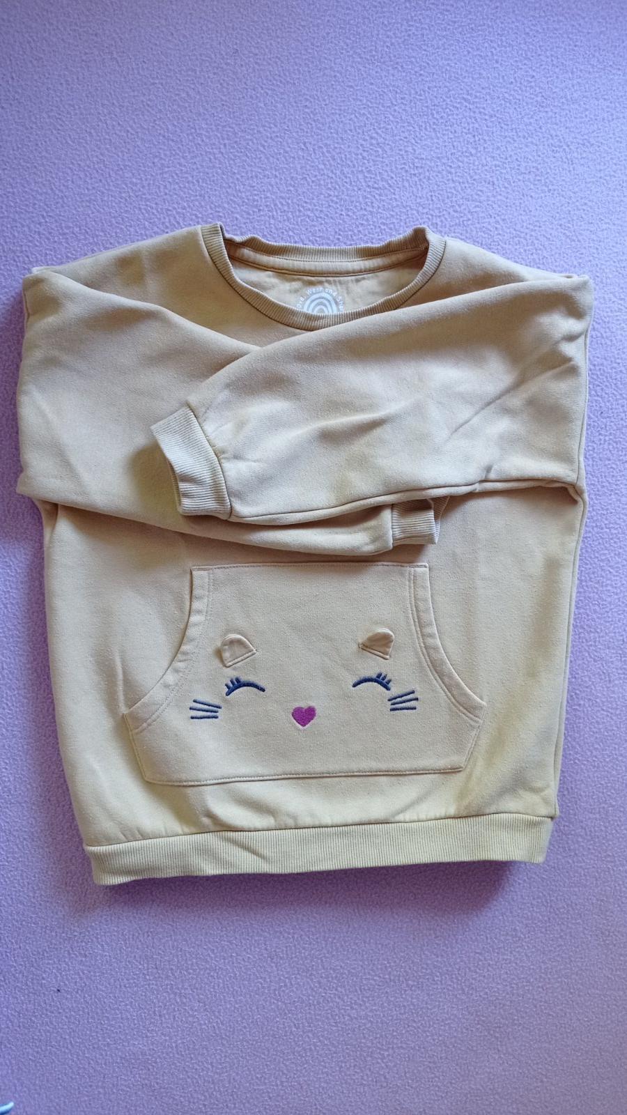 Krásna štýlová bledožltá bundičko-mikina s kapucňou, veľkosť písaná 128, ale sedí skôr na veľkosť 122 a pokojne aj 116 ako oversize. Je bledožltej bavlnenej farby kombinovanej s bielou šušťákovinou...
