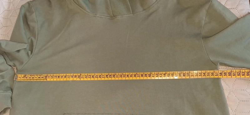 Real farba pekná šalviovo zelená ,prvé foto,zelenkavá nie sivá. Klokanie vrecko,zadný diel trochu dlhší ako predný. Oblečené 2x.
